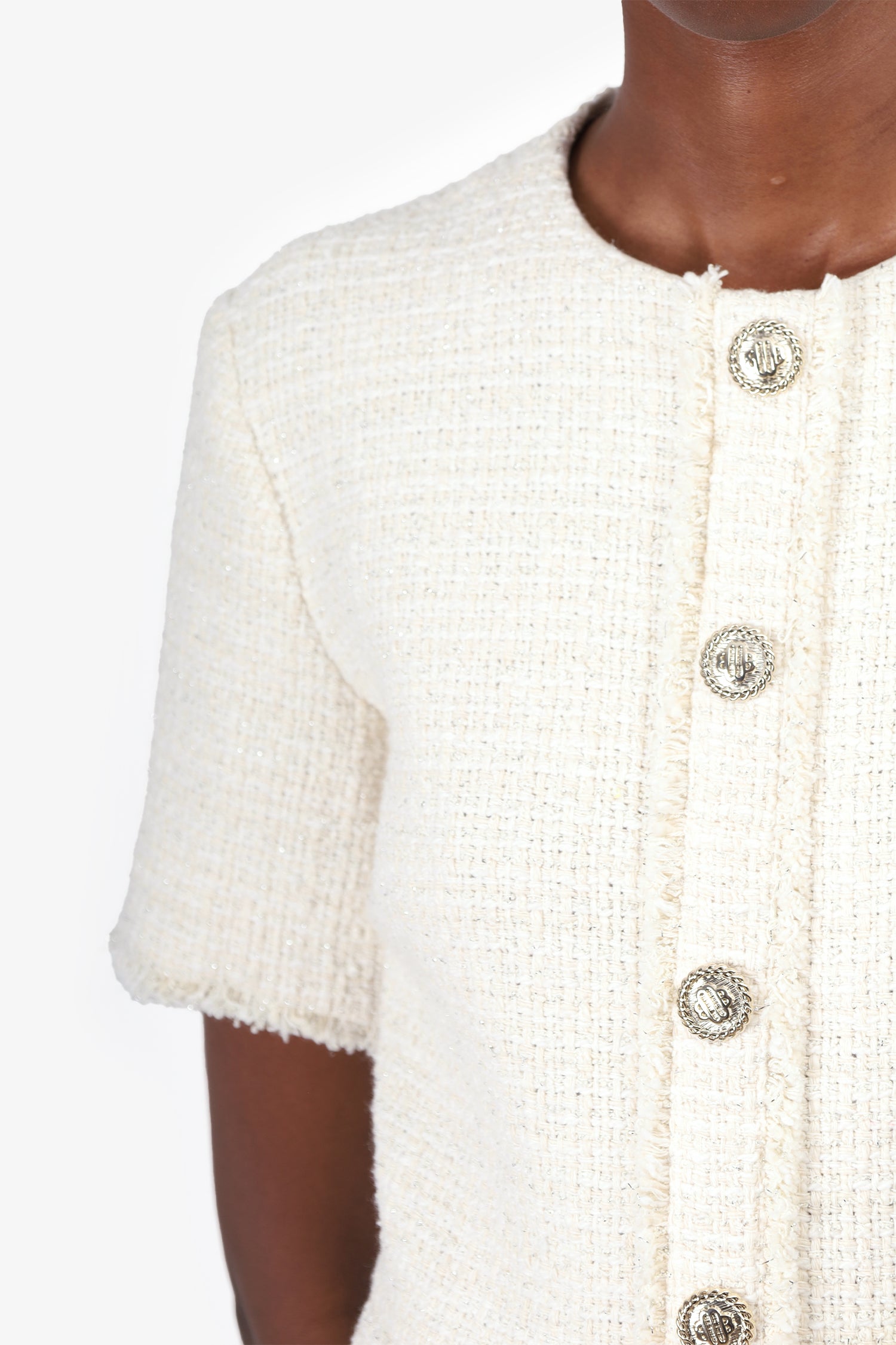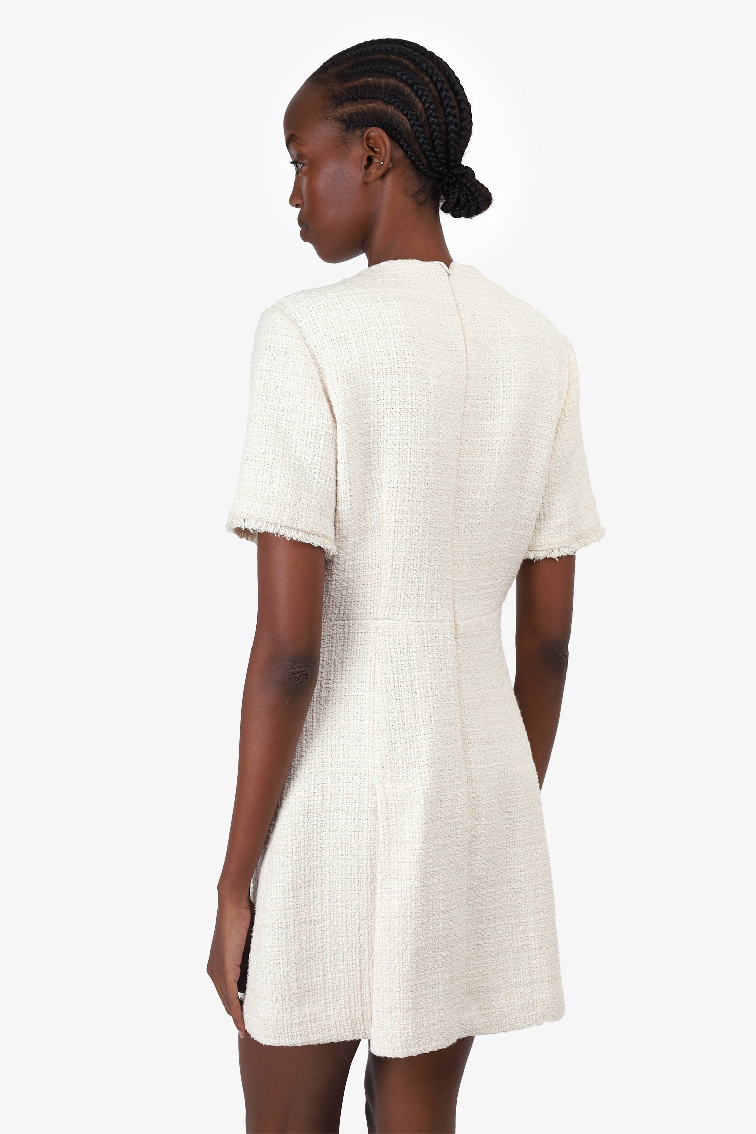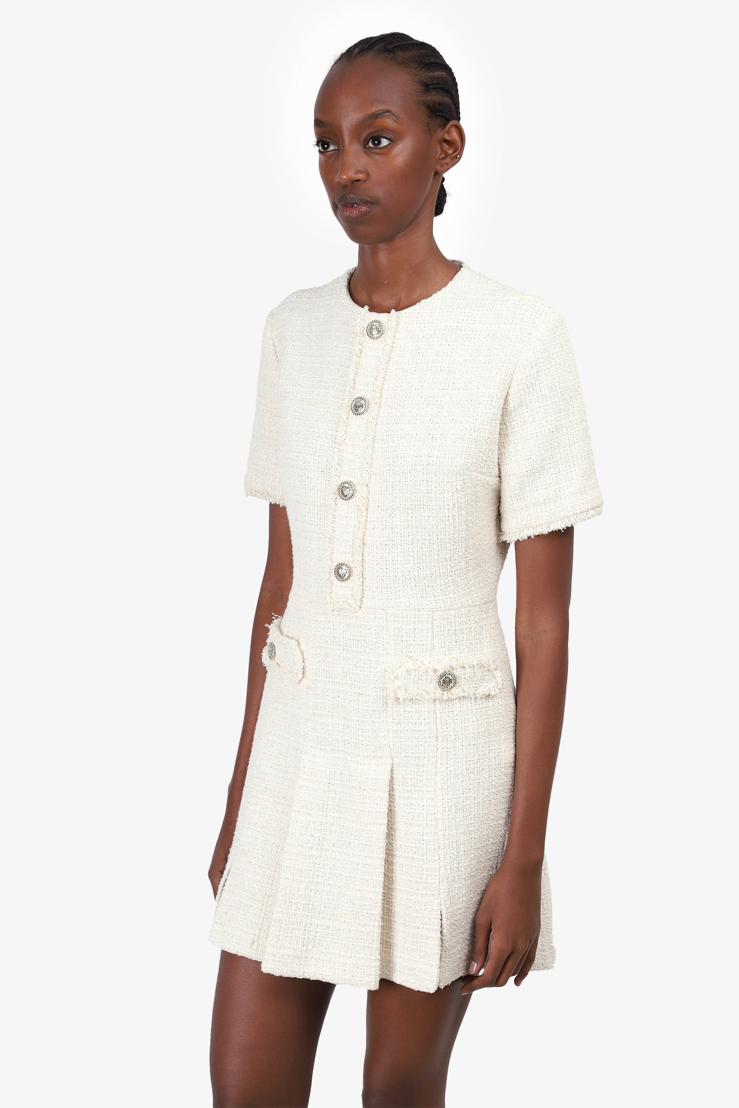 Refresh availabilityMaje White Tweed Button Down Mini Dress. Round neckline. Back zip closure. Faux button-down detail on front. 2 faux front pockets. Pleated skirt. Original tags intact.