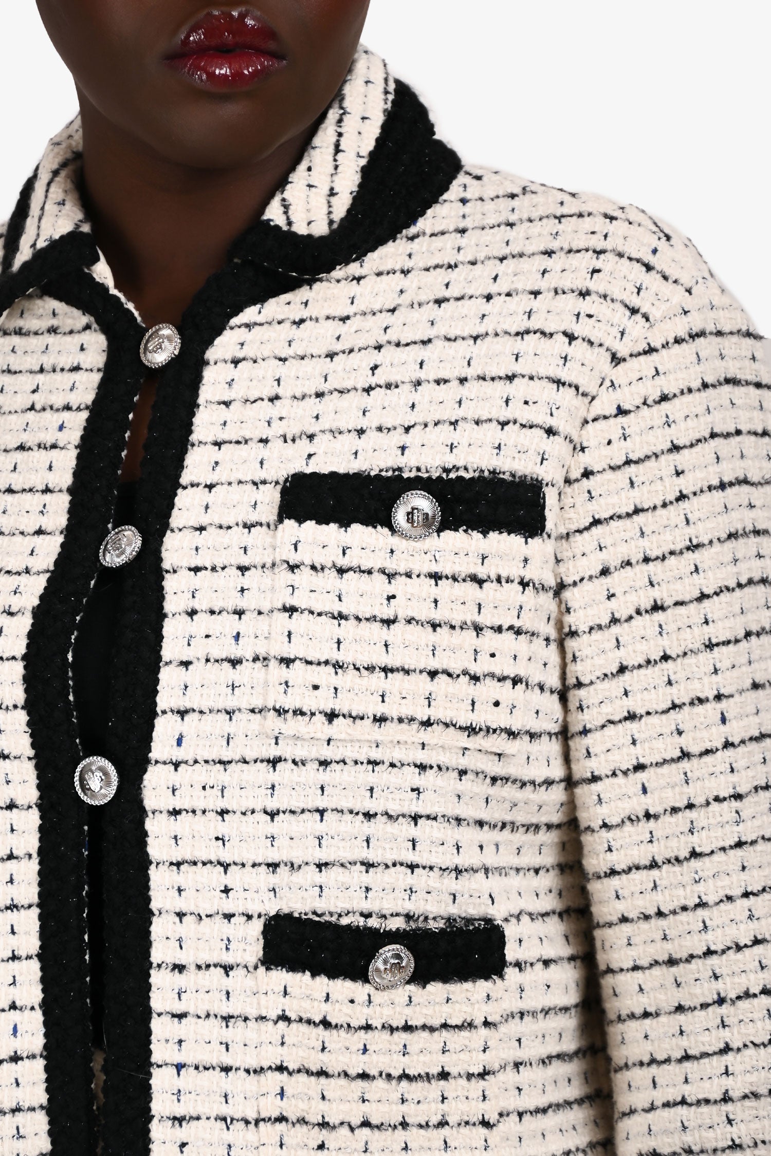 Refresh availabilityMaje White/Black Tweed Blazer + Shorts Set. Blazer: Slip-on. Removable Collared neckline. Front button closure. Cuffs with button-up detail. 4 exterior slip pockets with button detail. Shorts: Front zip and hook closure. Waistband with belt loops. 2 front exterior slip pockets. 2 rear exterior slip pockets. Both pieces are unlined with silver-tone hardware and tonal stitching.