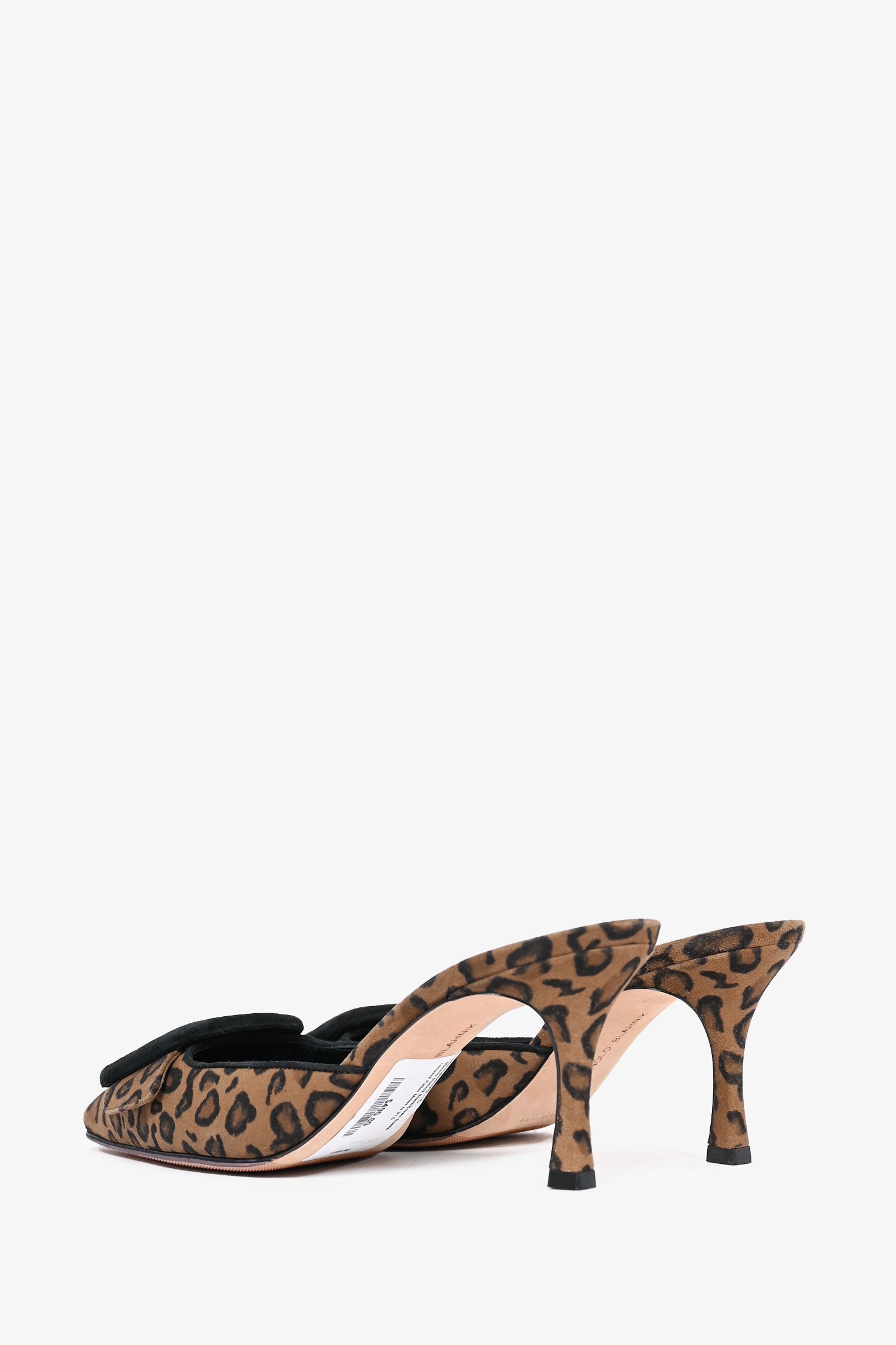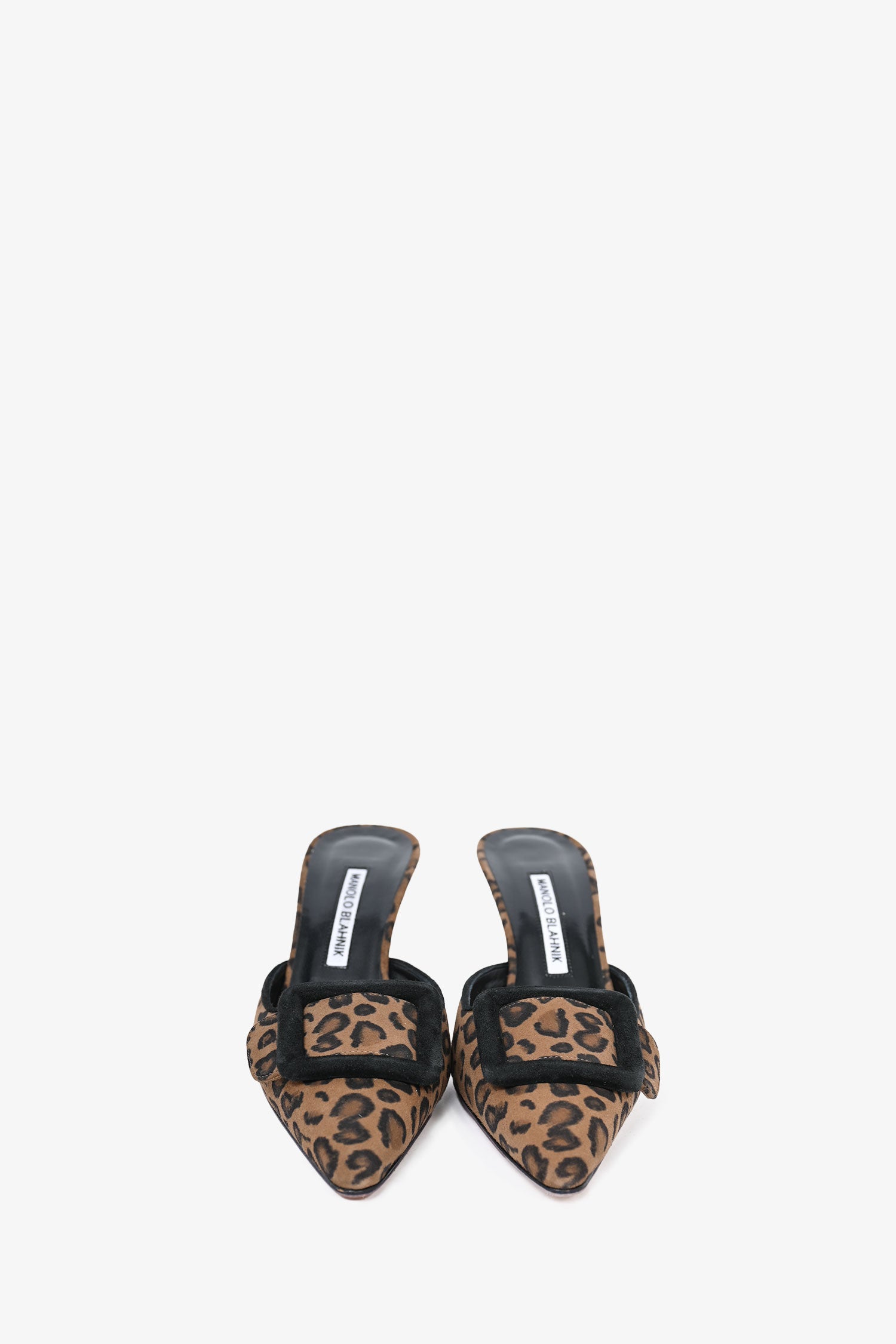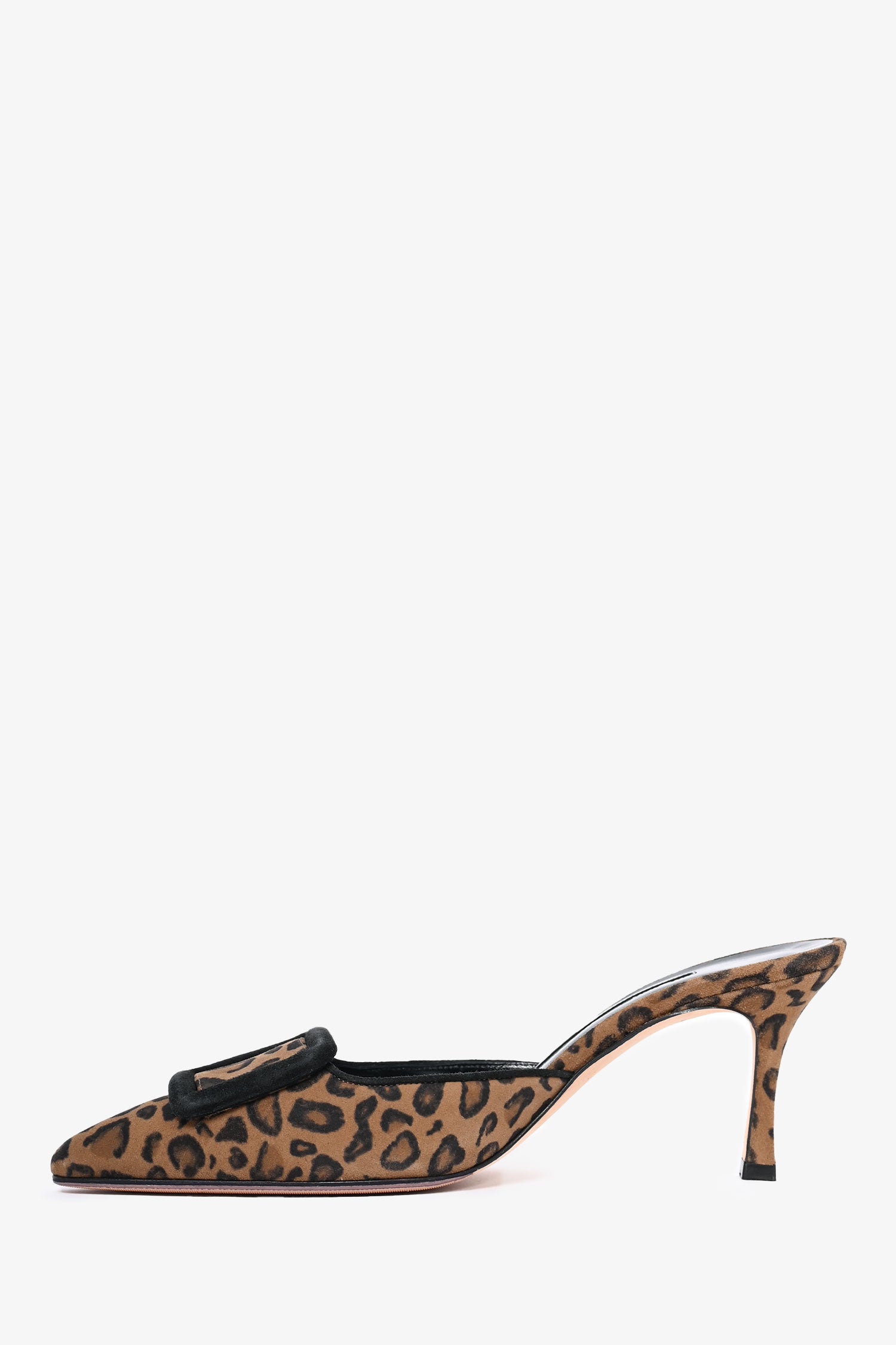 Refresh availabilityManolo Blahnik Black/Brown Suede Leopard Patter Mules. Slip-on. Pointed toe. Buckle detail at the upper. Topy soles.