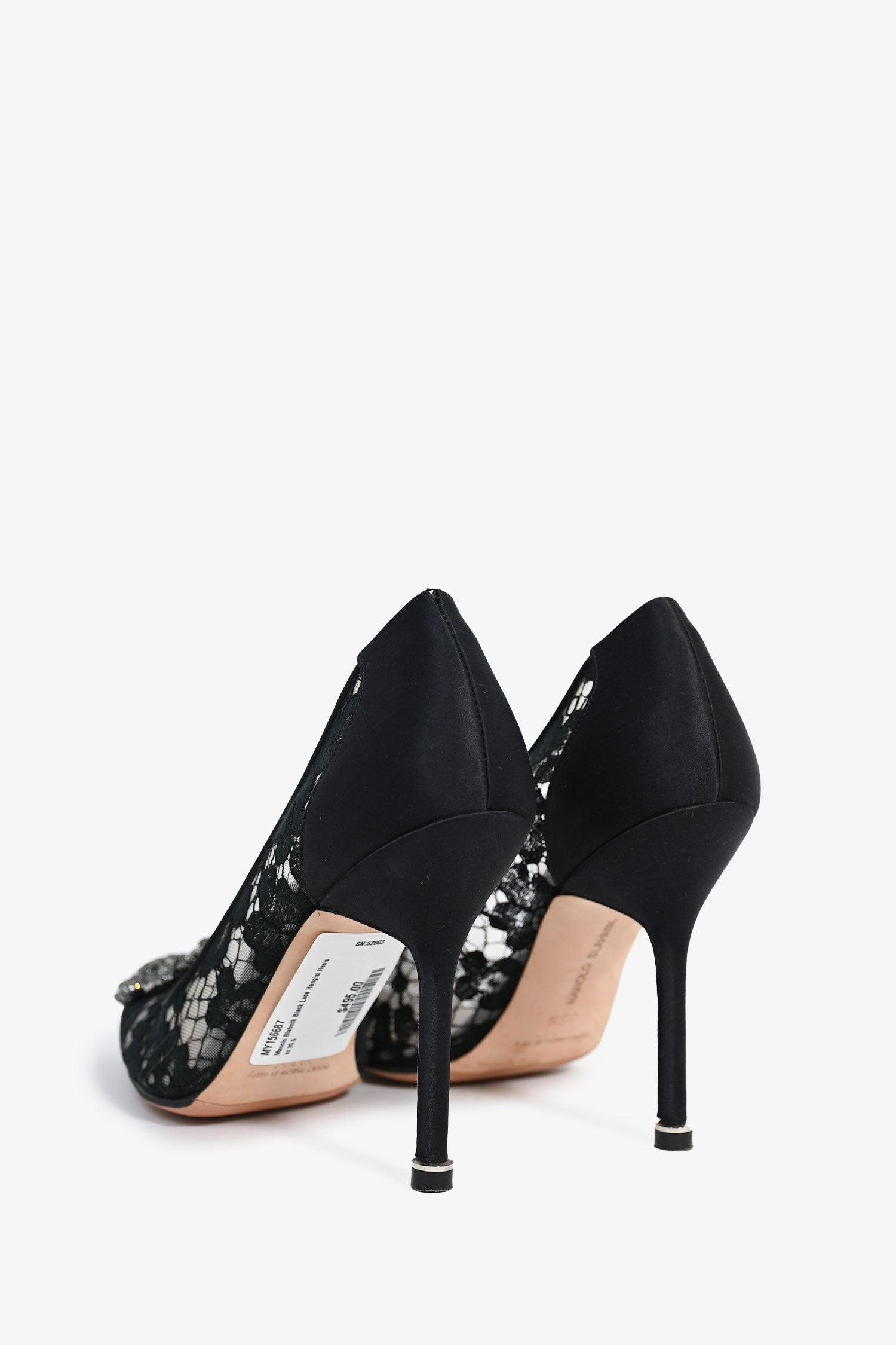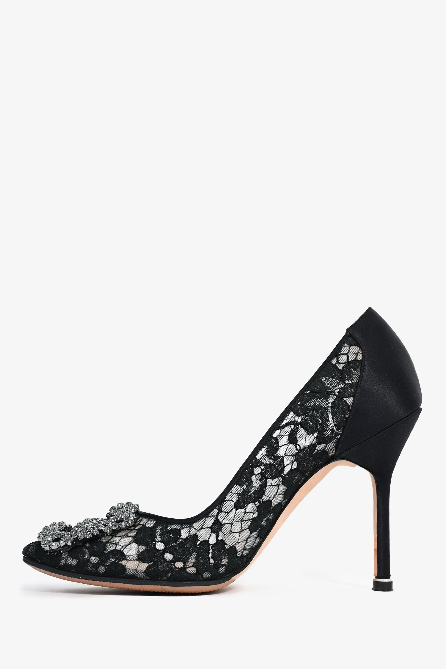 Refresh availabilityManolo Blahnik Black Lace Hangisi Heels. Pointed toe. Slip-on. Crystal details. Topy soles. Tonal stitching.