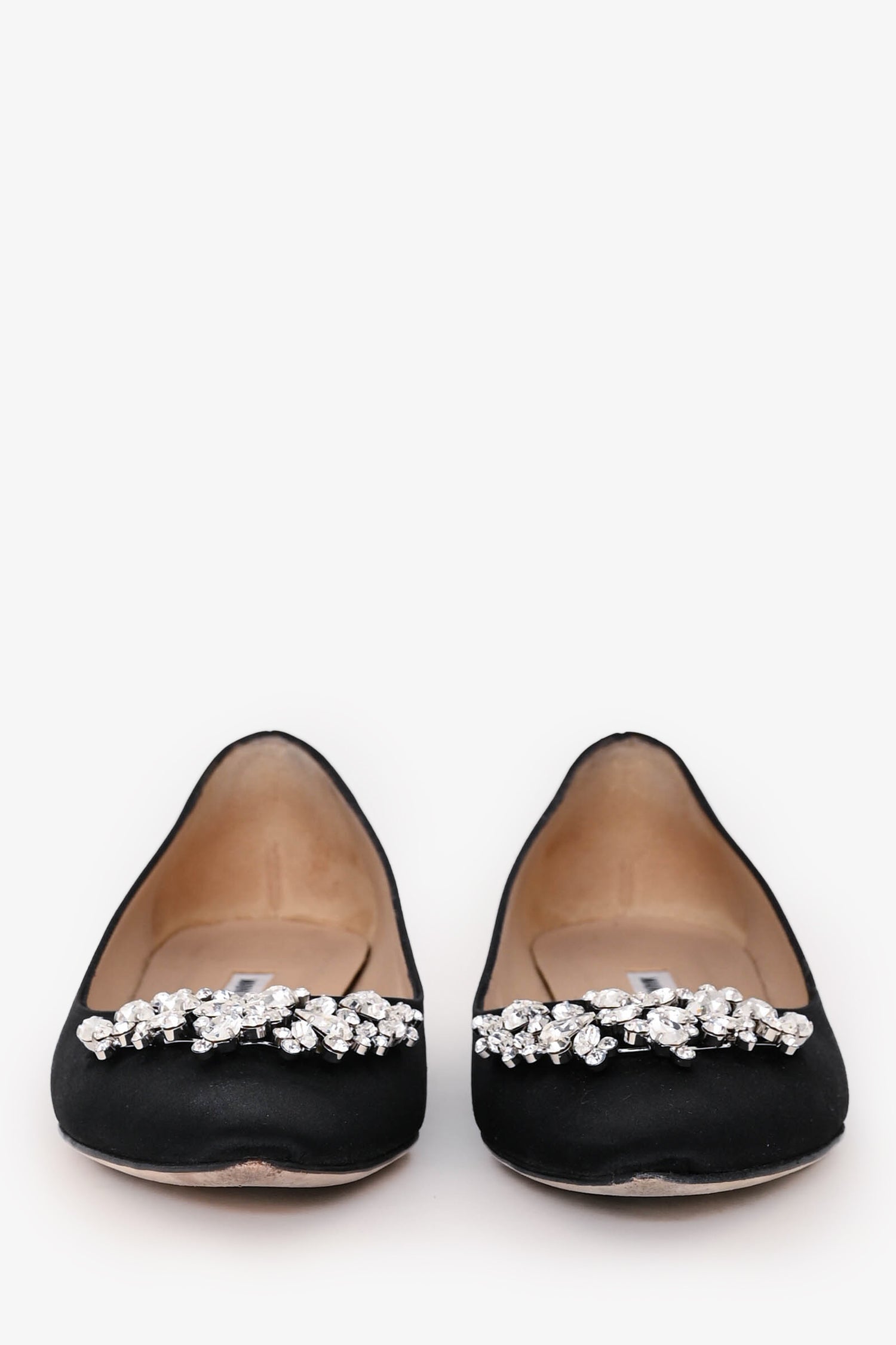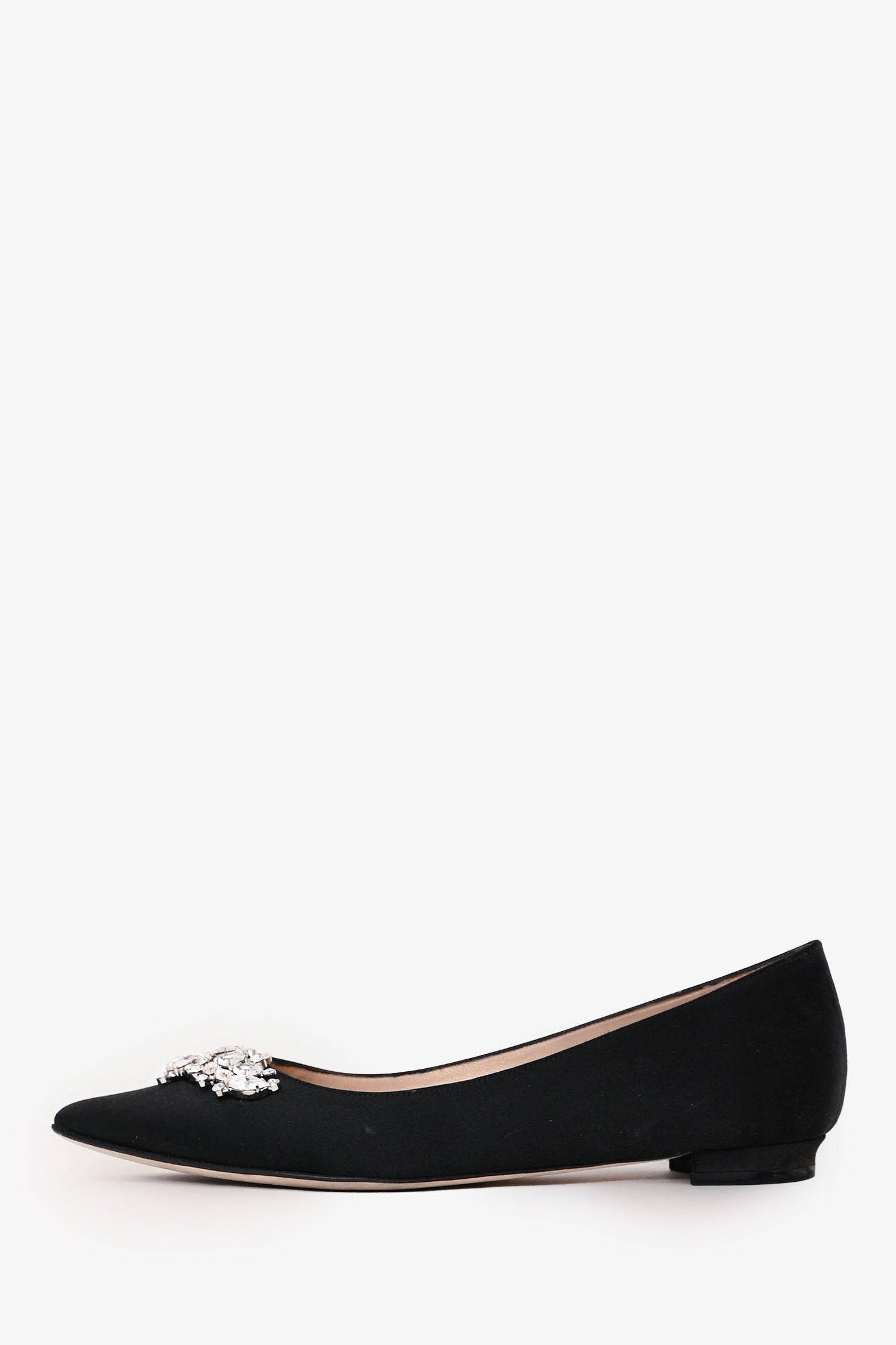 Refresh availabilityManolo Blahnik Black Satin Crystal Embellished Flats. Pointed toe. Leather insole and interior with suede backing. Tonal stitching.