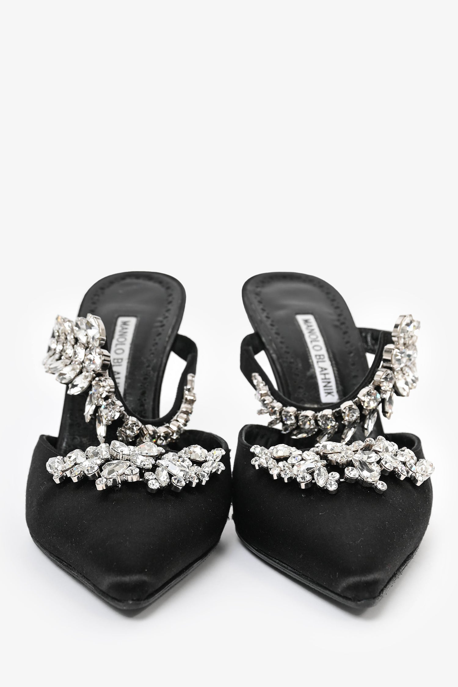 Refresh availabilityManolo Blahnik Black Satin Crystal Embellished 'LURUM' Heels. Satin covered exterior and stiletto heel. Leather insole. Tonal stitching.