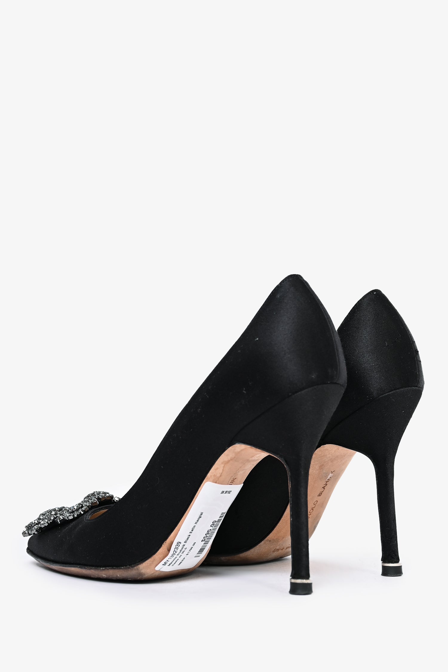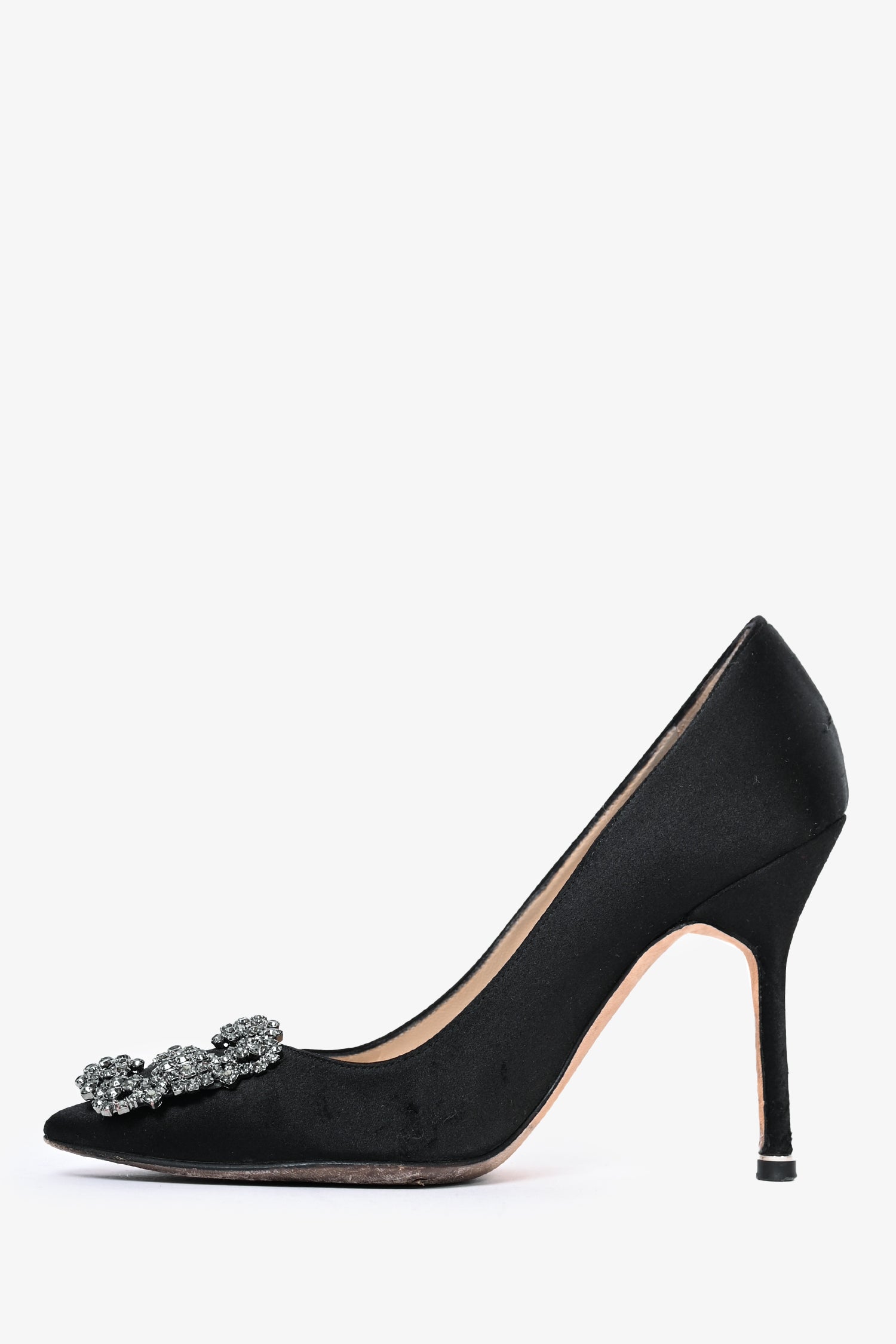 Refresh availabilityManolo Blahnik Black Satin Hangisi Heels. Stiletto heel. Pointed toe.
