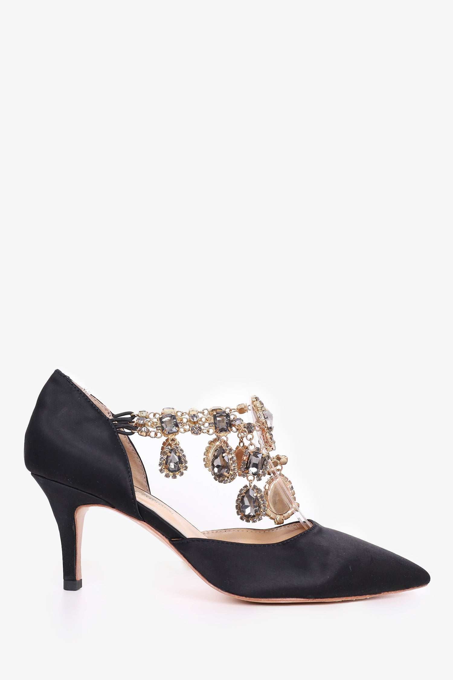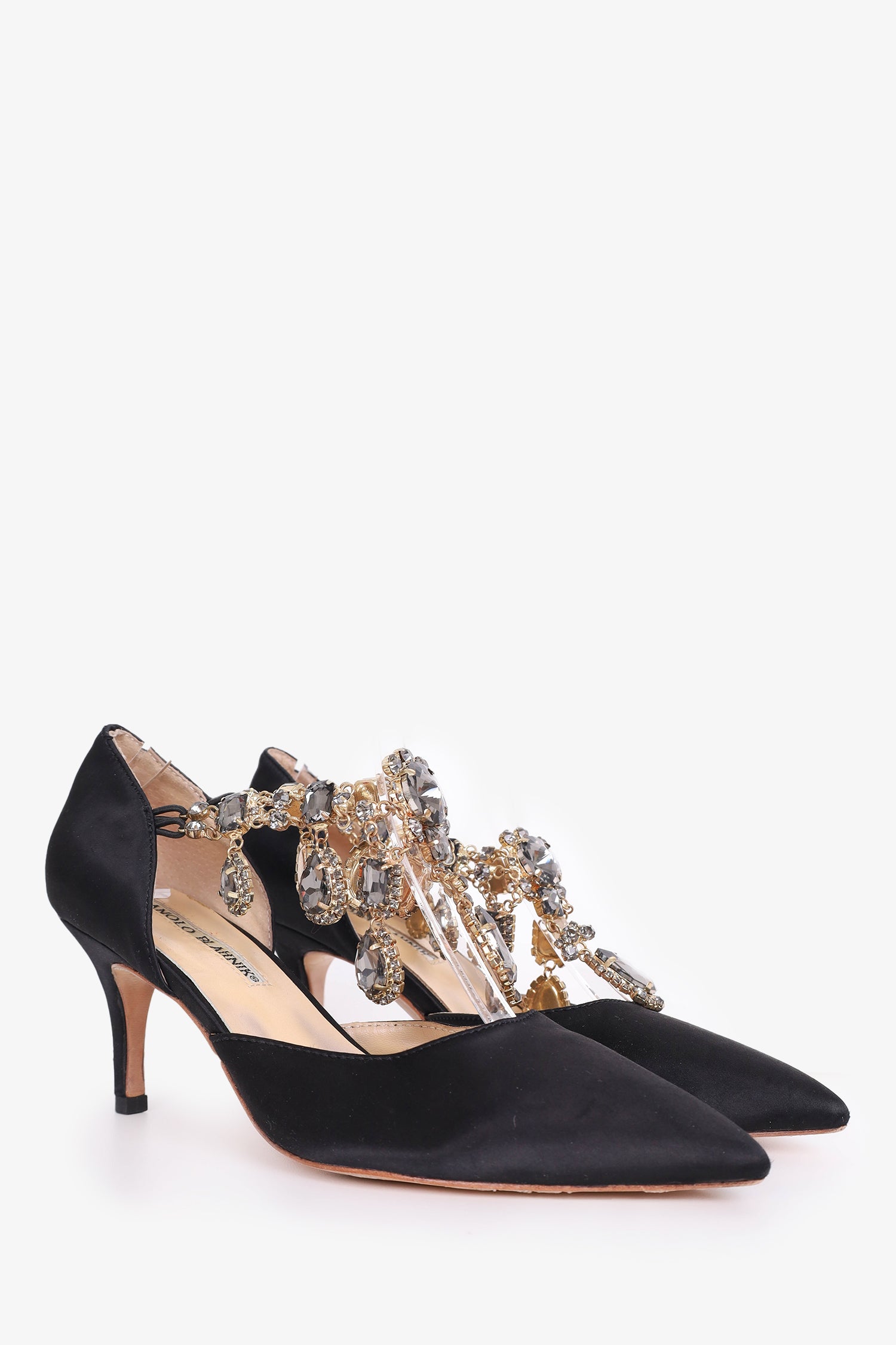 Refresh availabilityManolo Blahnik Black Satin Zullin Crystal Jeweled D'orsay Pumps. Slip-on. Jewelled chain around ankle. Pointed toe. Tonal stitching.