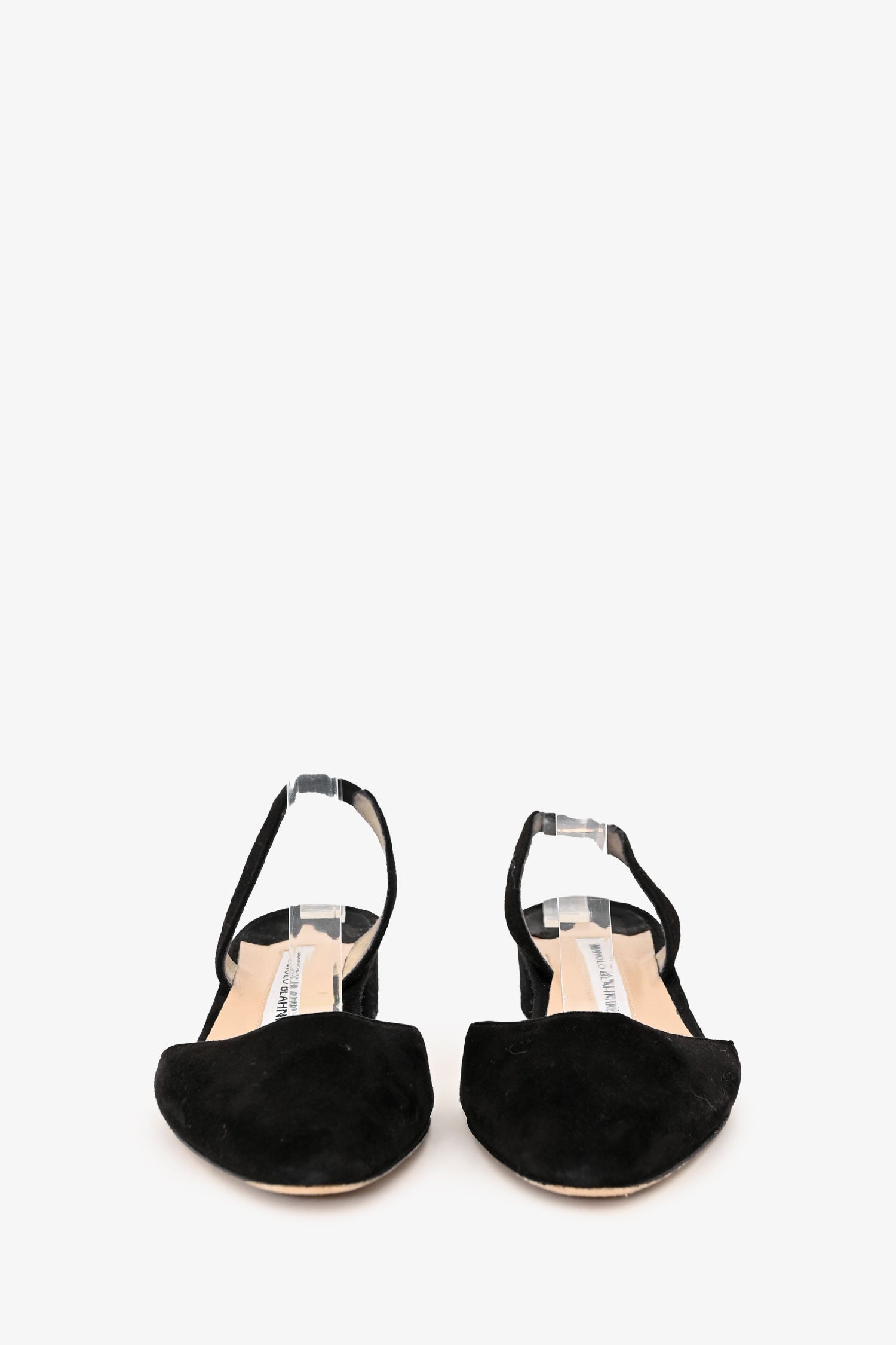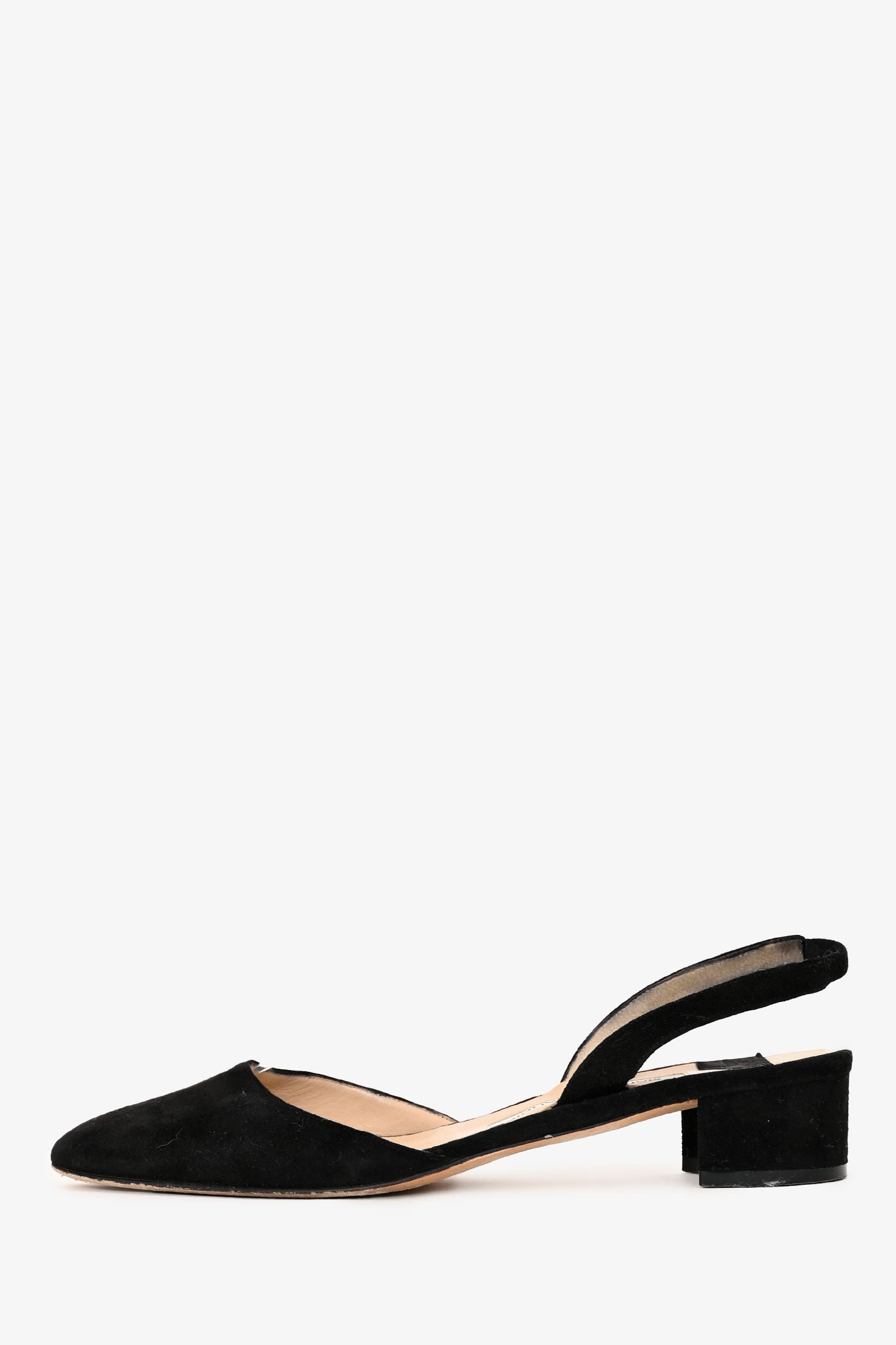 Refresh availabilityManolo Blahnik Black Suede Leather Slingback Heels. Slip-on. Almond toe. Block heel. Tonal stitching.