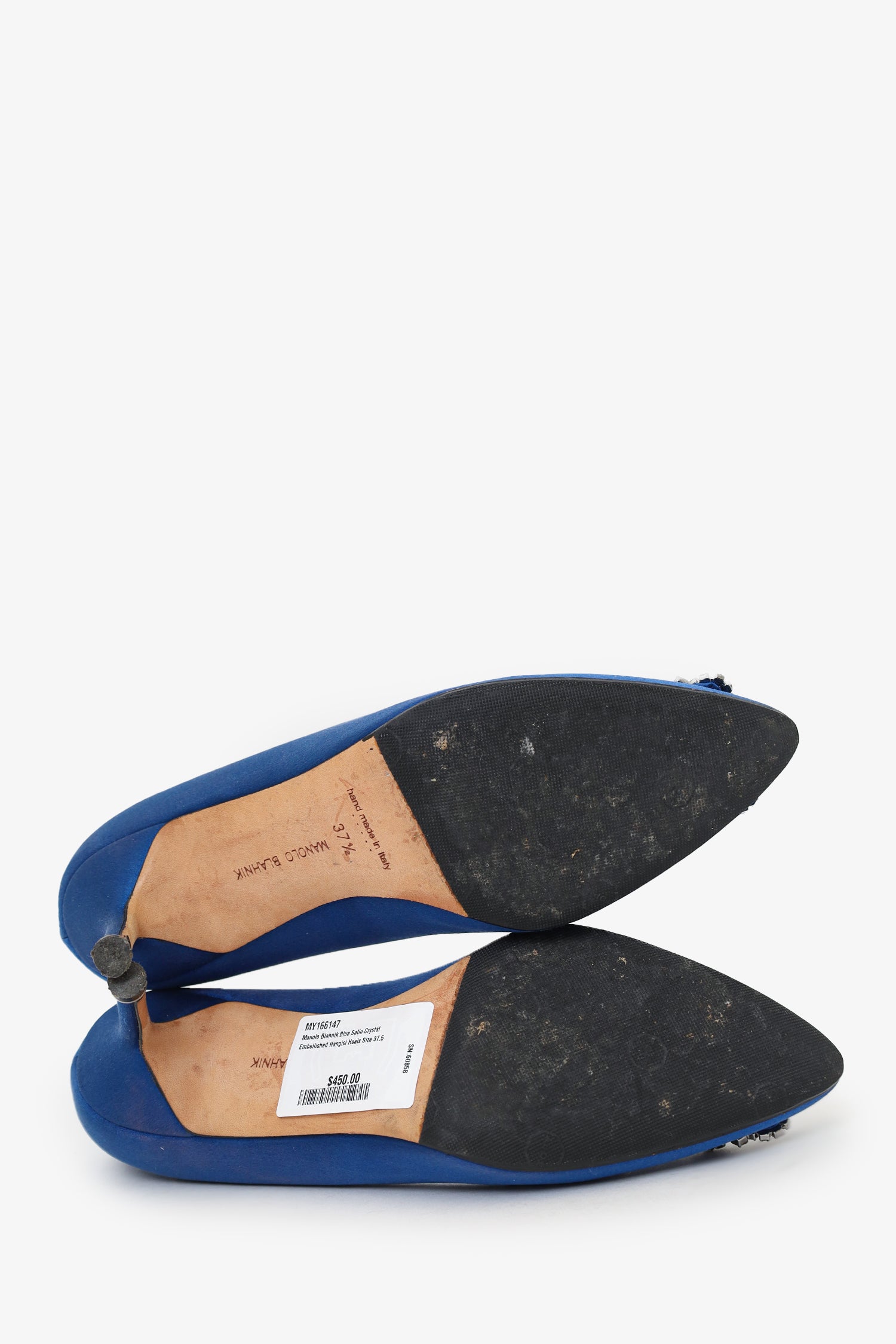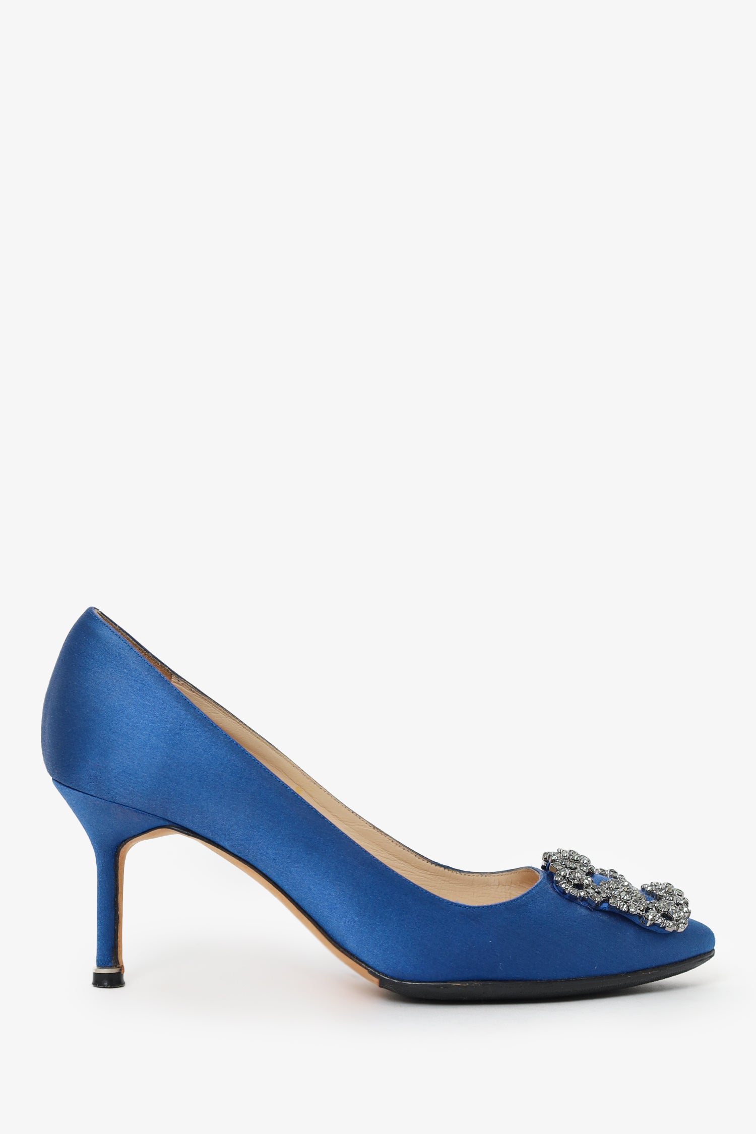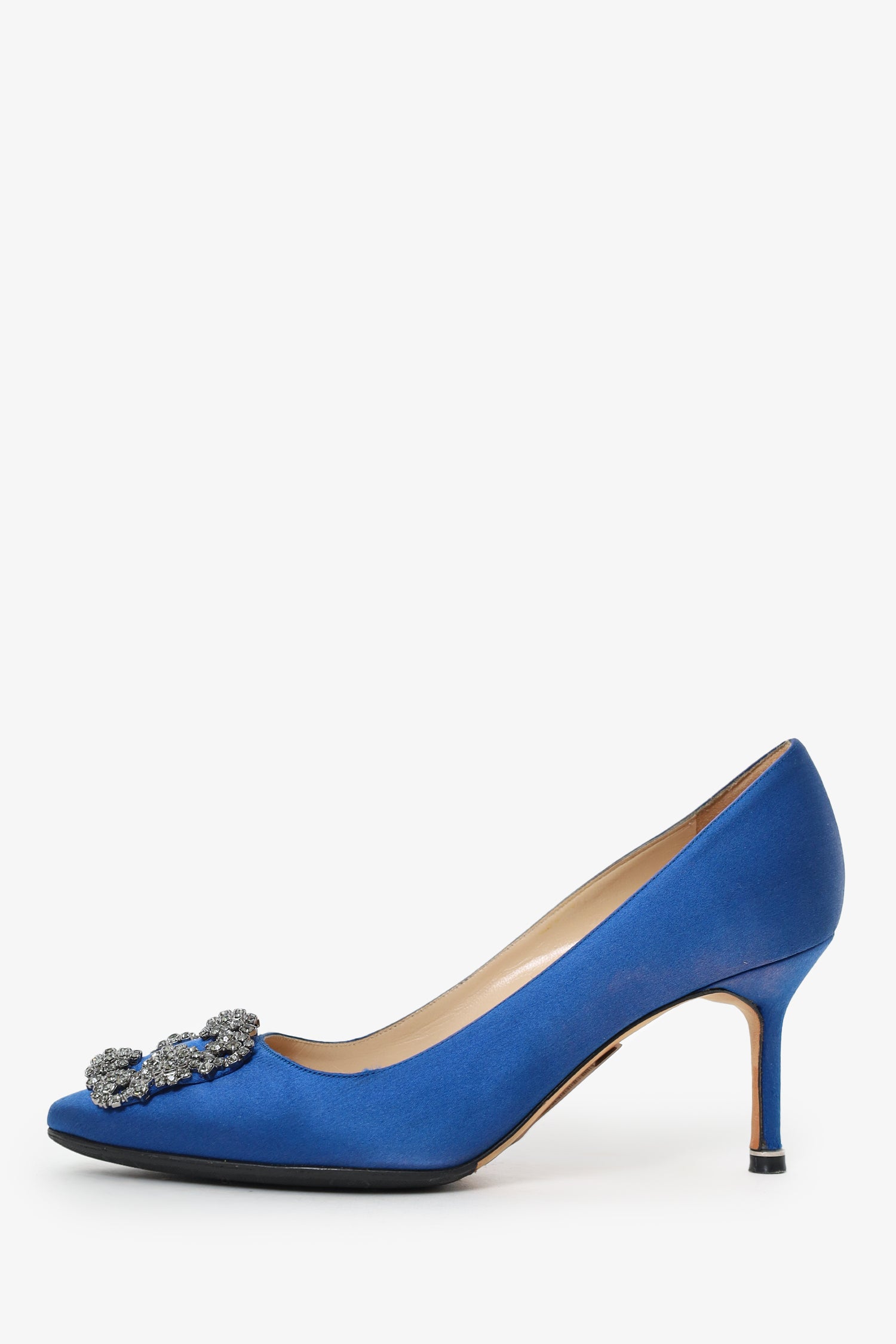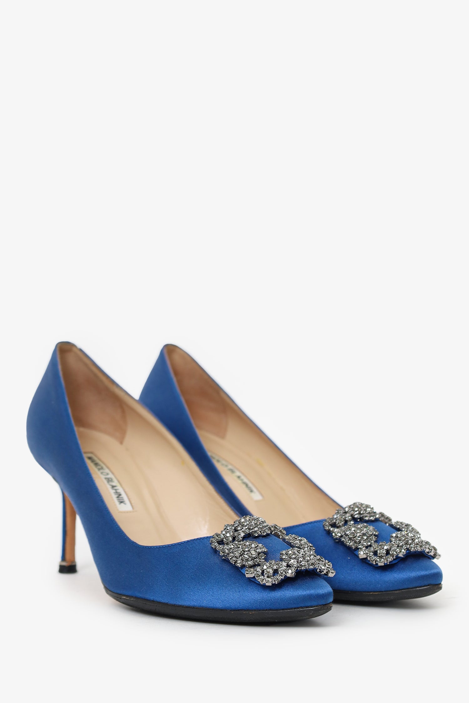 Refresh availabilityManolo Blahnik Blue Satin Crystal Embellished Hangisi Heels. Slip-on. Pointed-toe. Silver-tone hardware. Tonal stitching.