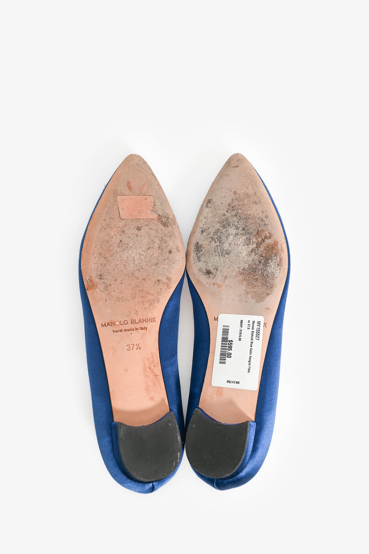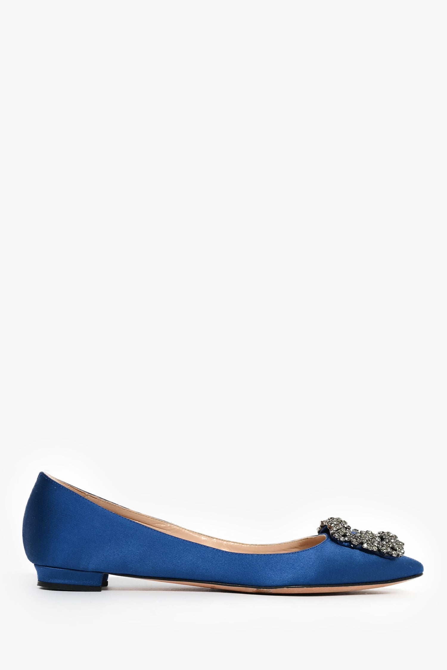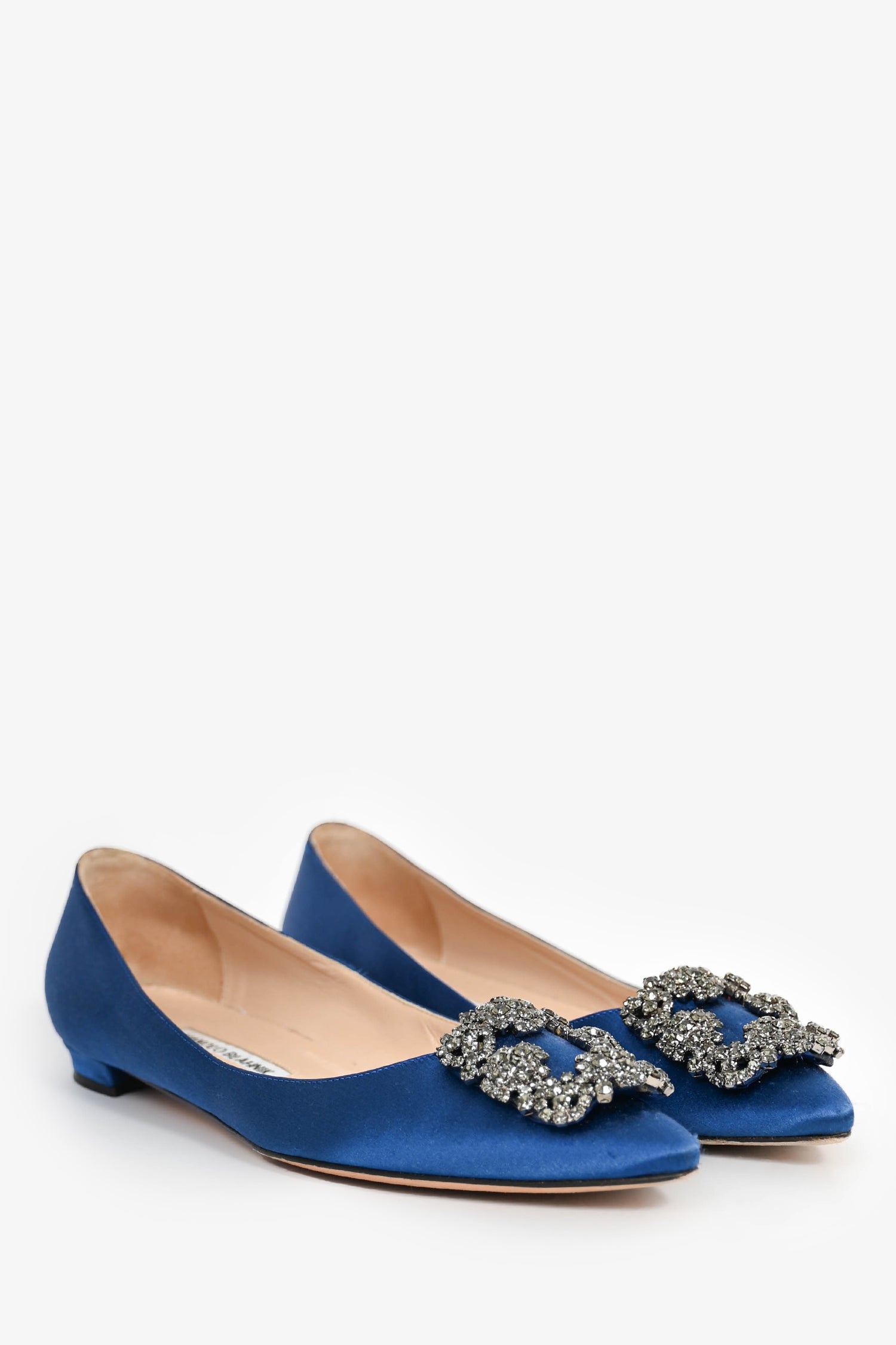 Refresh availabilityManolo Blahnik Blue Satin Hangisi Flats. Pointed-toe. Slip-on. Crystal details at the toe. Silver-tone hardware. Tonal stitching.