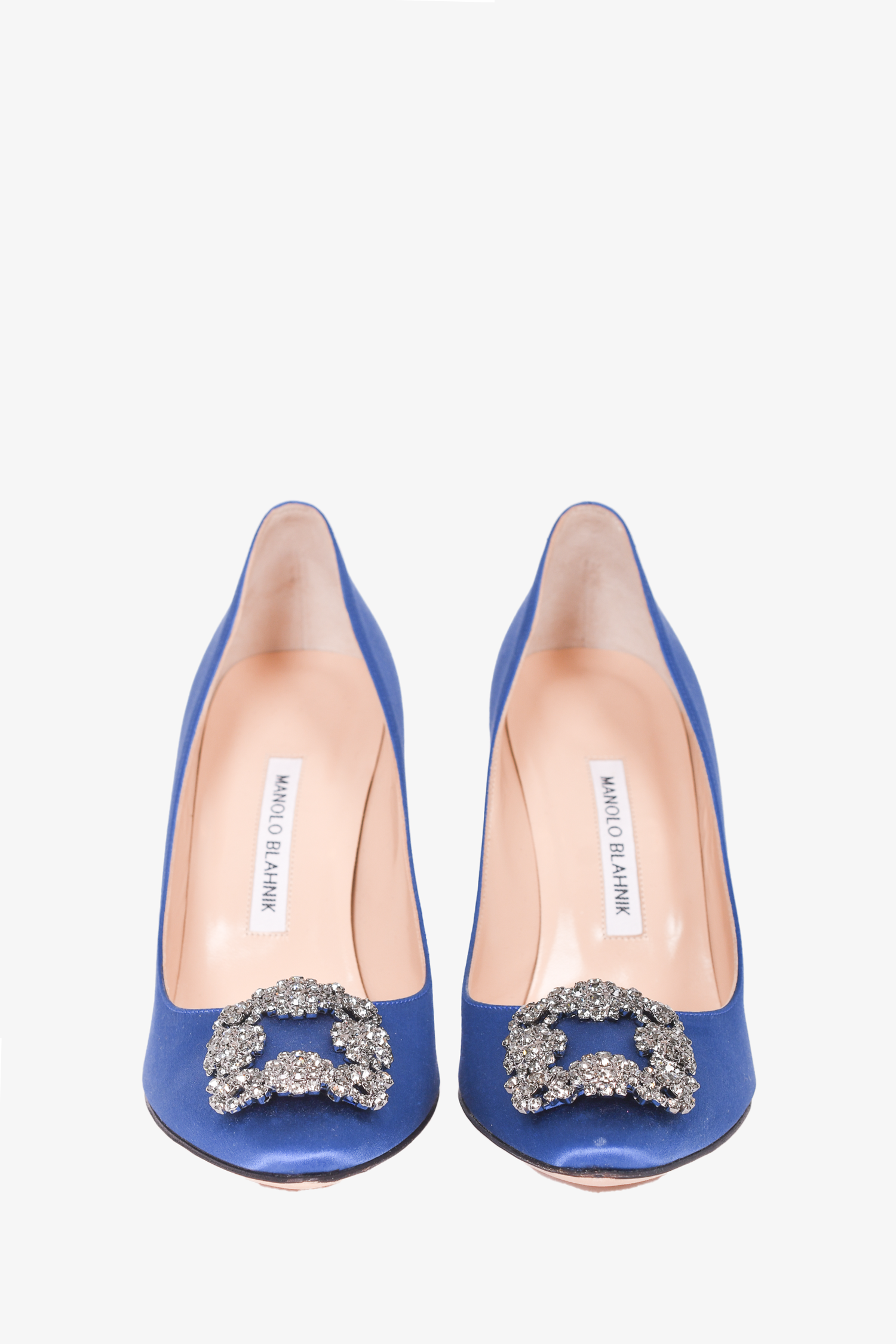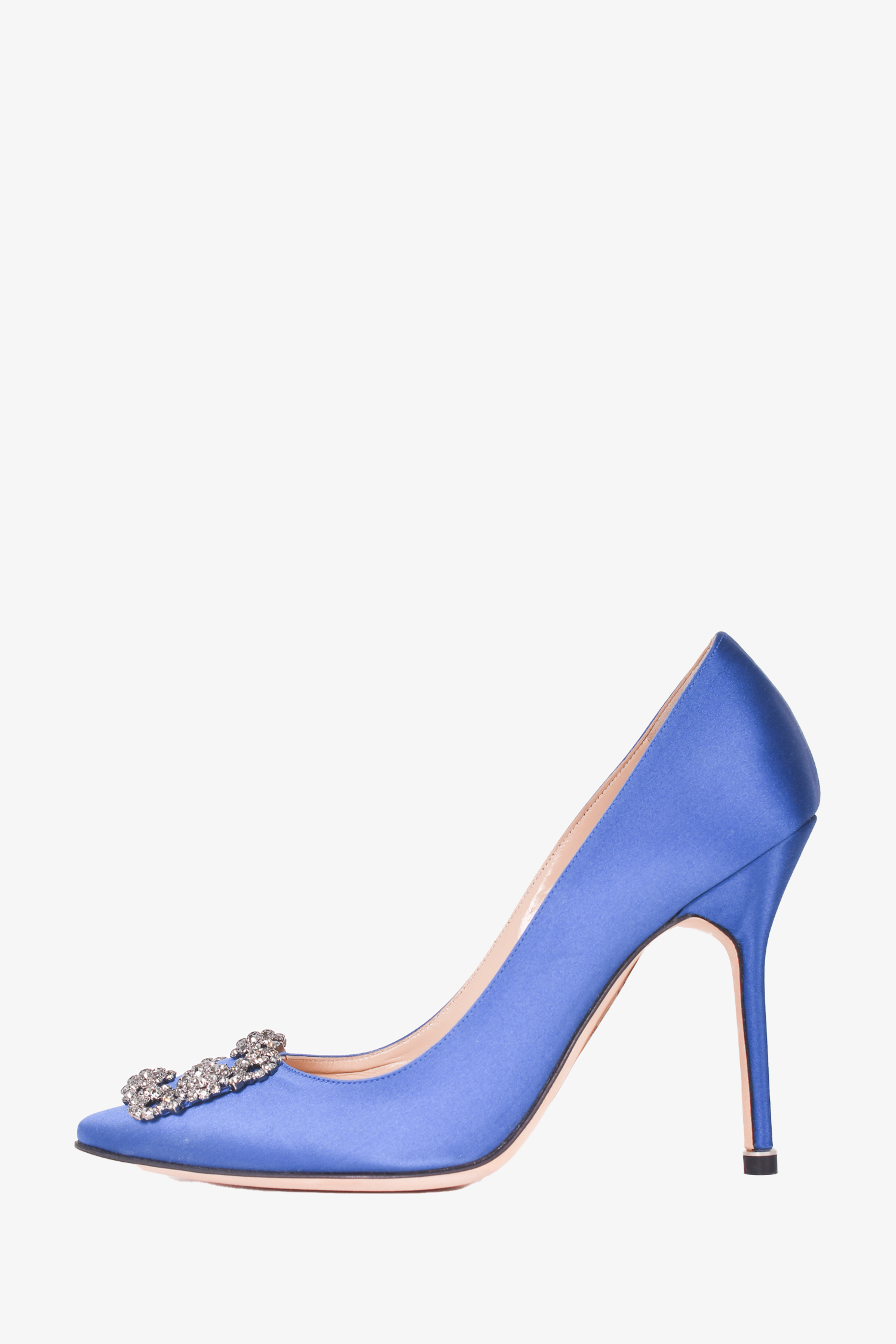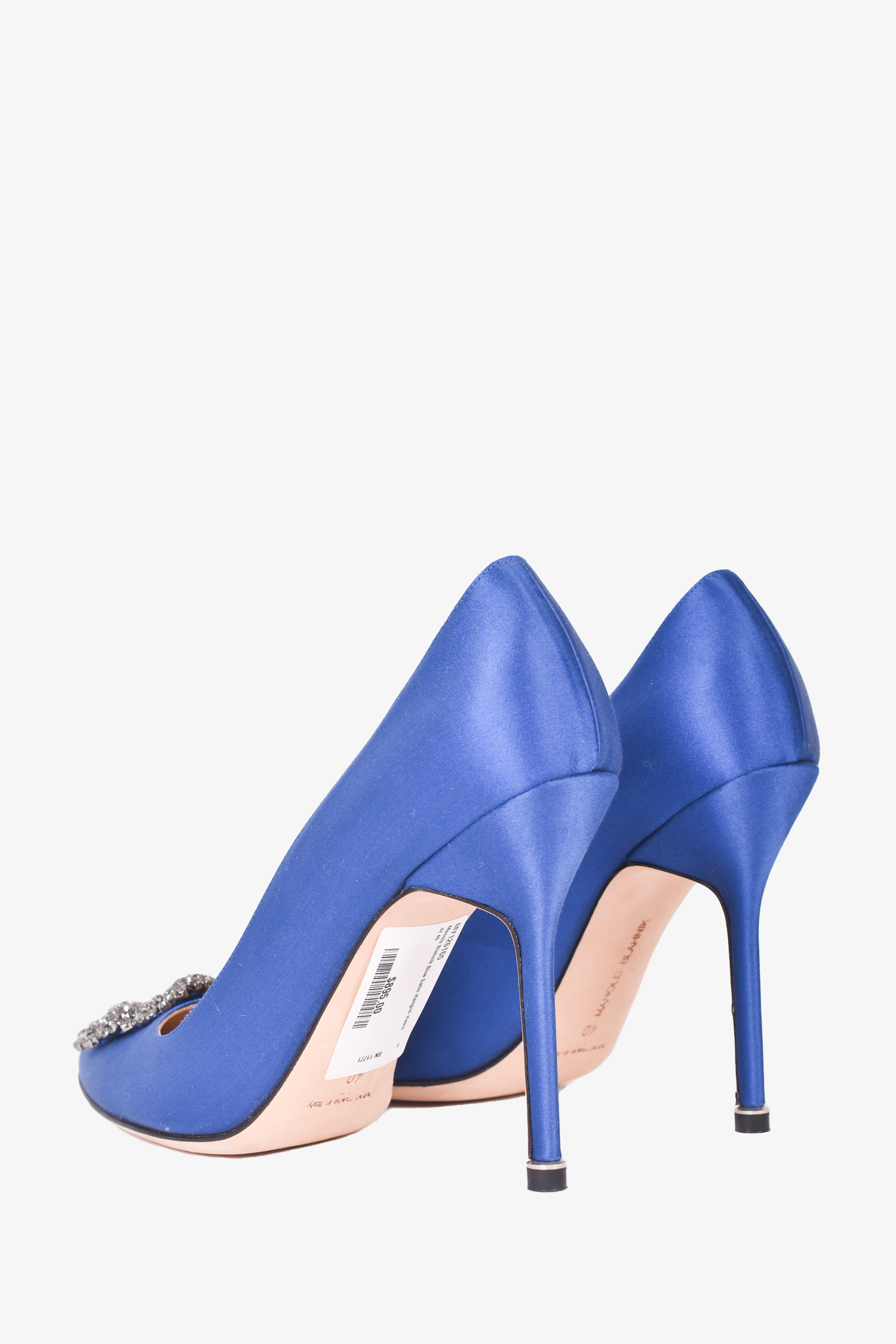 Refresh availabilityManolo Blahnik Blue Satin Hangisi Heels. Almond toe. Embellished buckle detail at the upper. Slip-on. Tonal stitching.