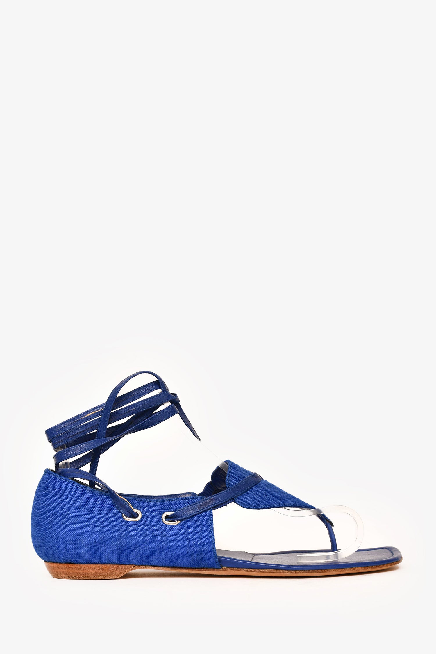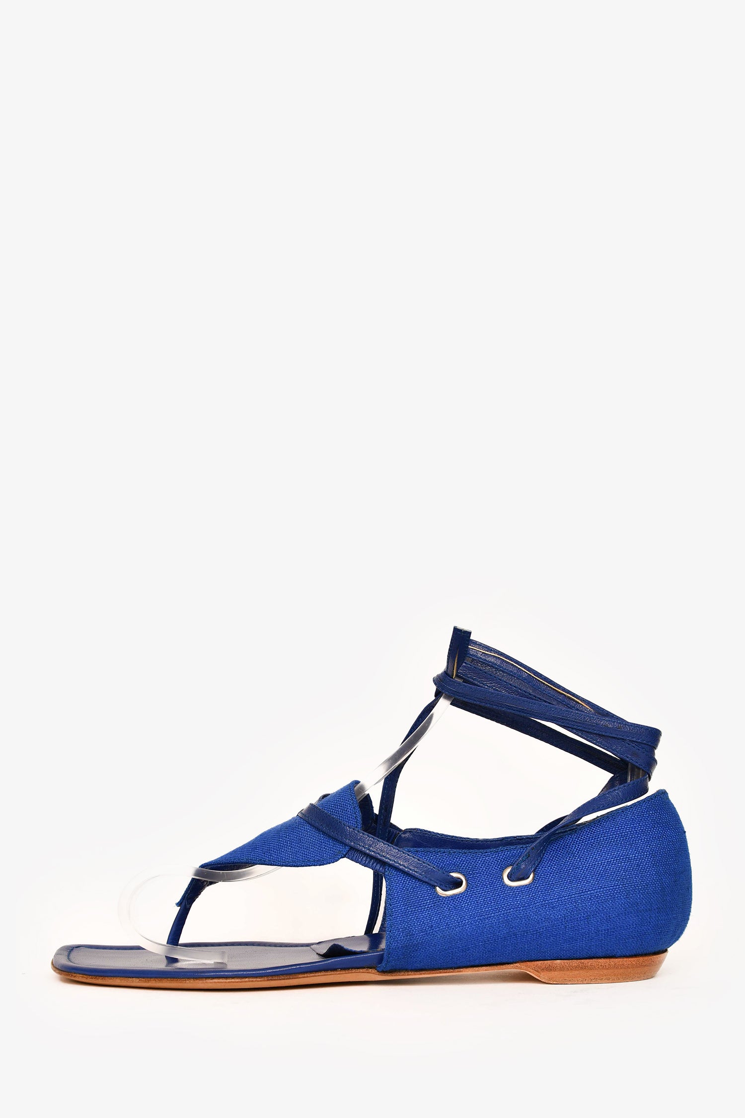 Refresh availabilityManolo Blahnik Blue Suede/Leather Lace Up Sandals. Open-toe design. Wraparound lace-up ankle ties. Tonal stitching.
