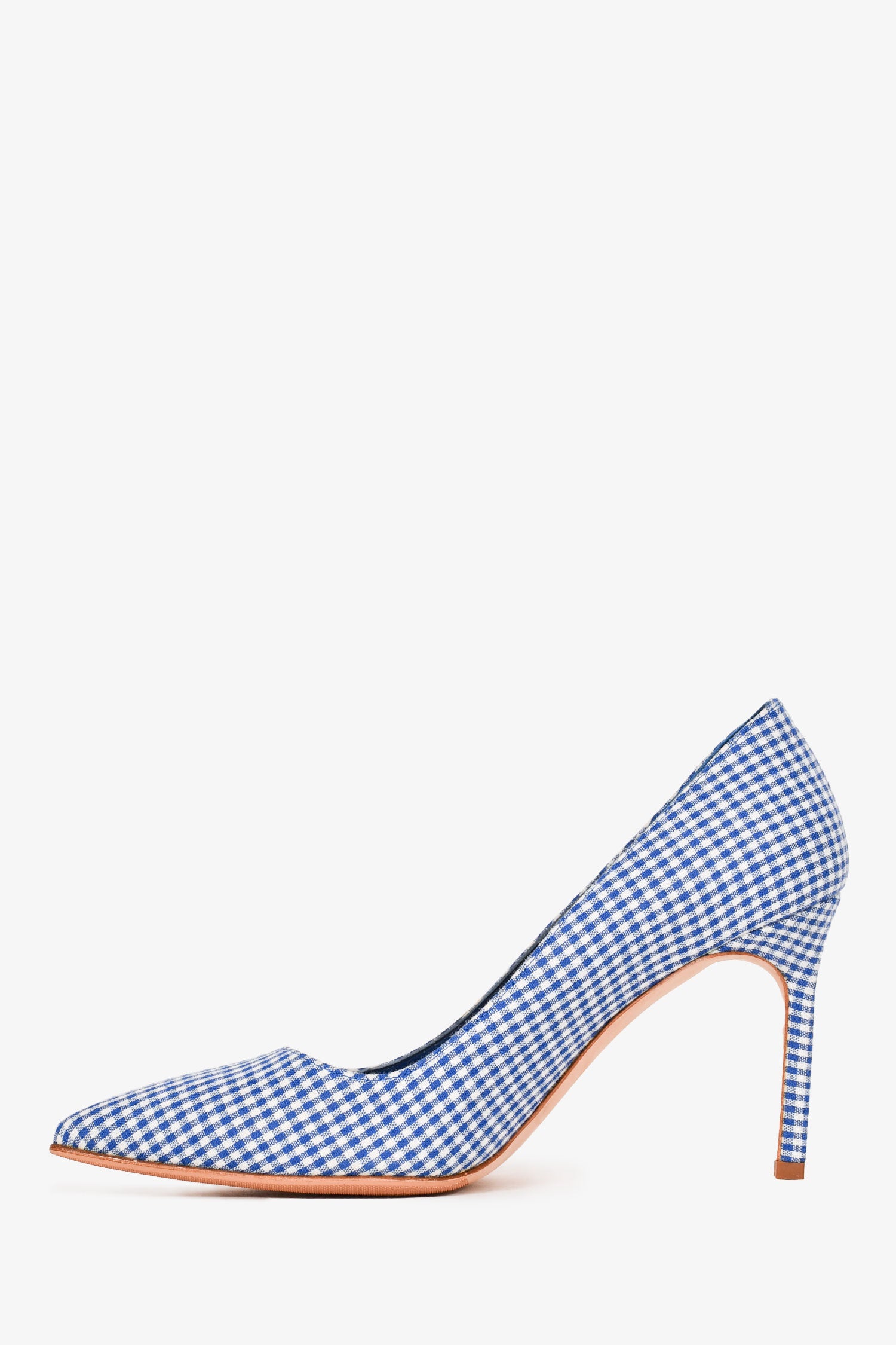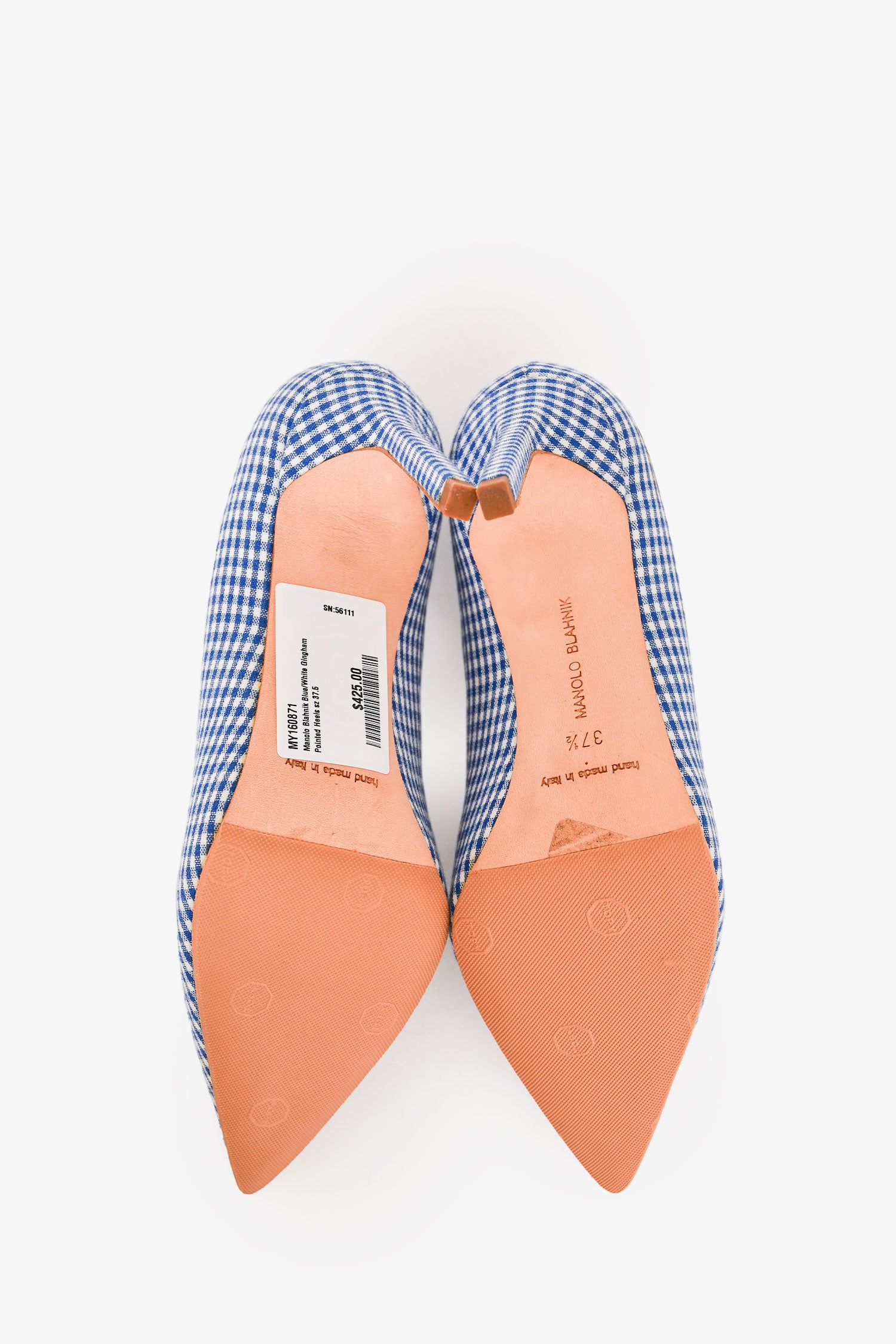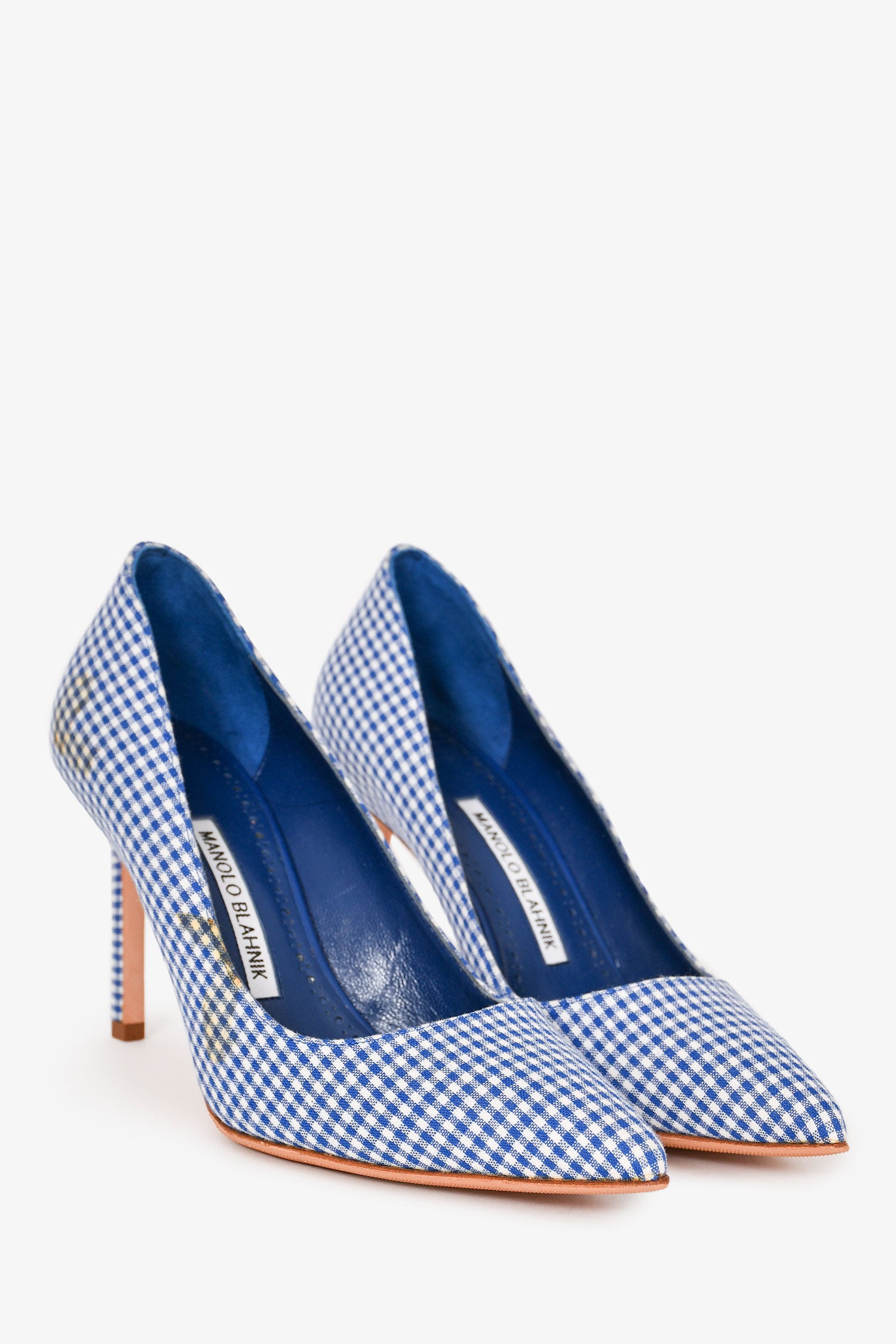 Refresh availabilityManolo Blahnik Blue/White Gingham Pointed Heels. Slip-on style. Pointed toe. Stiletto heel. Tonal stitching.