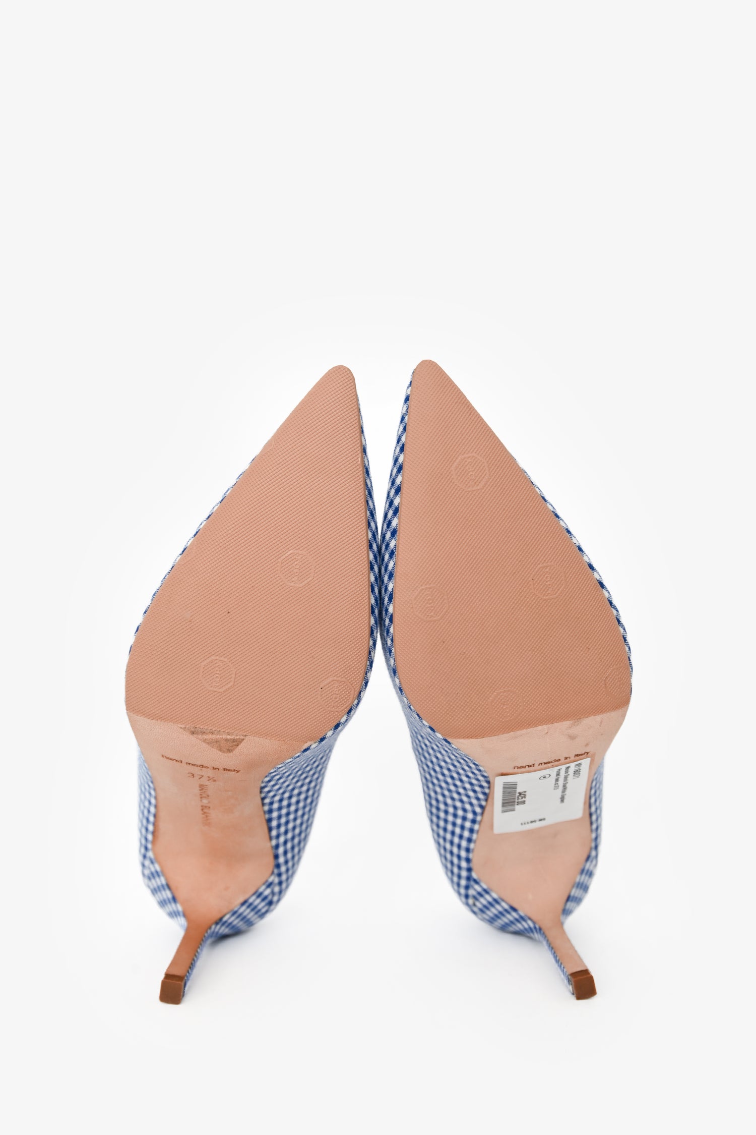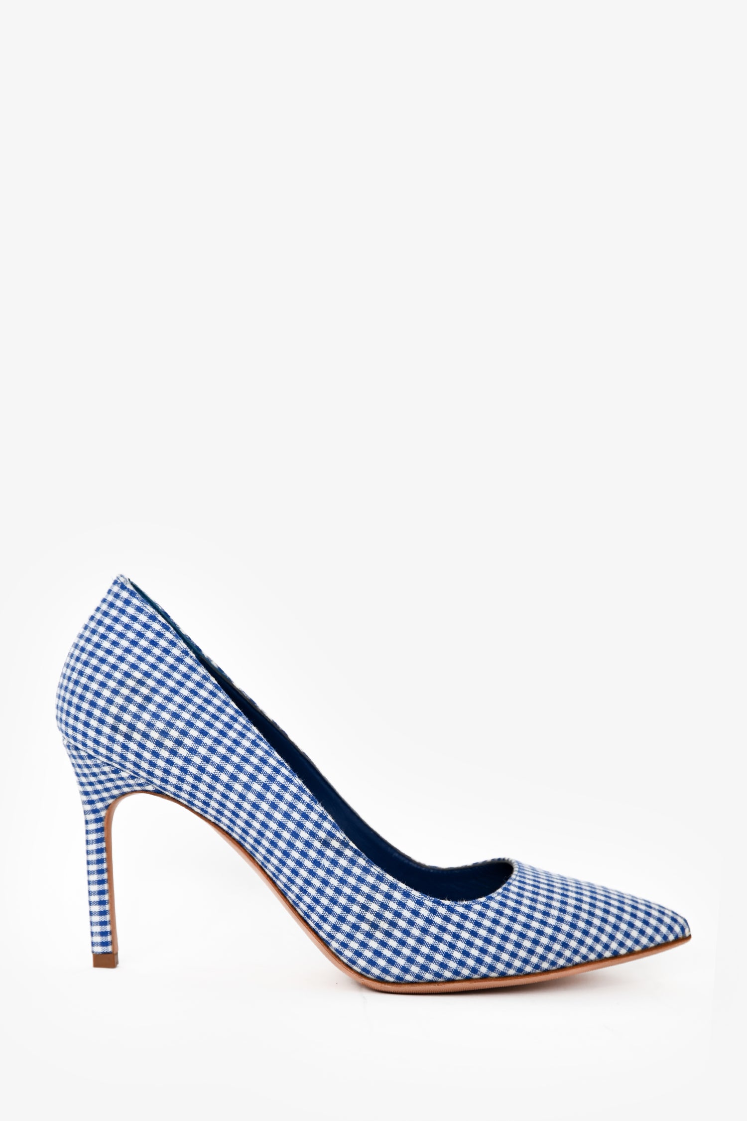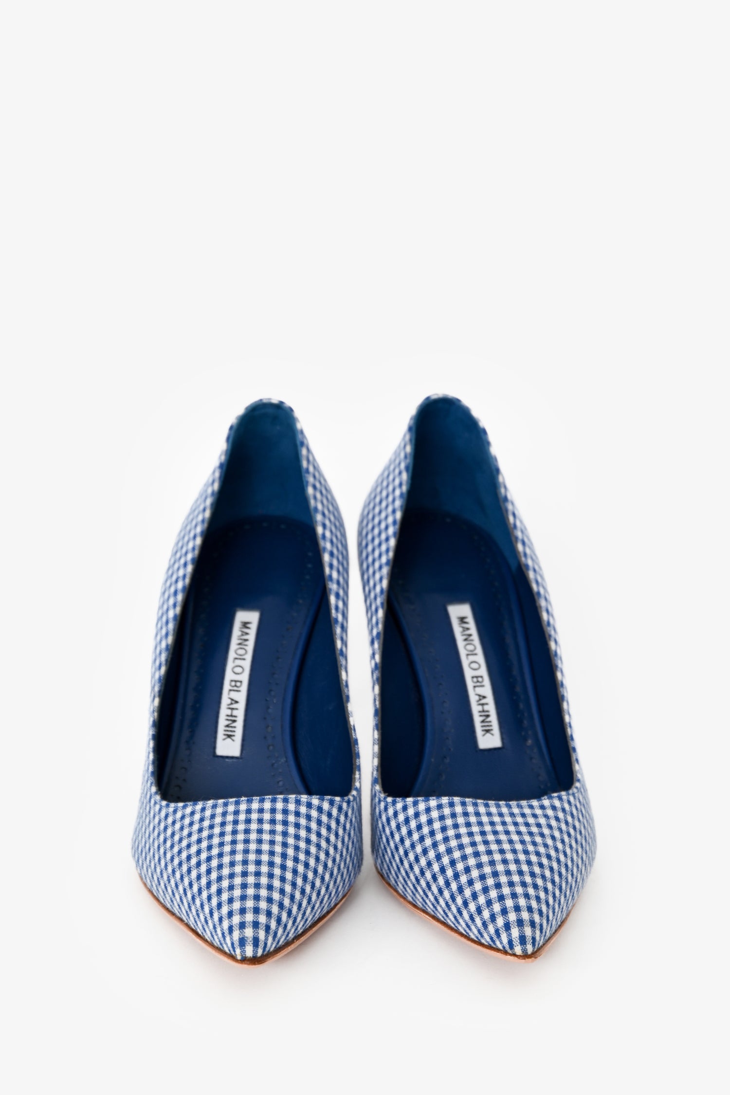 Refresh availabilityManolo Blahnik Blue/White Gingham Pointed Heels. Pointed toe. Stiletto heel. Tonal stitching.