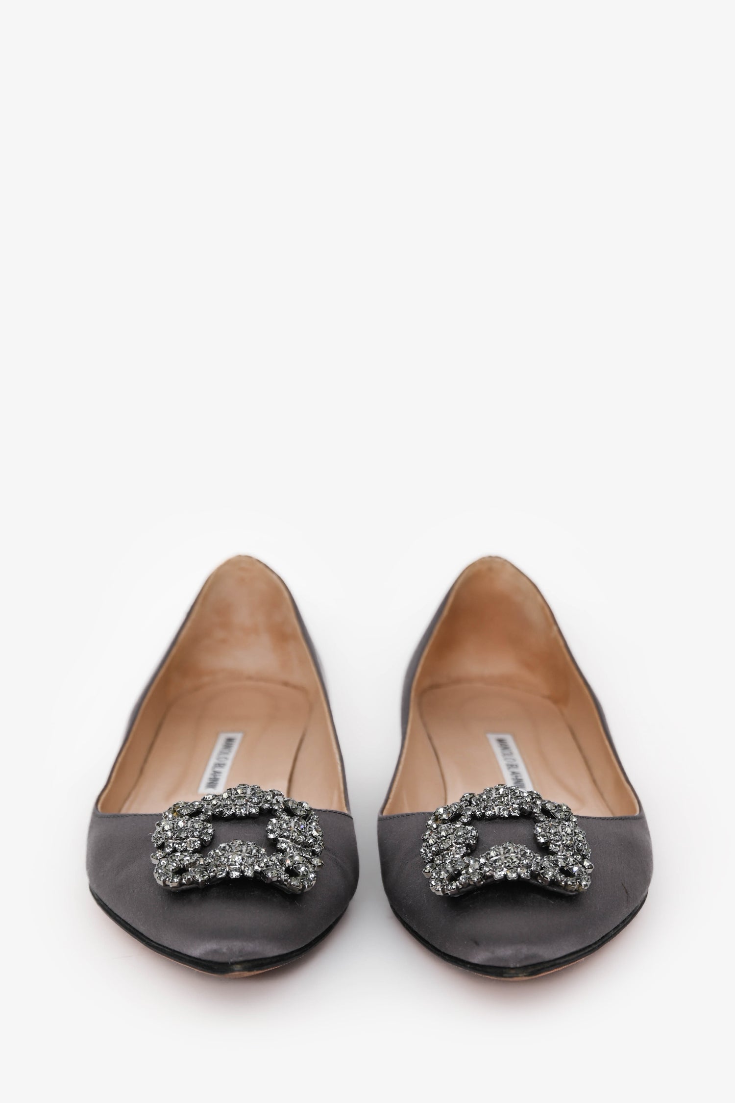 Refresh availabilityManolo Blahnik Grey Satin Hangisi Flats. Slip-on. Pointed toe. Embellished front buckle detail. Silver-tone hardware. Tonal stitching.