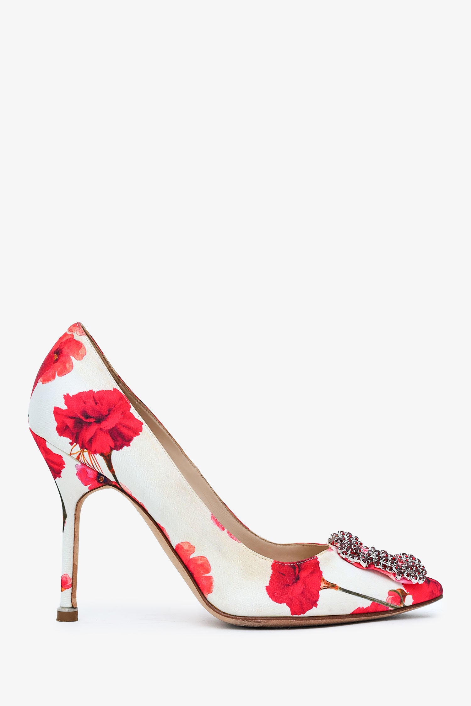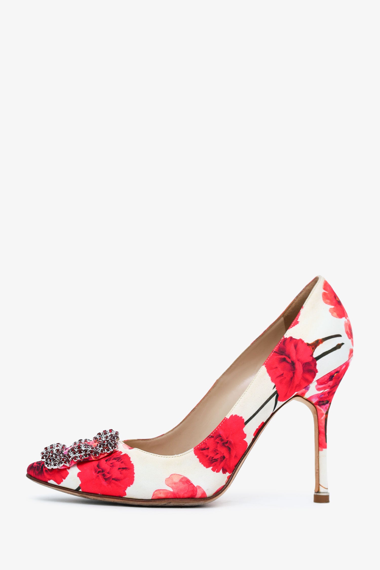 Refresh availabilityManolo Blahnik Multicolour Floral Print Crystal Embellished Heels. Pointed toe. Lined interior. Silver-tone hardware. Tonal stitching.