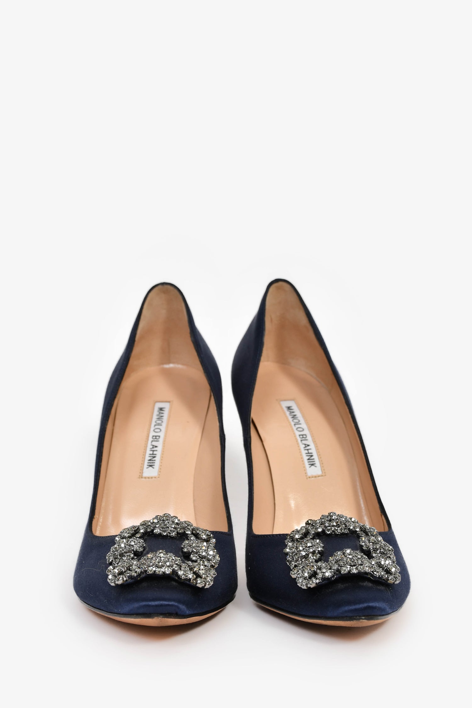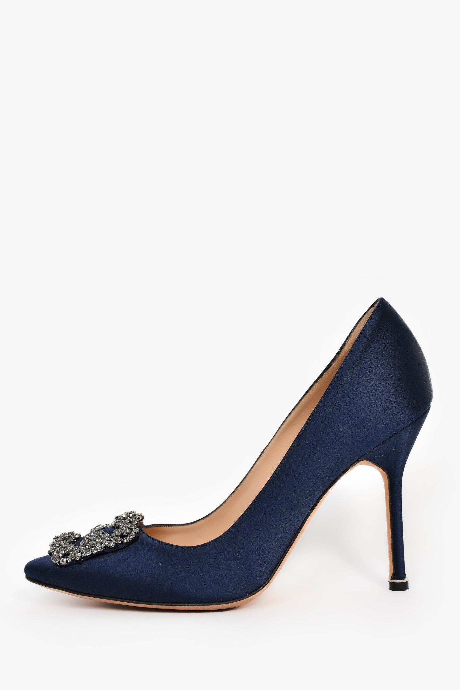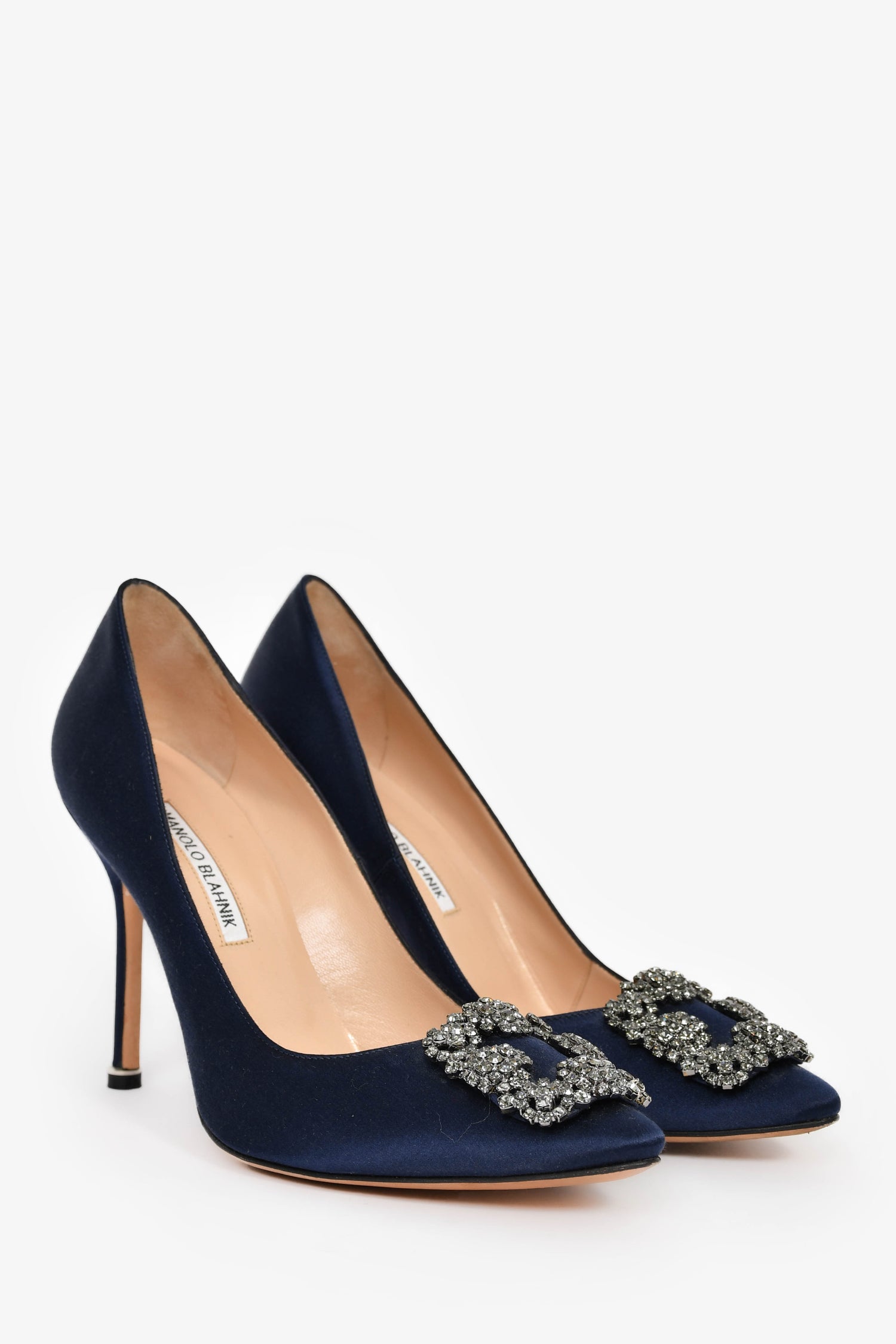 Refresh availabilityManolo Blahnik Navy Satin Embellished Hangisi Heels. Pointed toe. Silver-tone hardware. Tonal stitching.