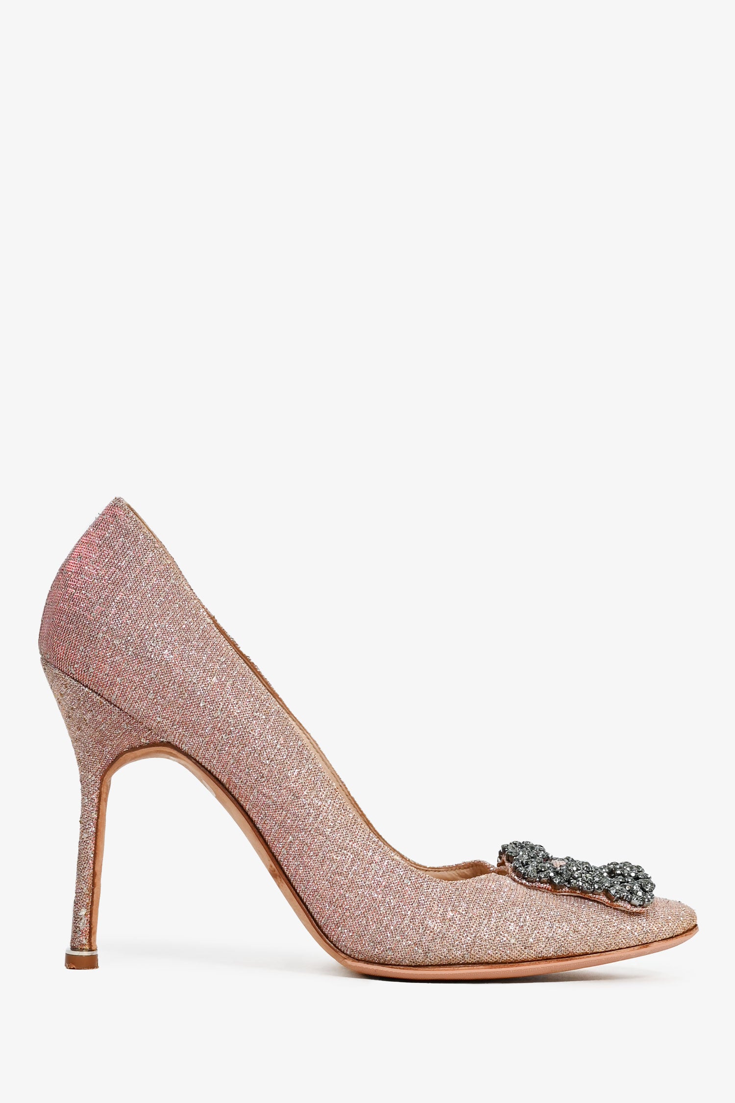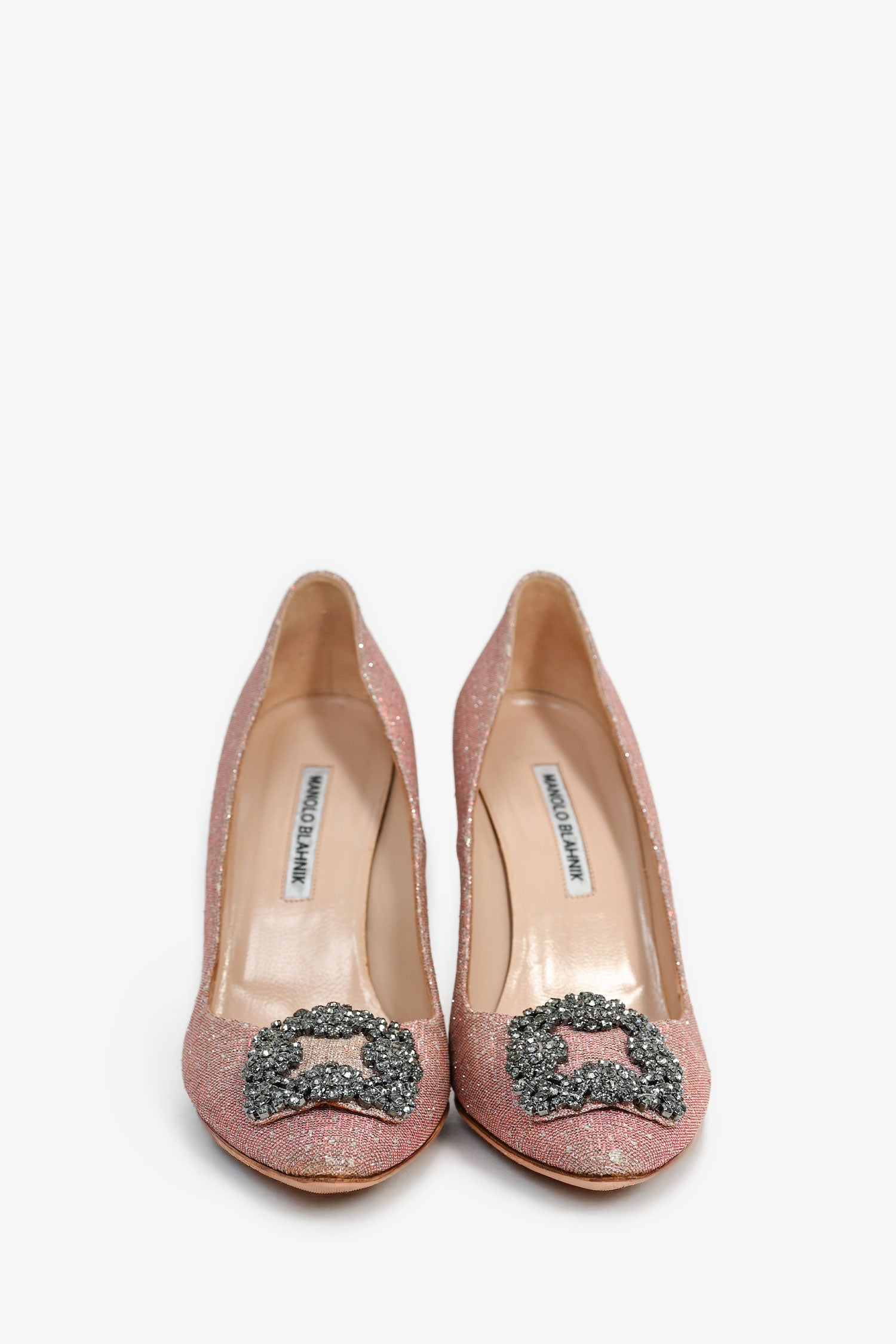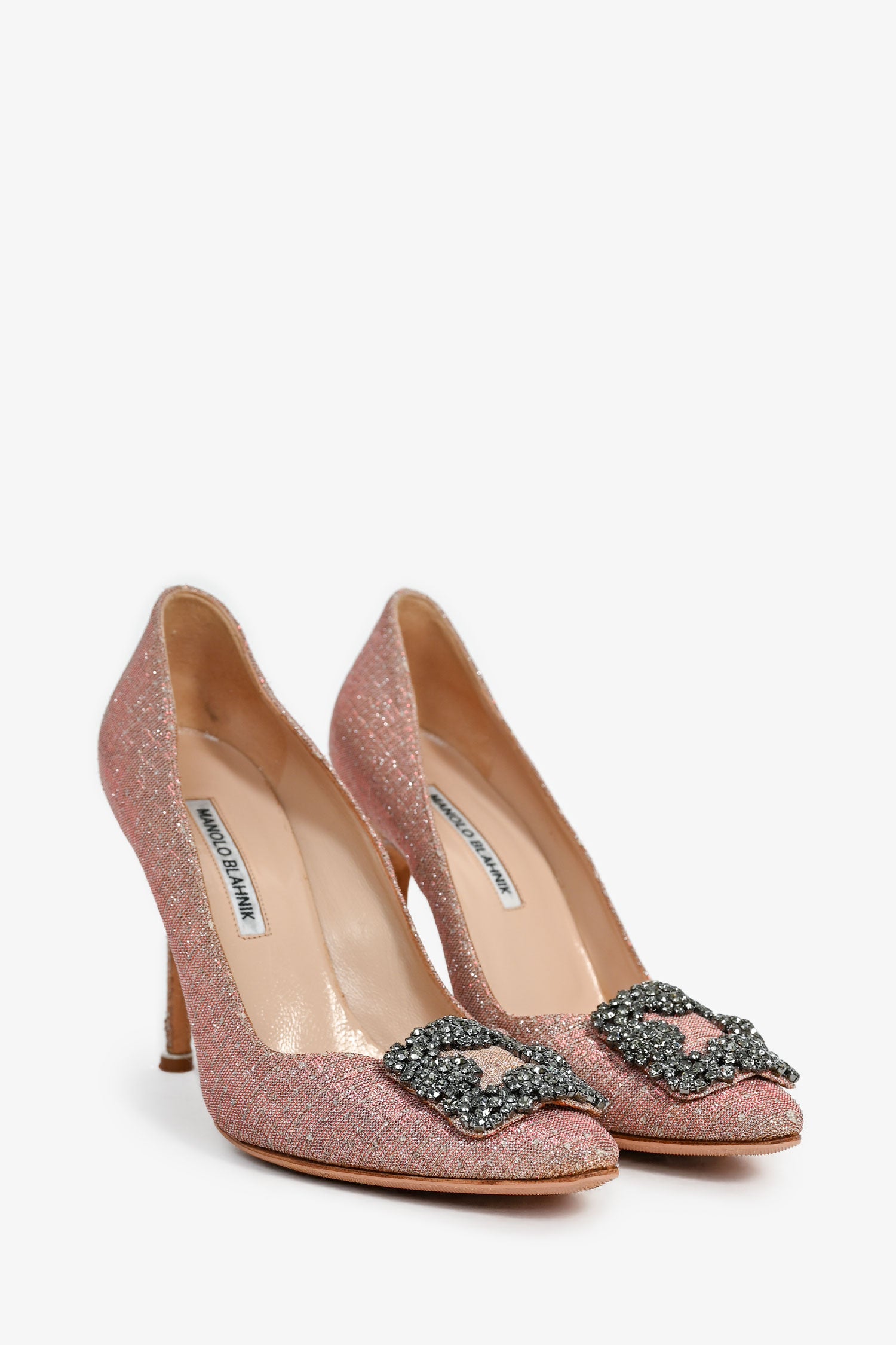 Refresh availabilityManolo Blahnik Pink Thread Hangisi Heels. Pointed toe front. Crystallized front. Leather insoles. Stiletto heel. Tonal stitching.