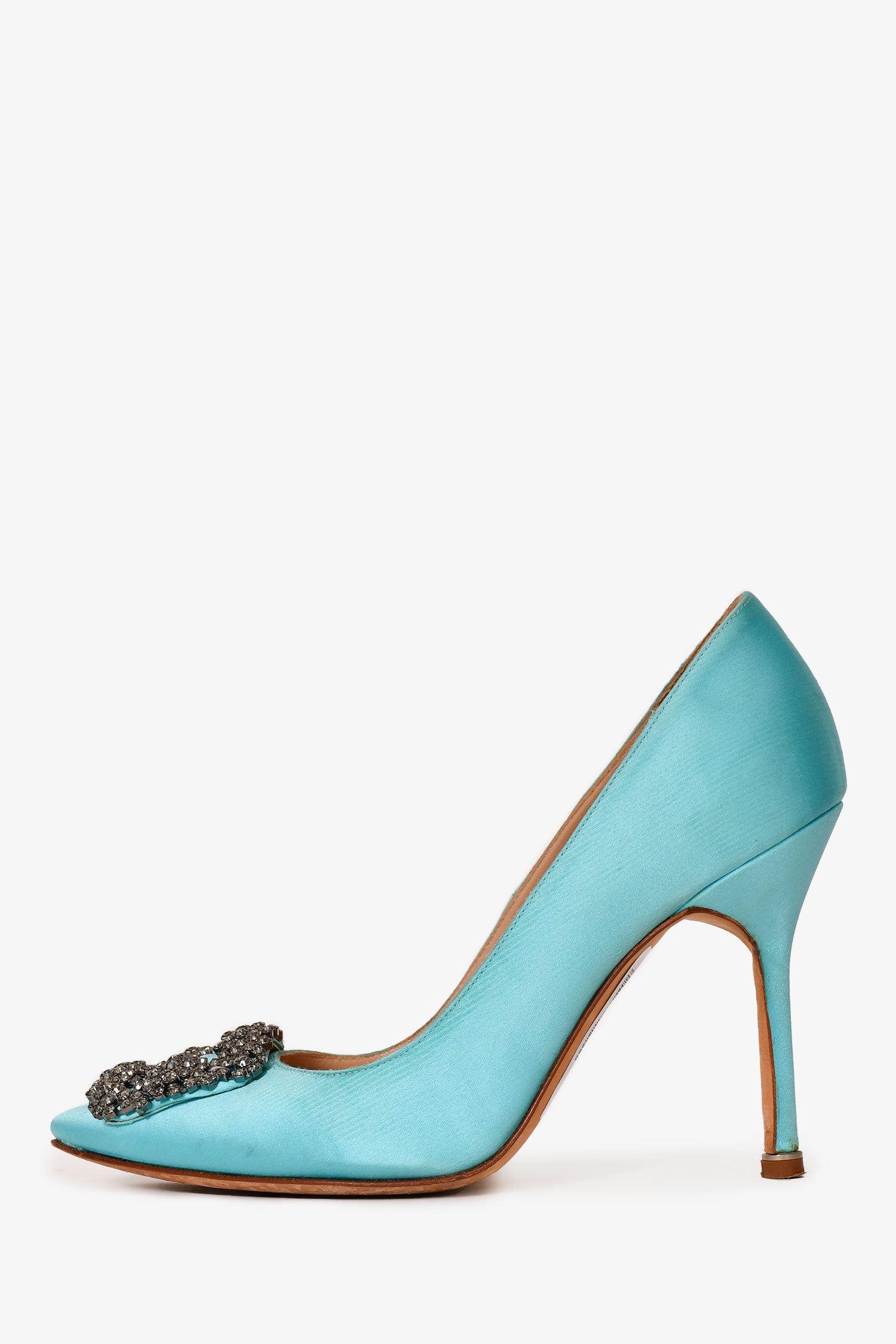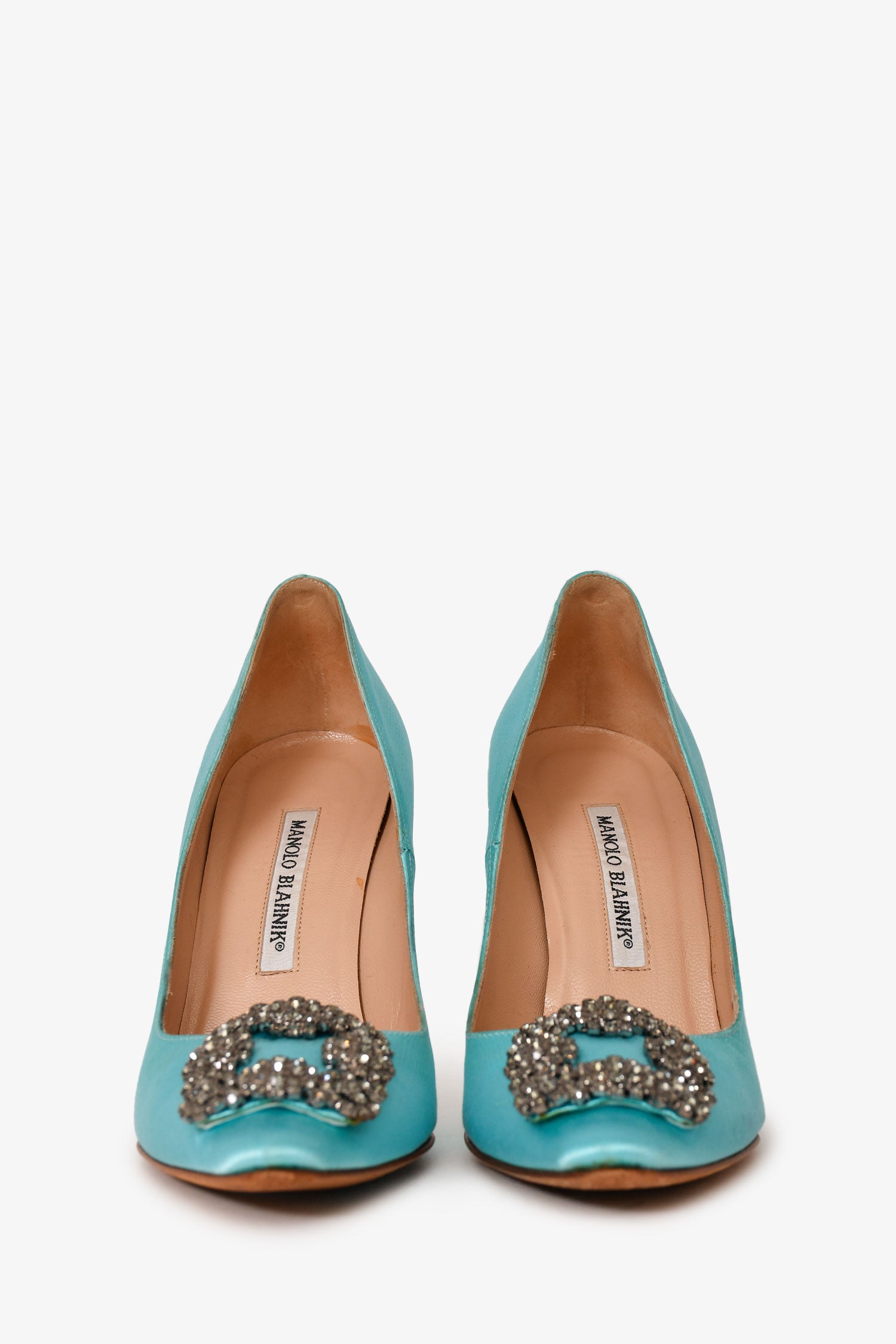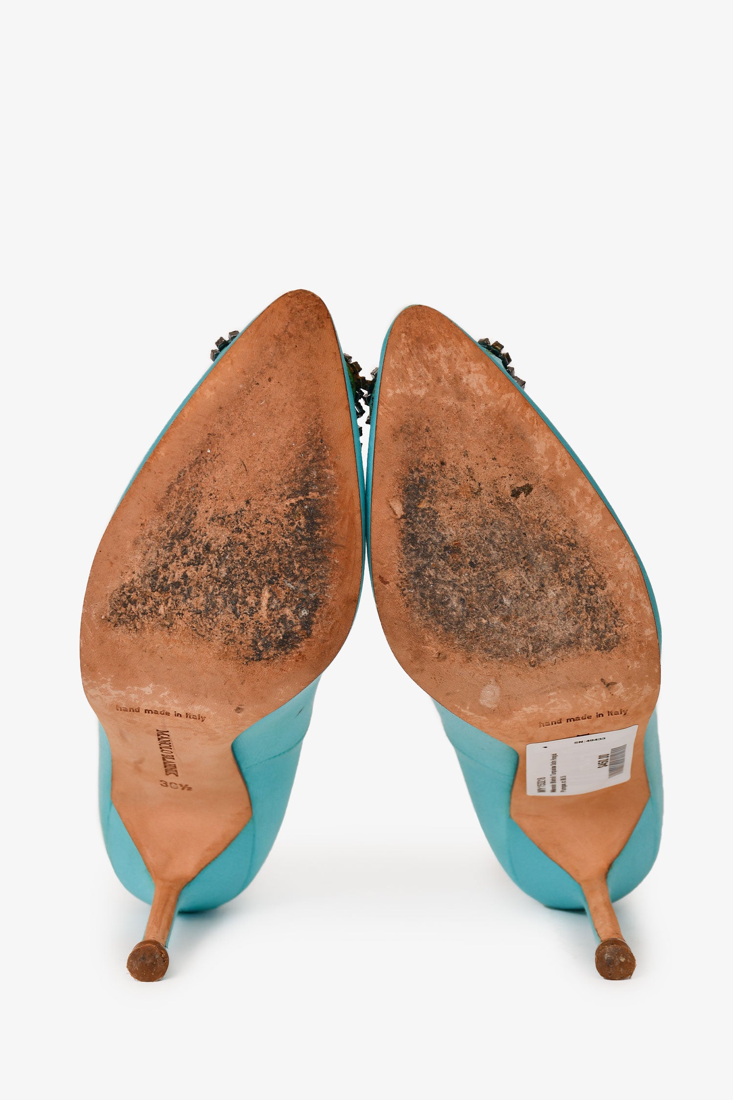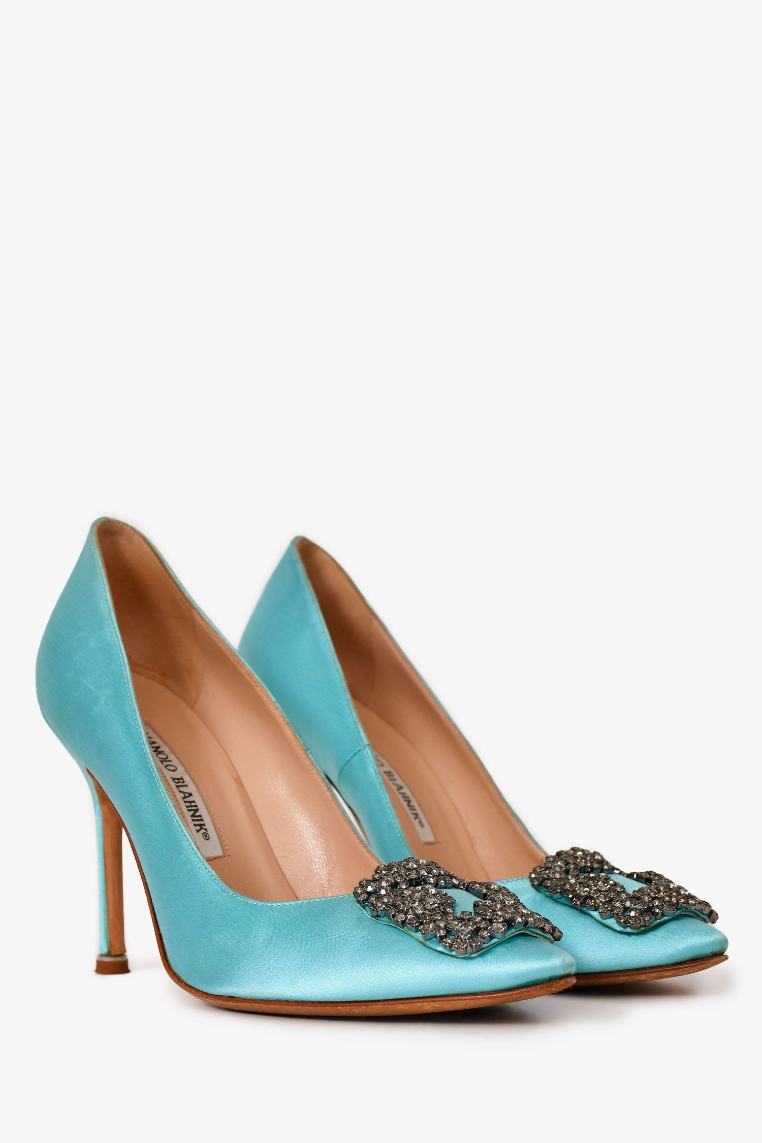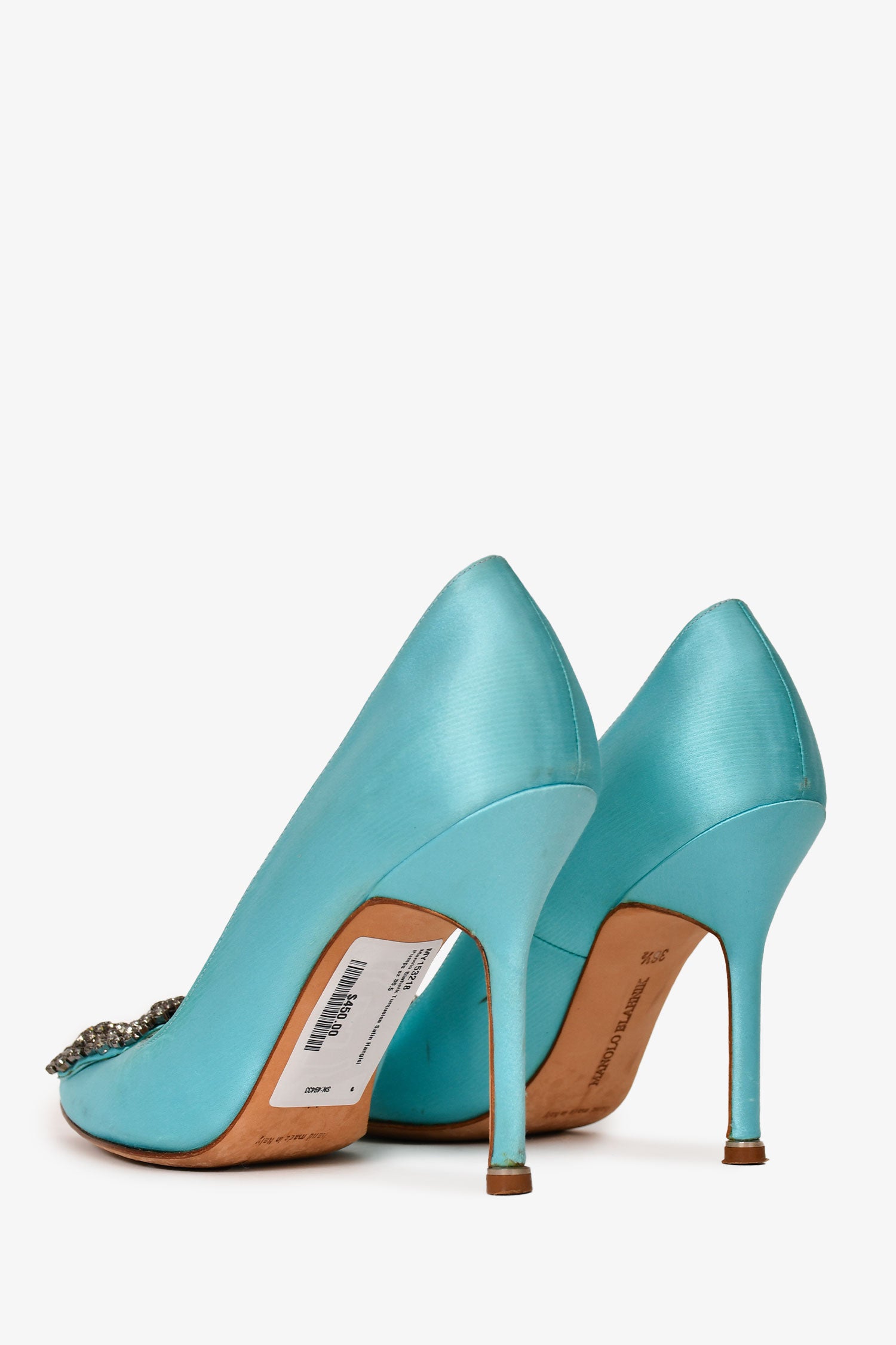 Refresh availabilityManolo Blahnik Turquoise Satin Hangisi Pumps. Slip-on. Pointed toe. Crystal embellishments at toe. Tonal stitching.