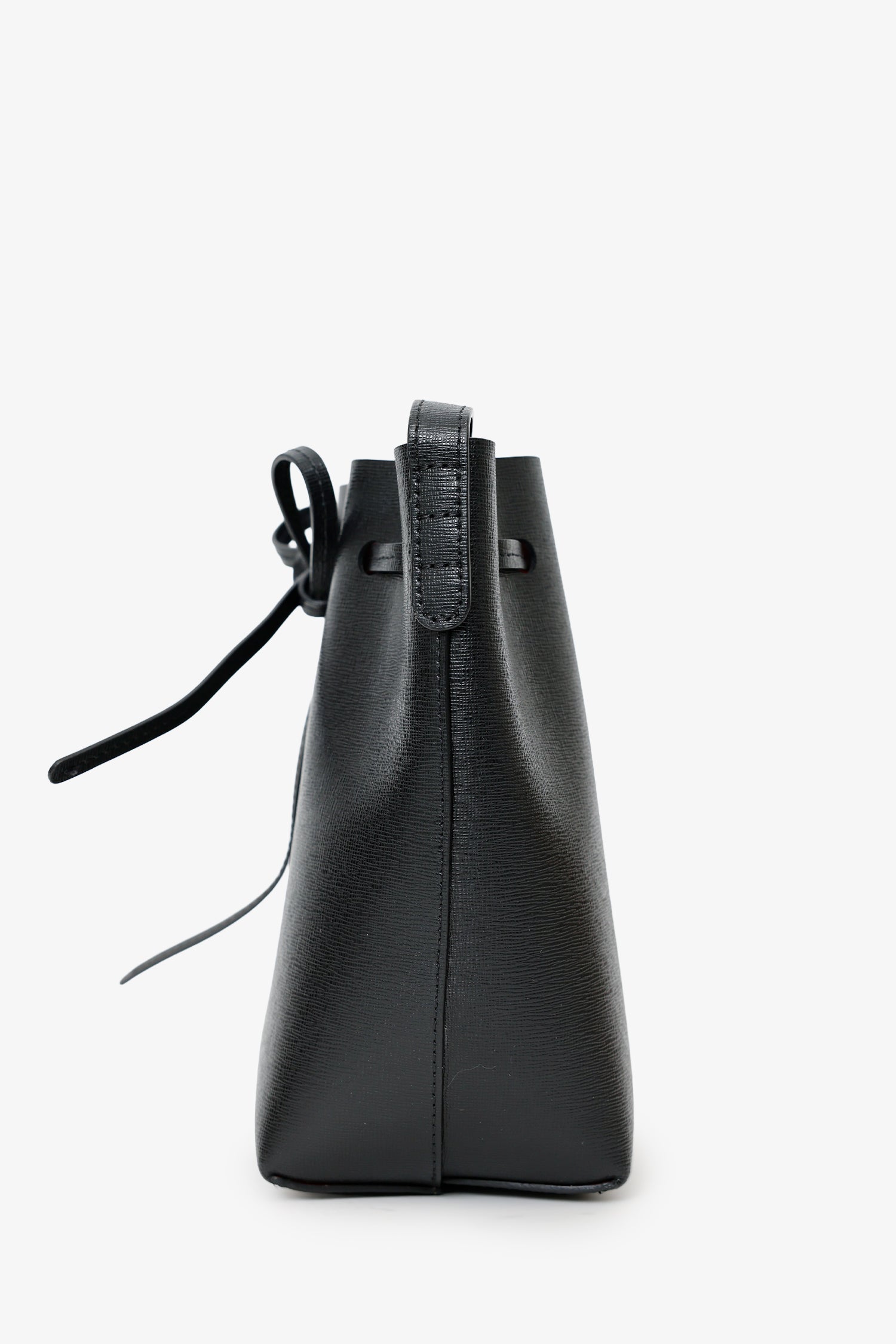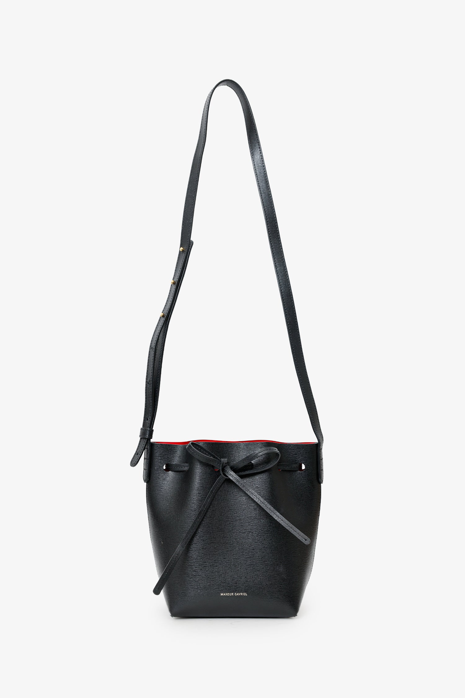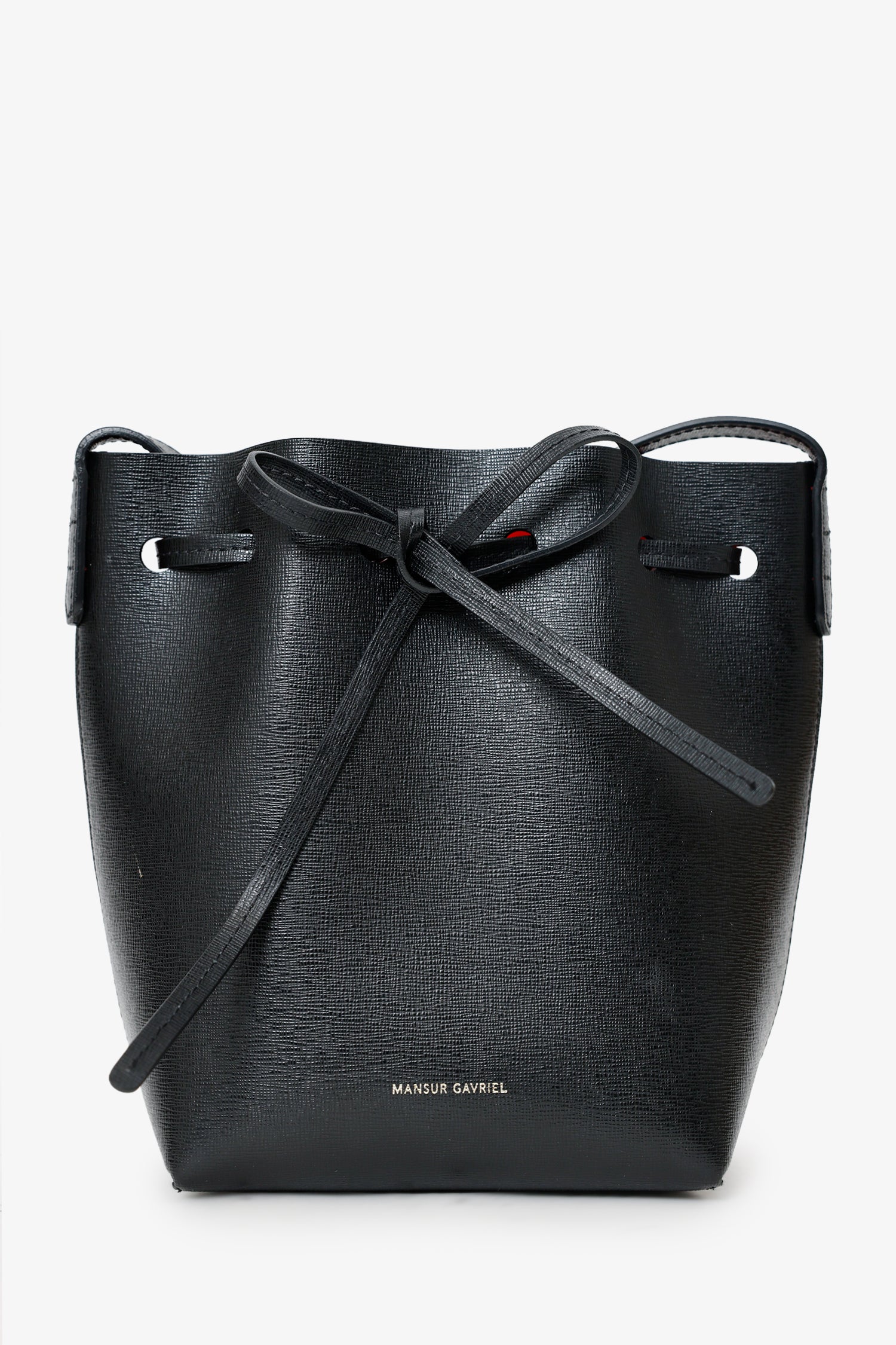 Refresh availabilityMansur Gavriel Black Leather Mini Bucket Bag. Front cinch tie-up closure. Leather crossbody strap with adjustable pull-through push-pin closure. Open interior. Gold-tone hardware. Tonal stitching.