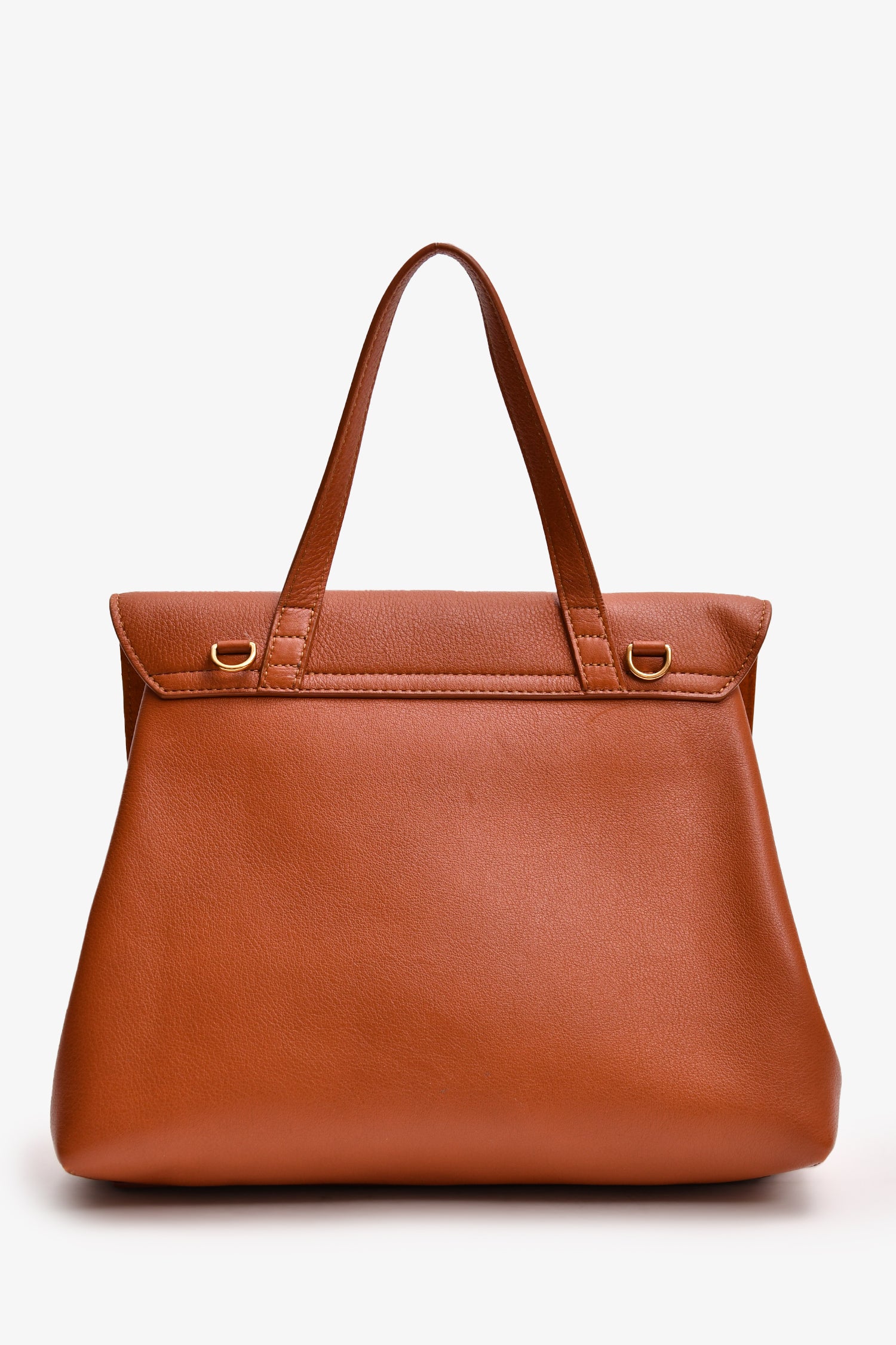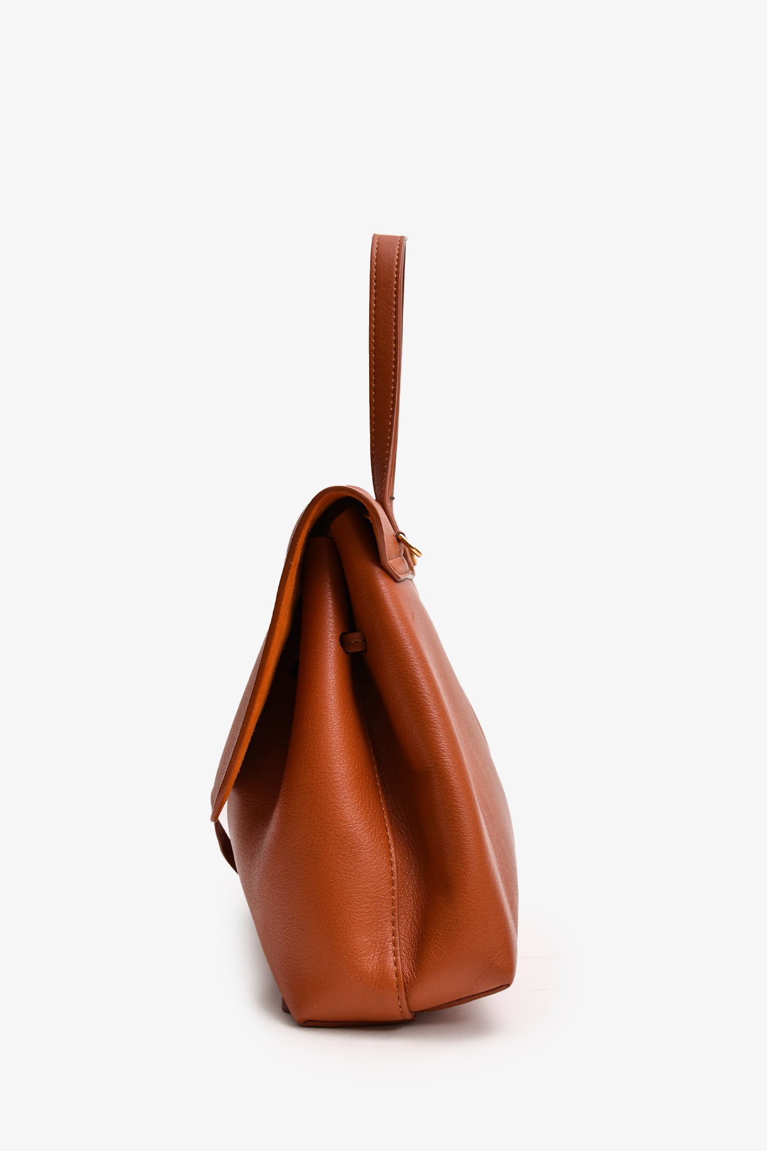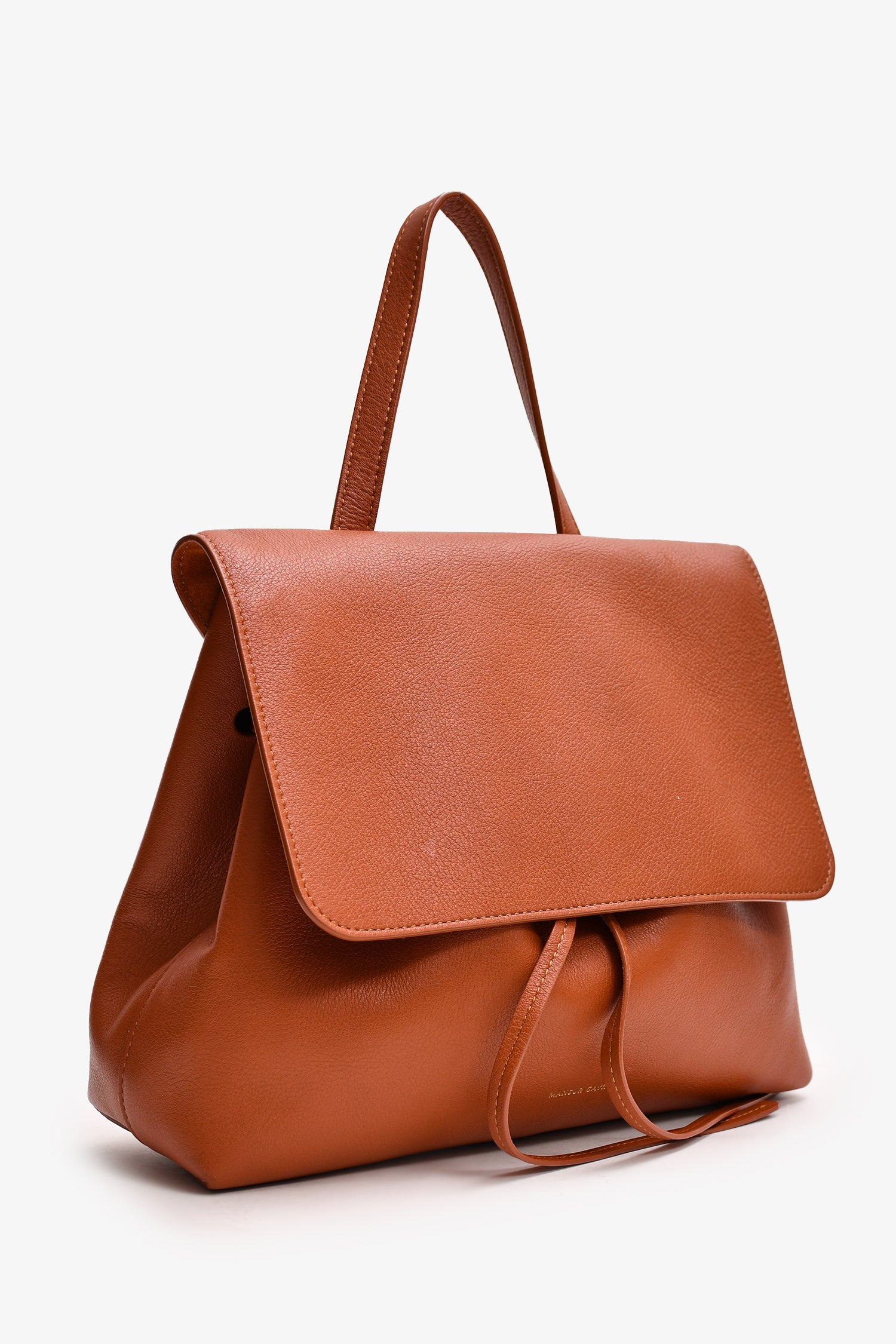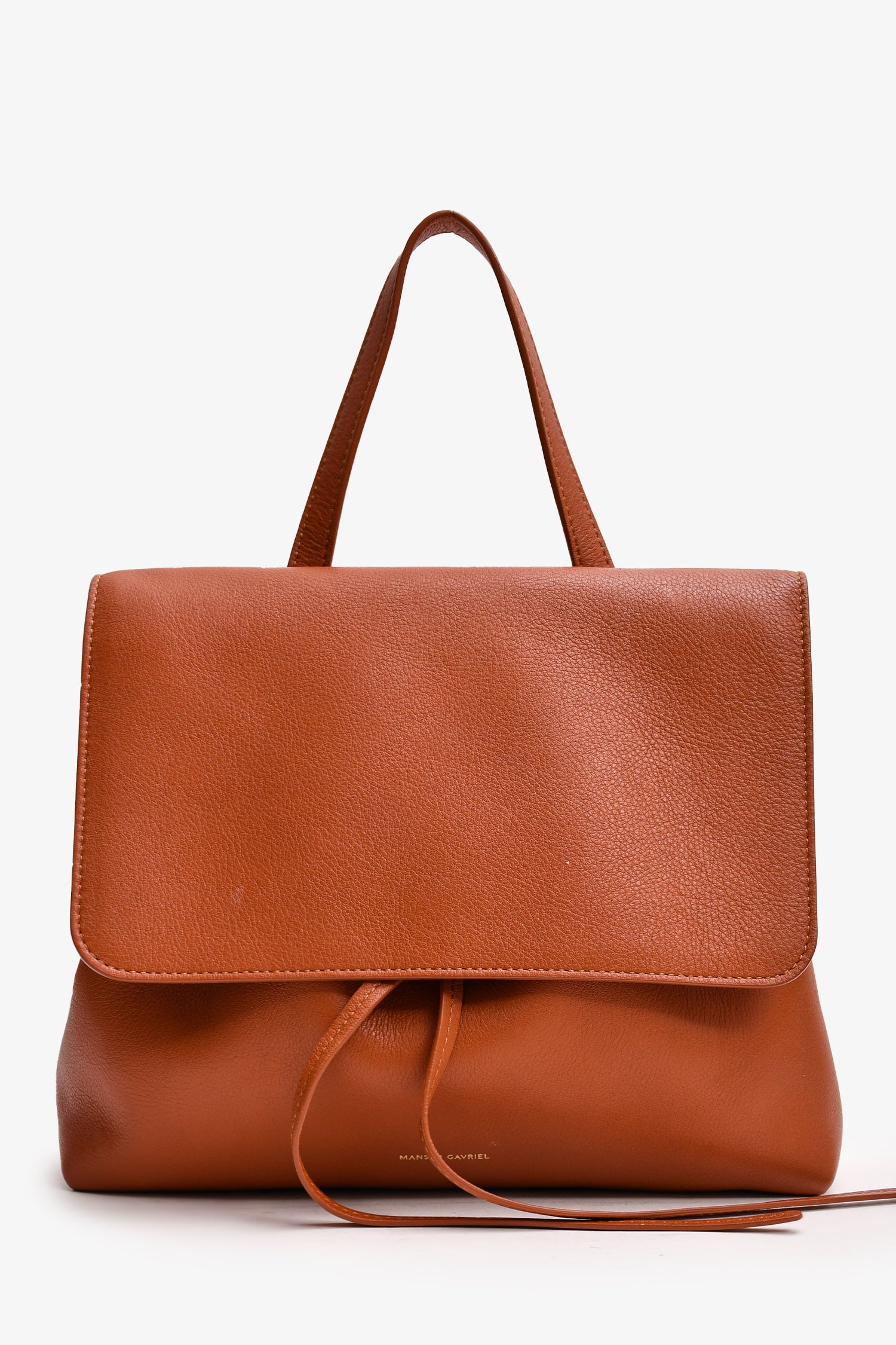 Refresh availabilityMansur Gavriel Brown Leather 'Lady' Satchel. Front fold over flap with push tab closure. Single top handle. 2 interior pockets; 1 slip, 1 zip. Tonal stitching.