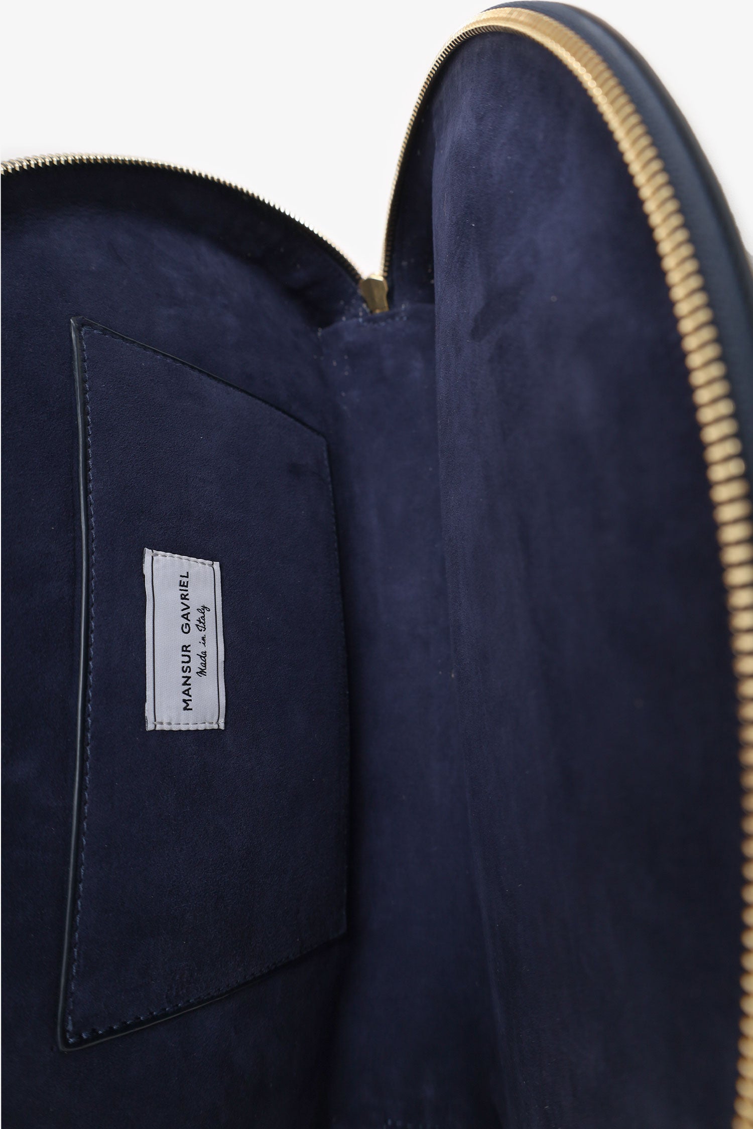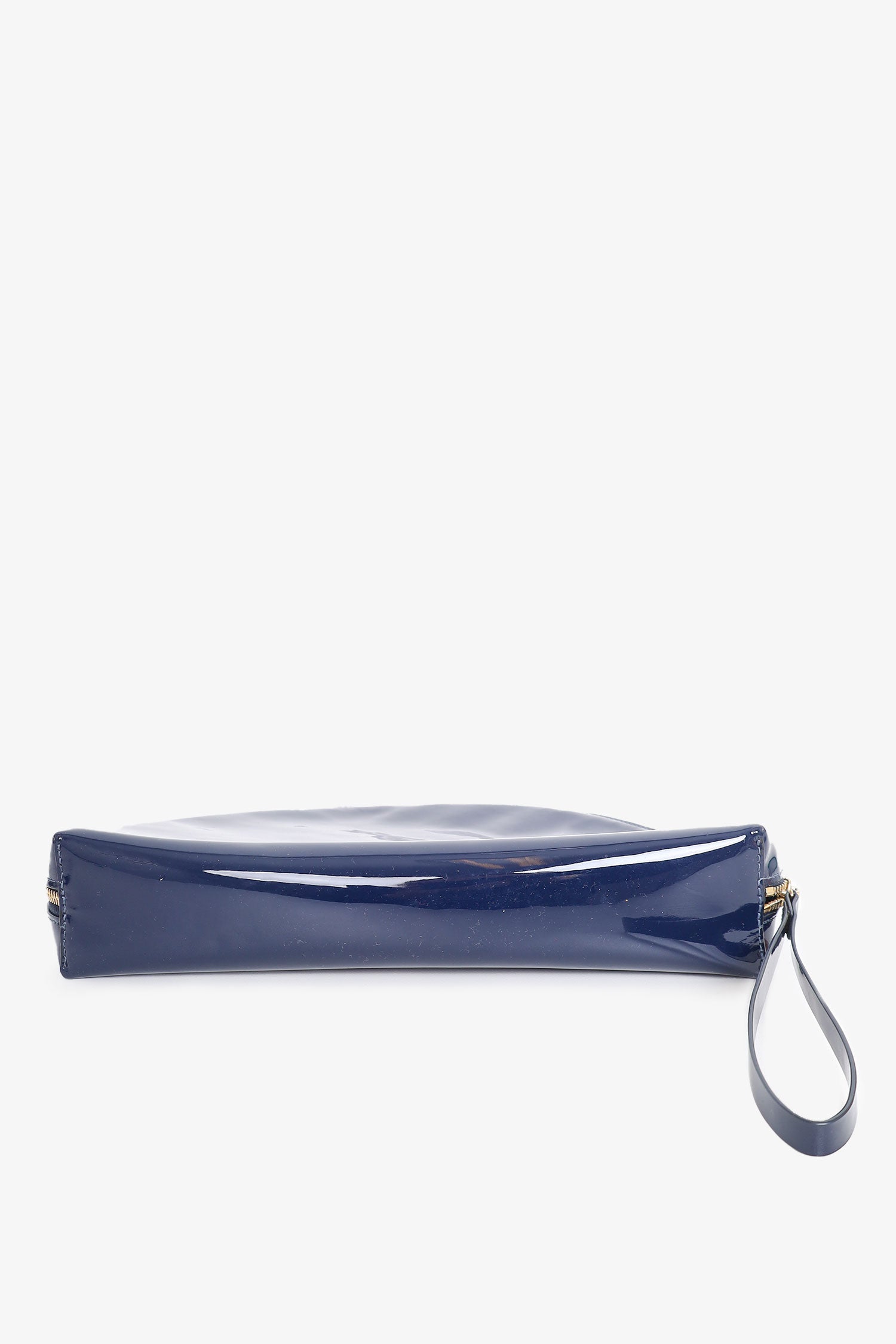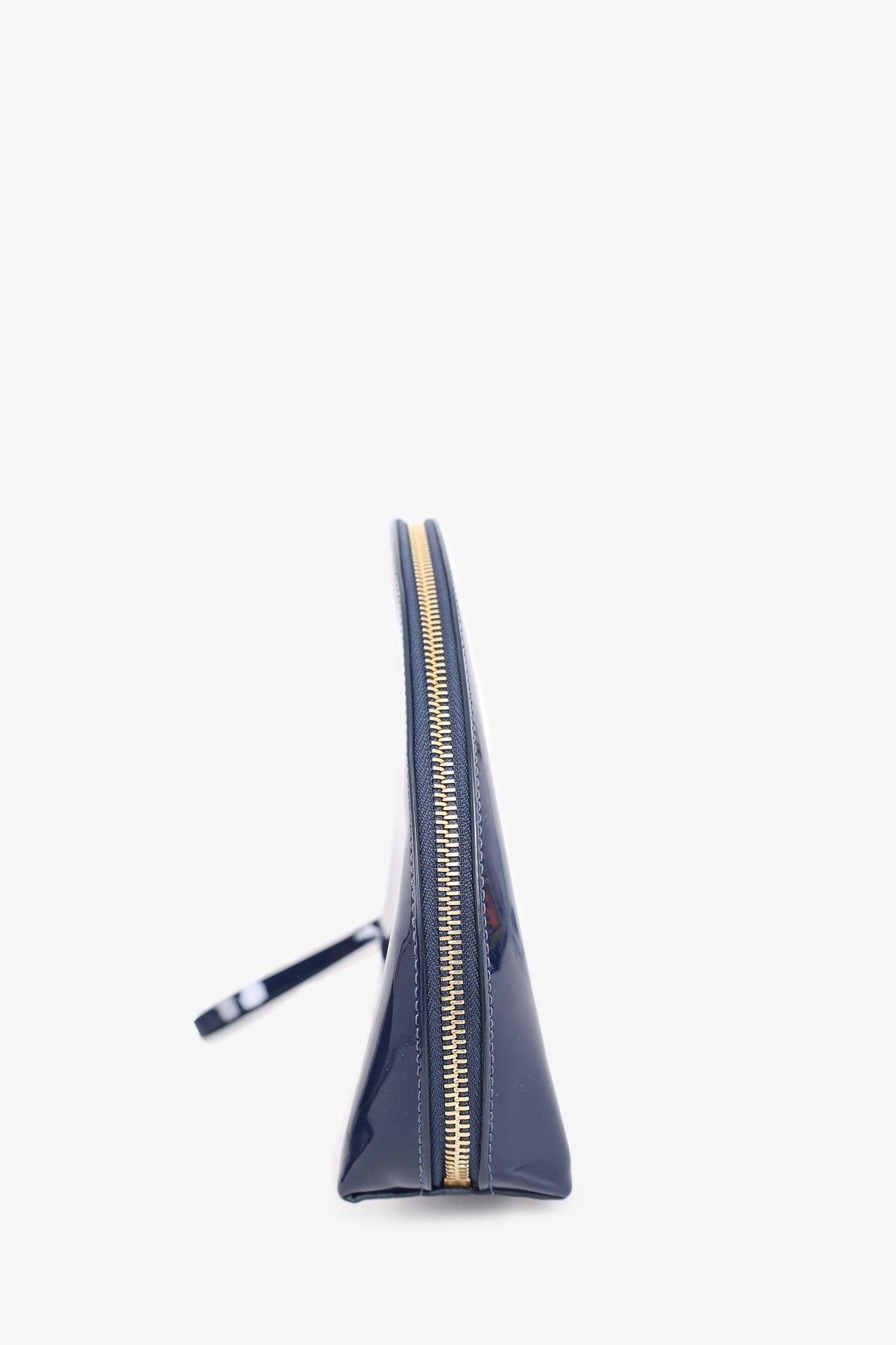 Refresh availabilityMansur Gavriel Navy Patent Half Moon Clutch. Zip-closure. Gold-tone hardware. Suede interior. Single interior card slot.