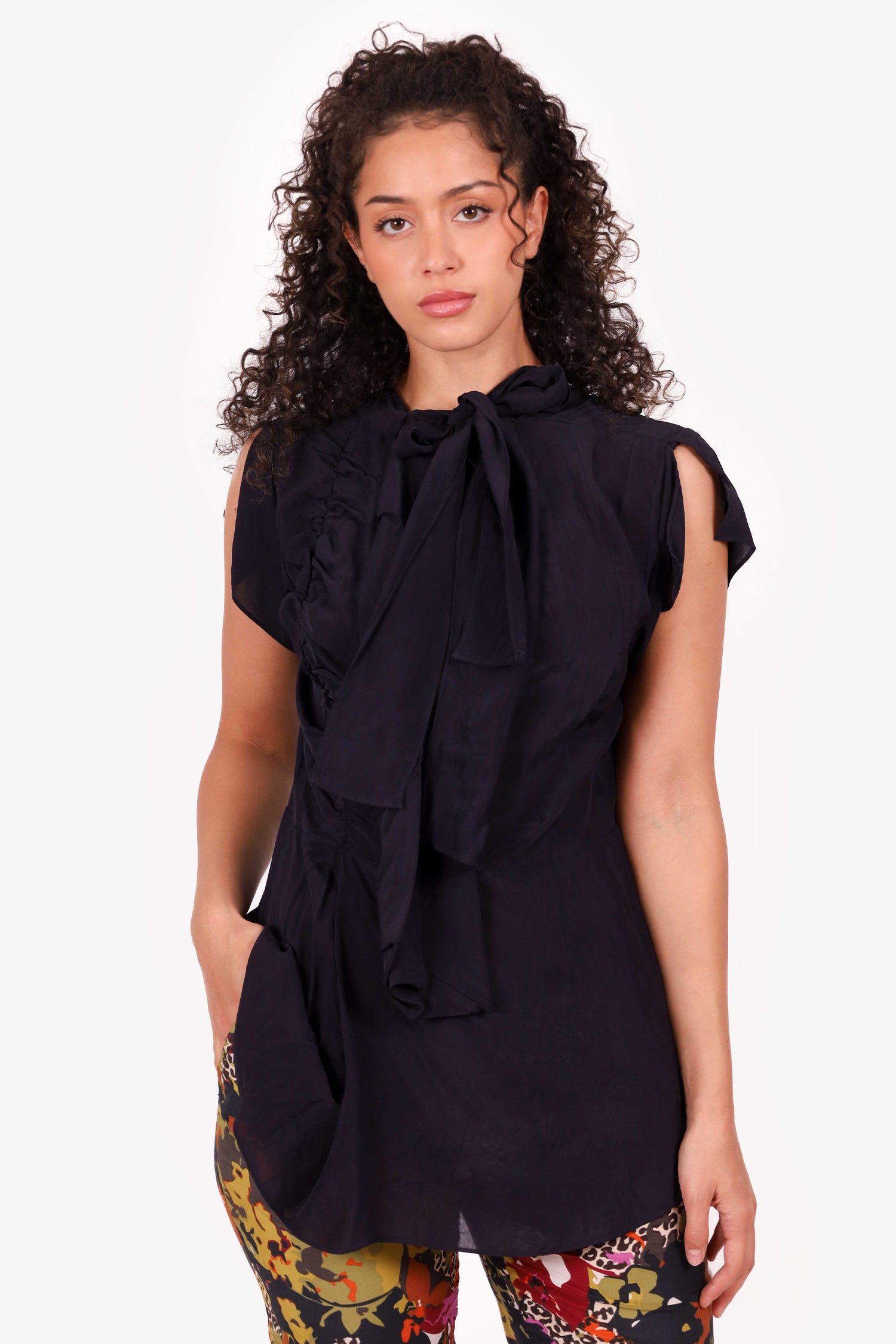 Refresh availabilityMarni Black Ruffle Cap Sleeve Top. Pull-on. Front tie-up closure at neckline. Rear keyhole with tie-up closure. Rear zip closure. Front ruching detail. Tonal stitching.