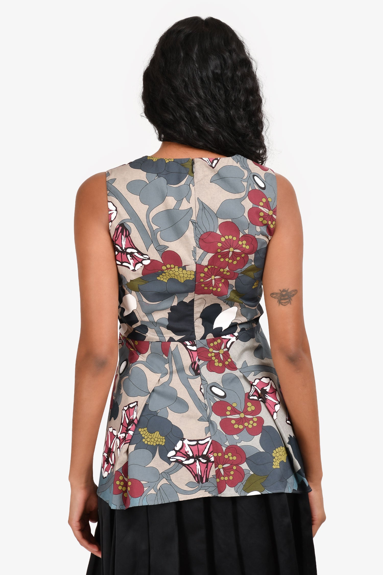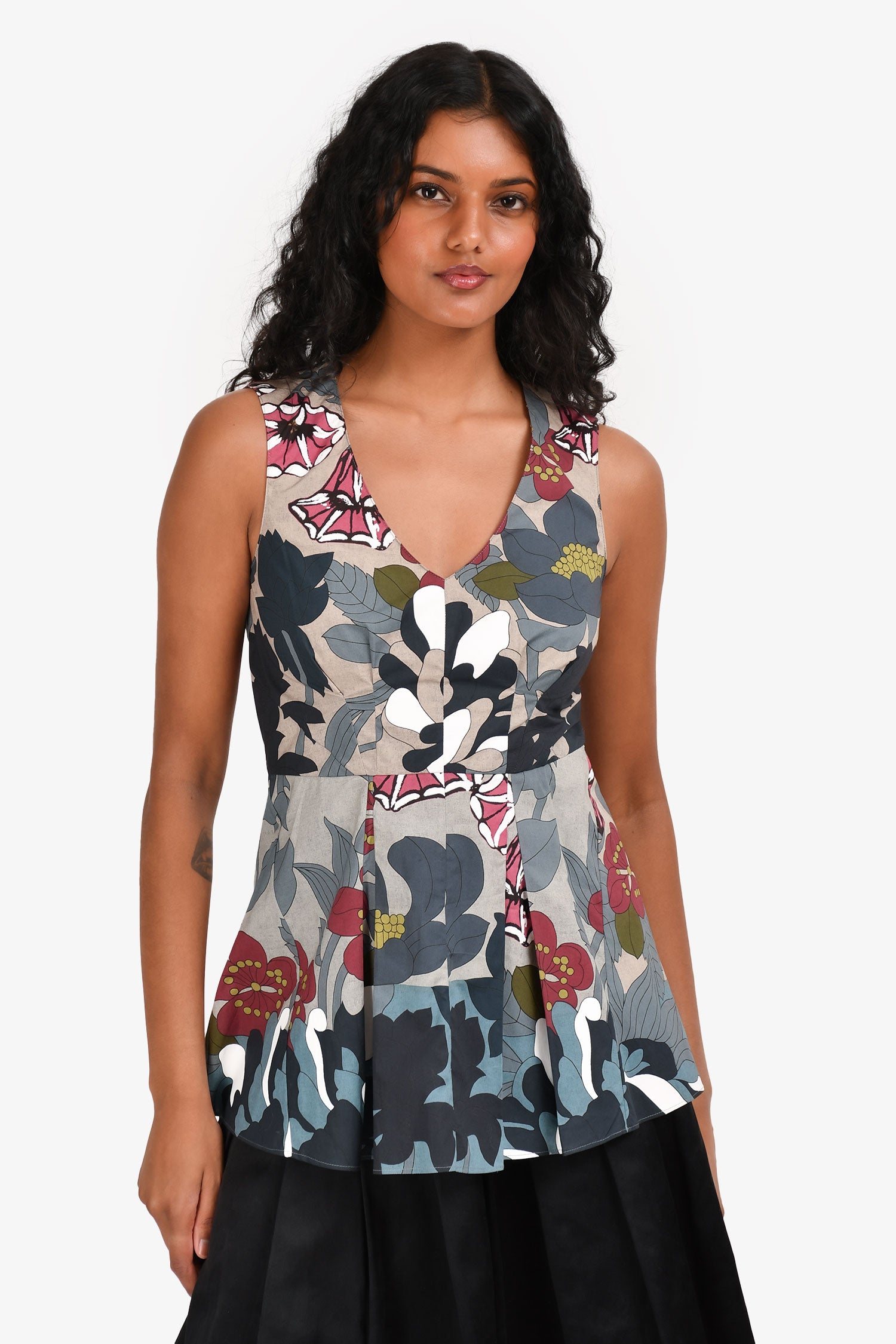 Refresh availabilityMarni Burgundy/Grey Cotton Floral V-Neck Peplum Top. V-neckline. Sleeveless design. Back zip closure. Tonal stitching.