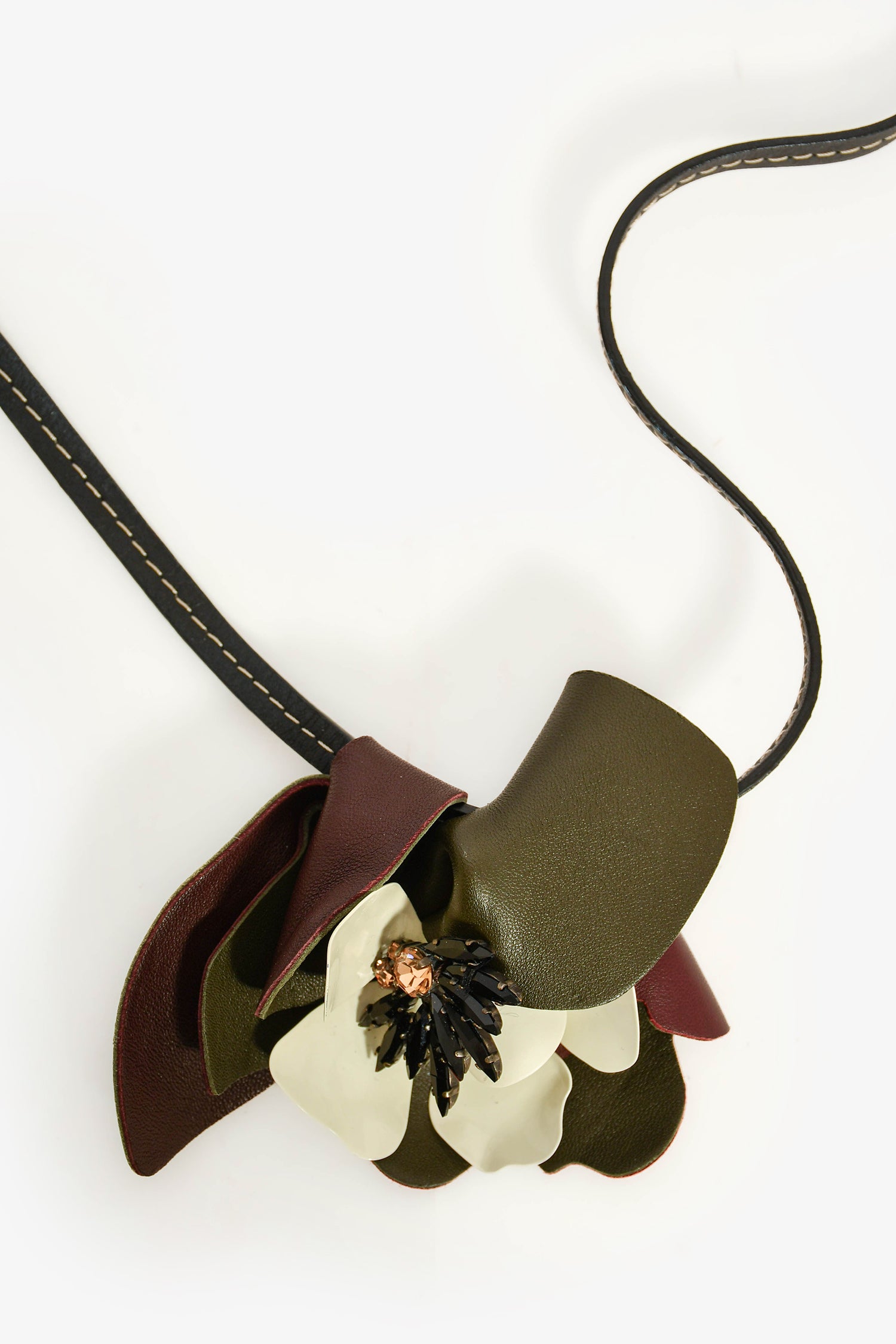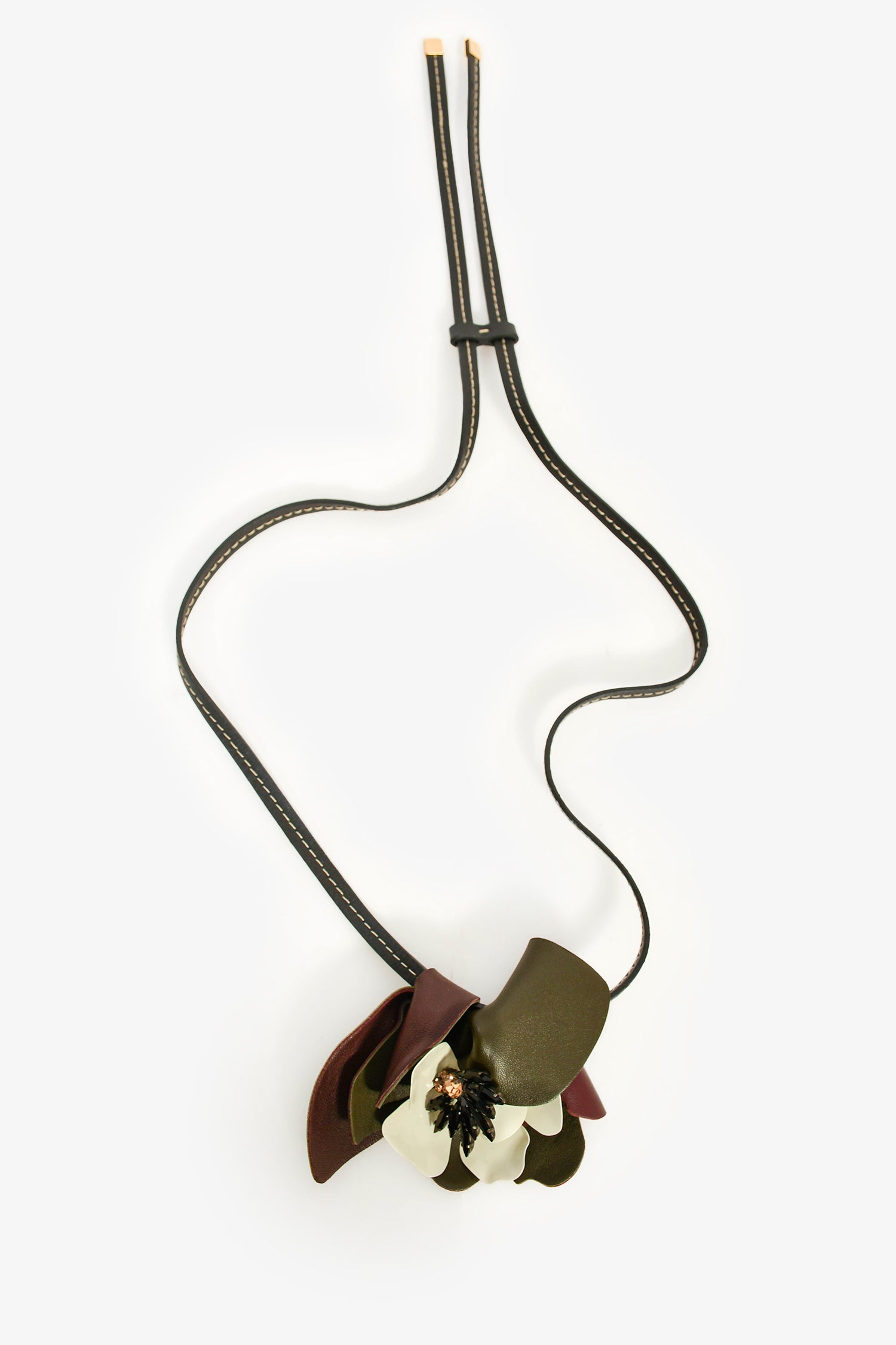 Refresh availabilityMarni Green/Burgundy Leather Floral Necklace. Green and burgundy-tone leather. Acrylic flower. Contrast stitching.