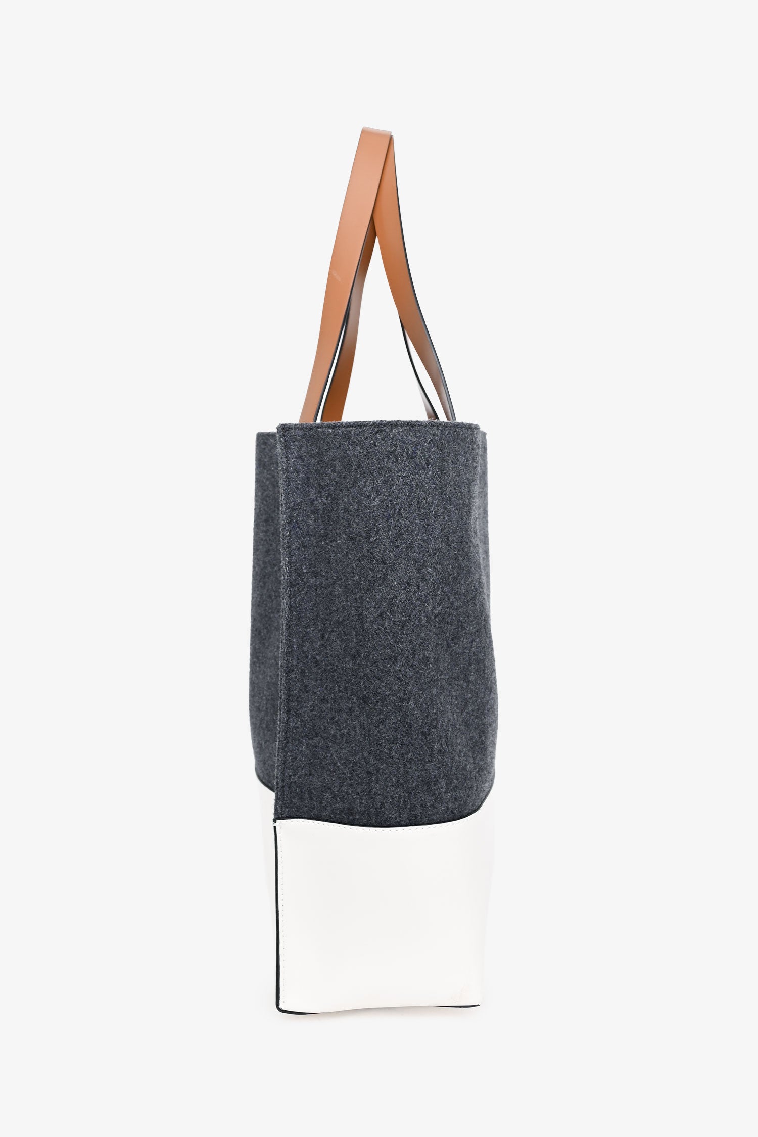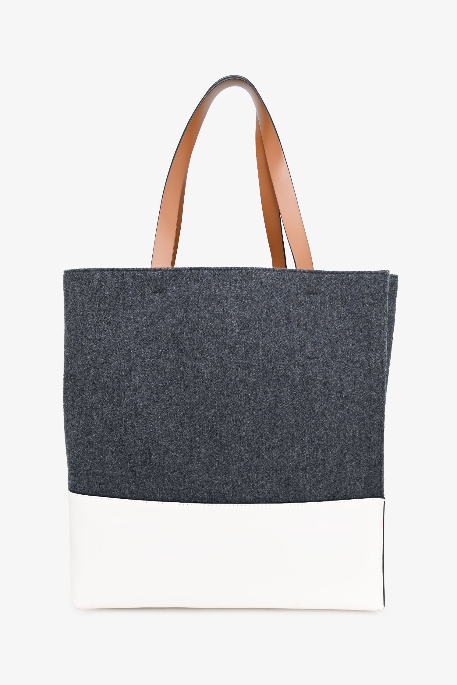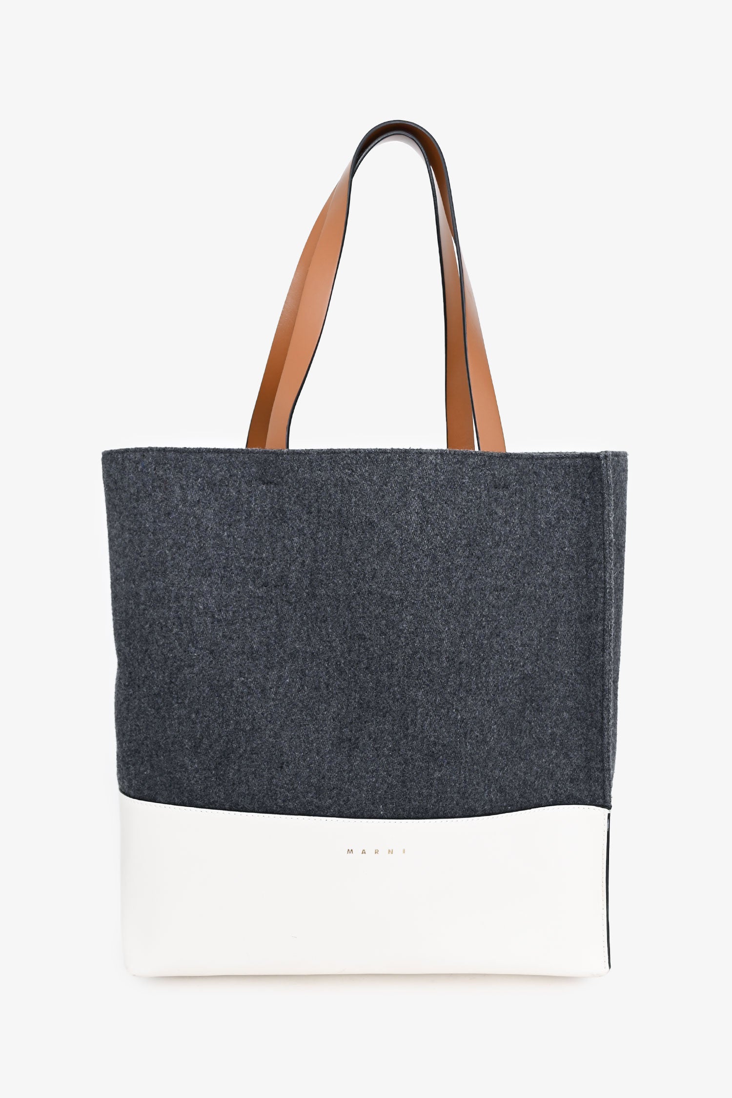 Refresh availabilityMarni Grey Felt White Leather Tote. Two leather handle drops. Asymmetrical exterior side seams. Leather interior. Large interior slip pocket. Tonal stitching.