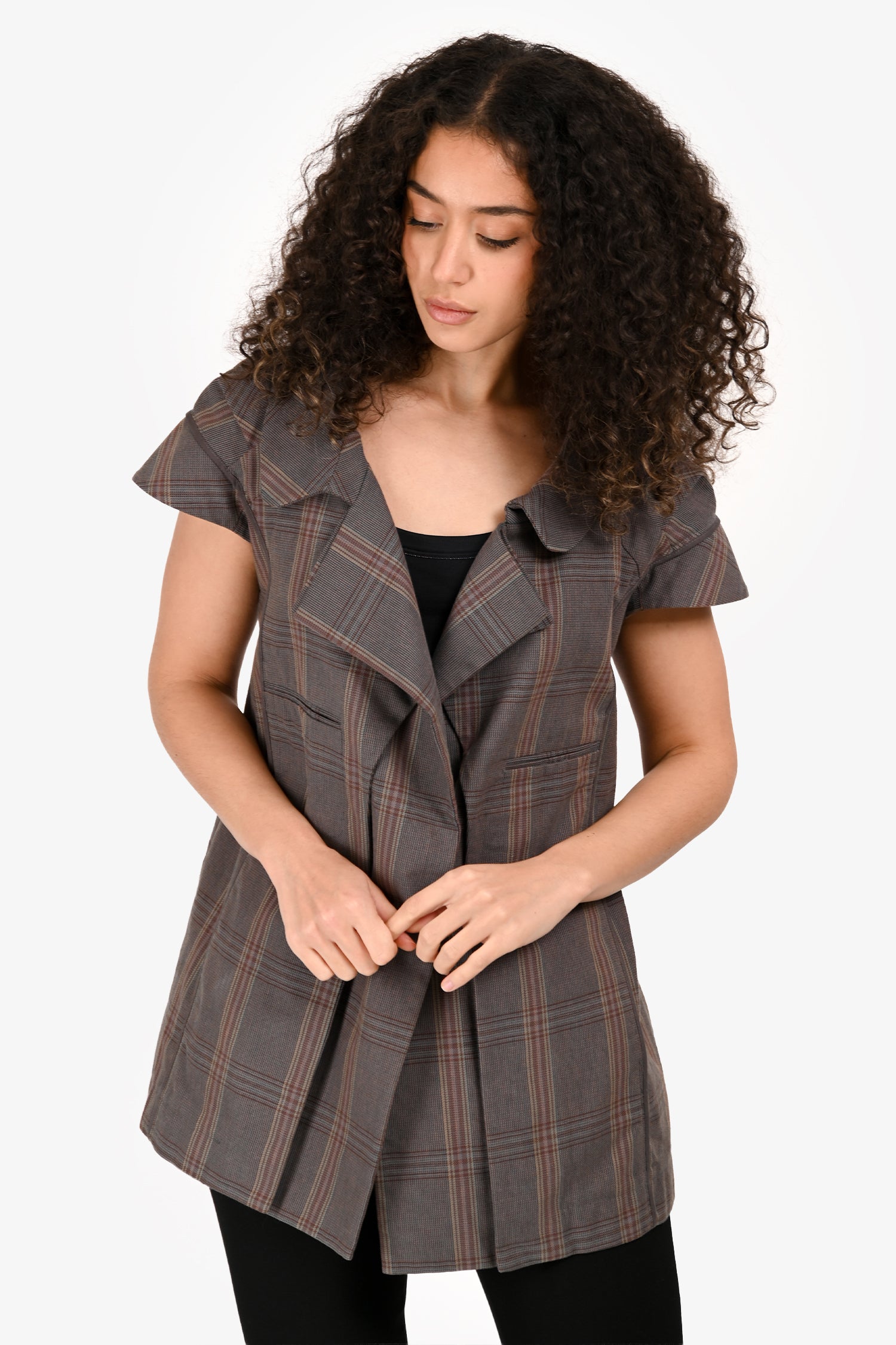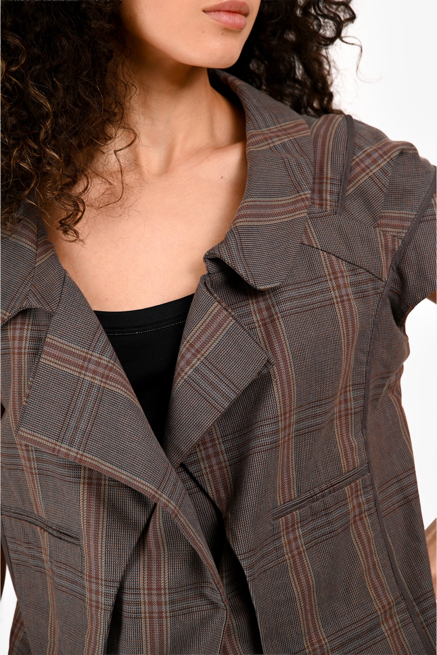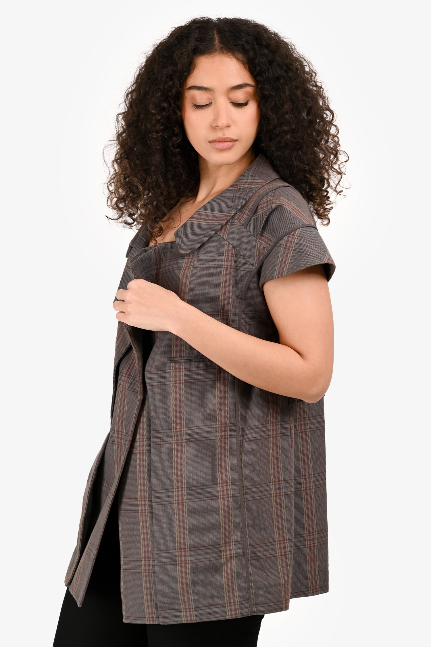 Refresh availabilityMarni Grey Plaid Sweetheart Neckline Cap Sleeve Top. Pull-on. Notch lapels. Snap button closure in the front. 2 slip pockets on the sides. Tonal hardware. Tonal stitching.