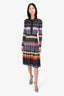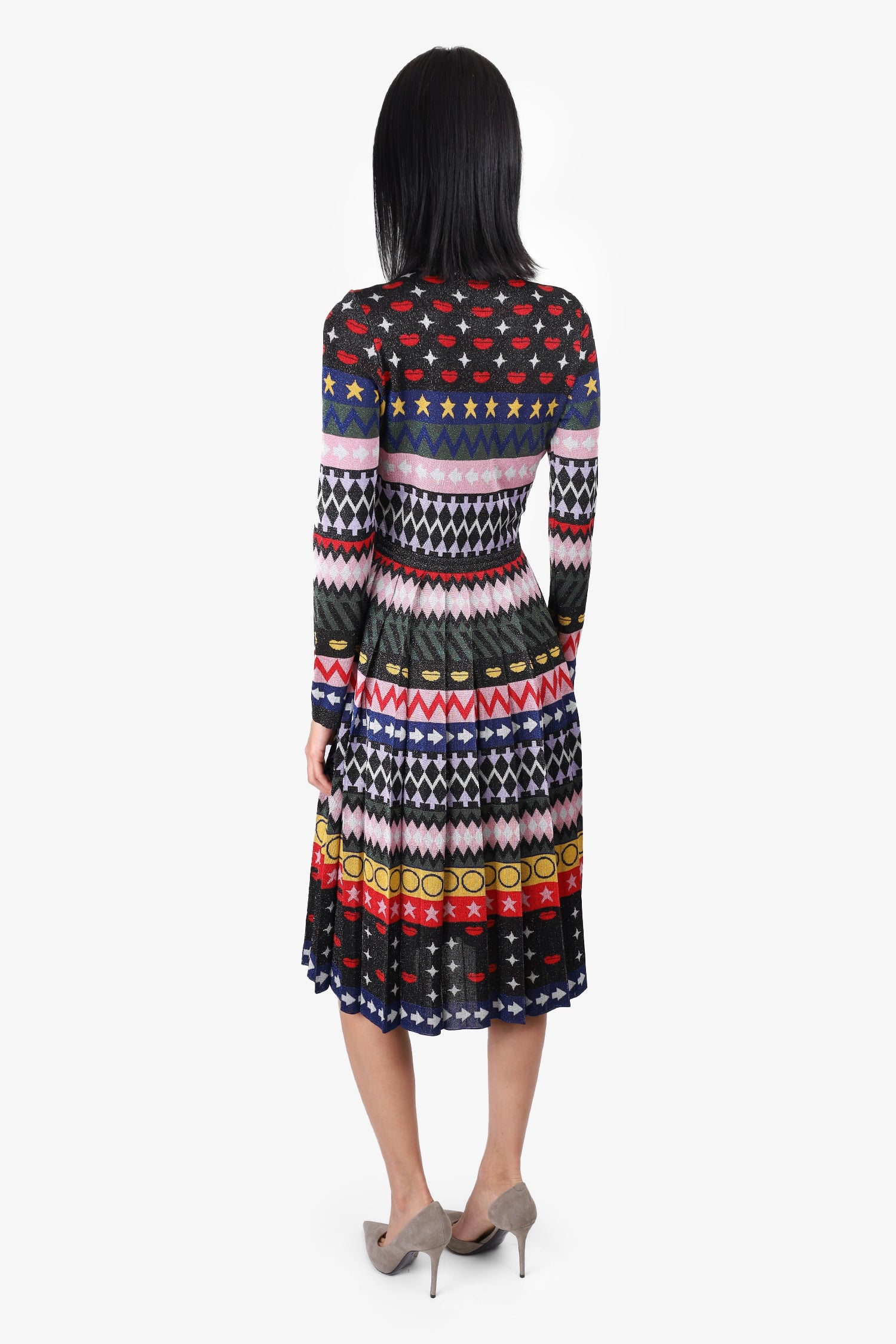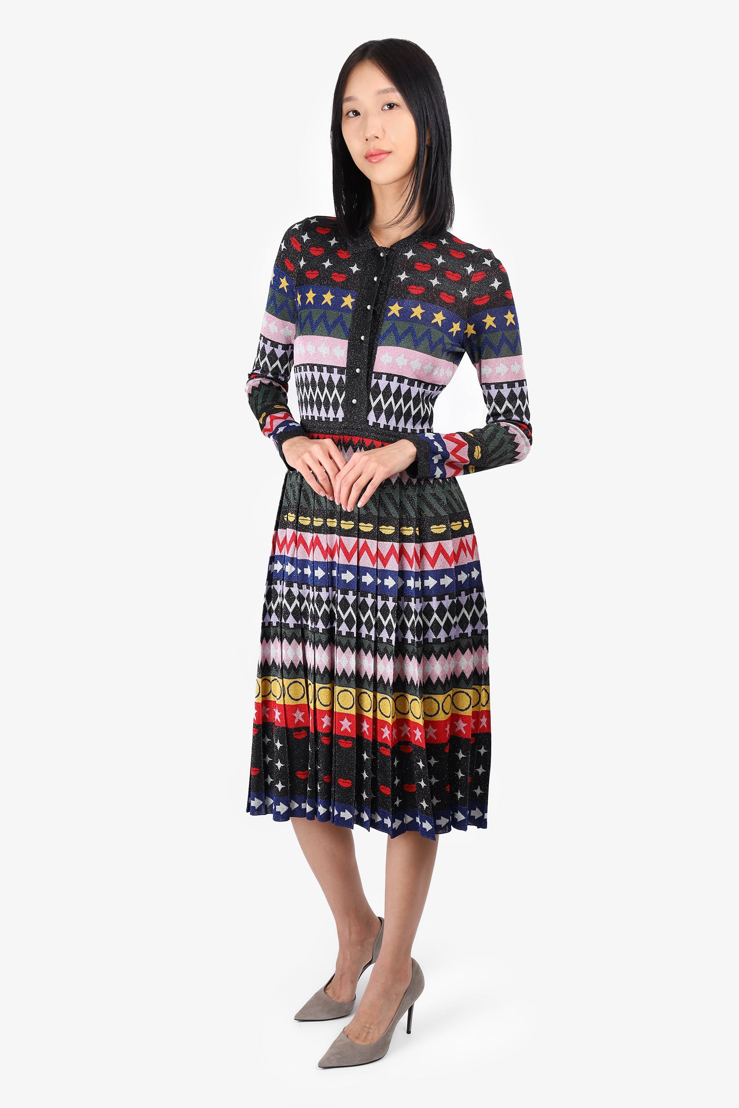 Refresh availabilityMary Katrantzou Metallic Pleated Dress. Front button up closure. Tonal stitching.