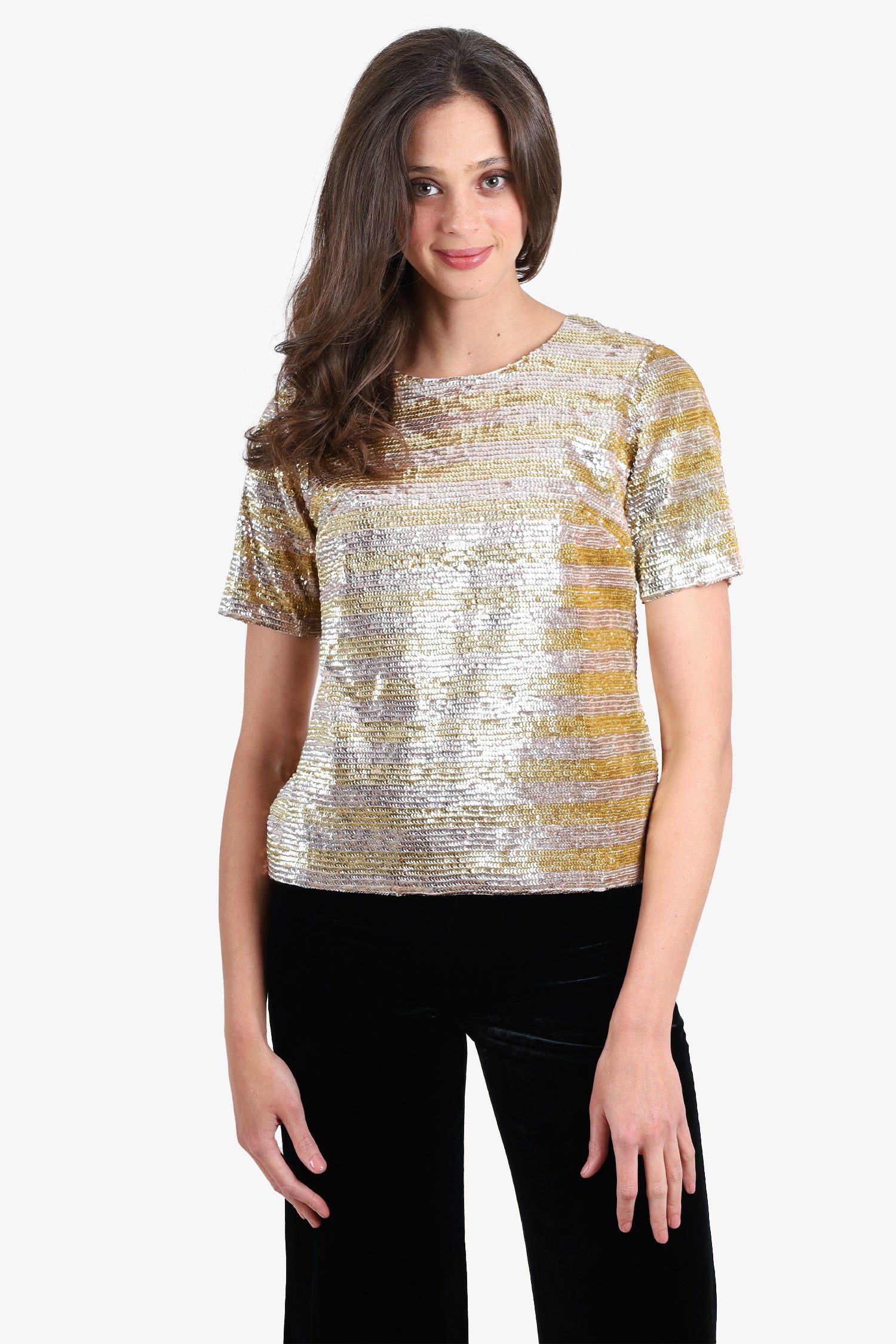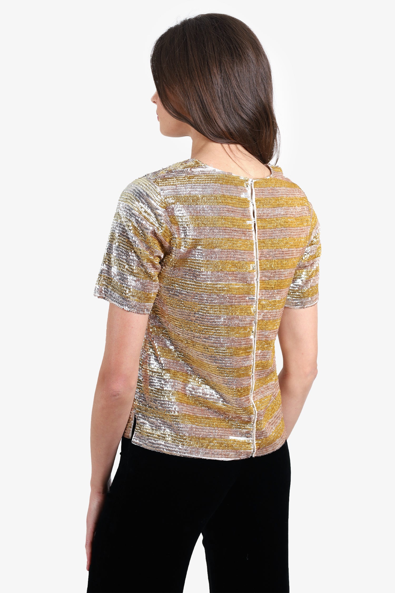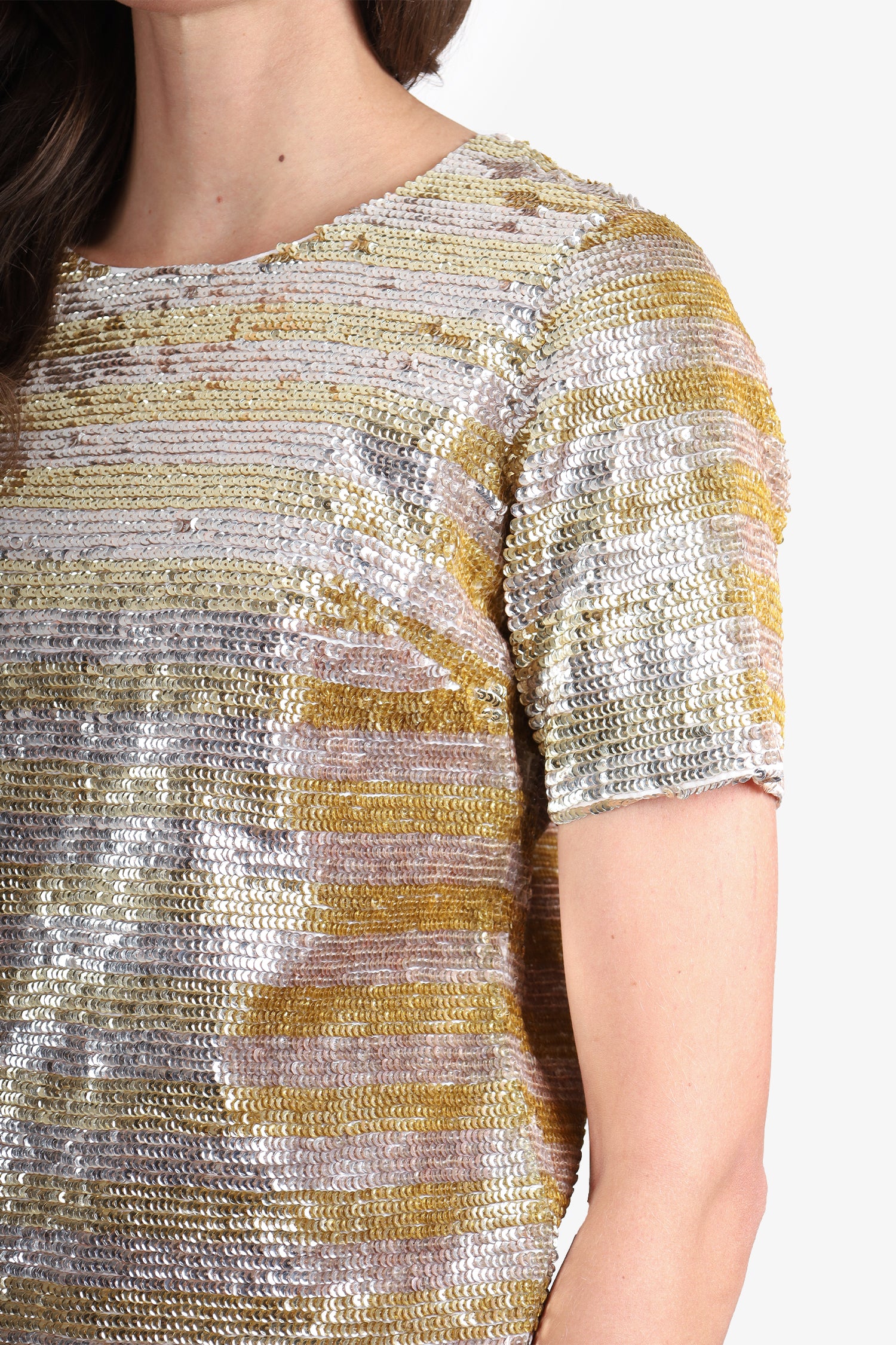 Refresh availabilityMassimo Alba Yellow/Pink Gold Stripes Sequin Short Sleeves. Round neck. Snap closure on back. Lined. Tonal stitching.