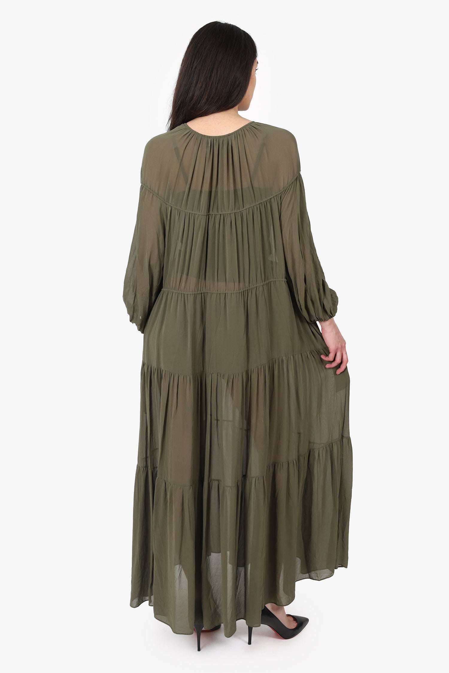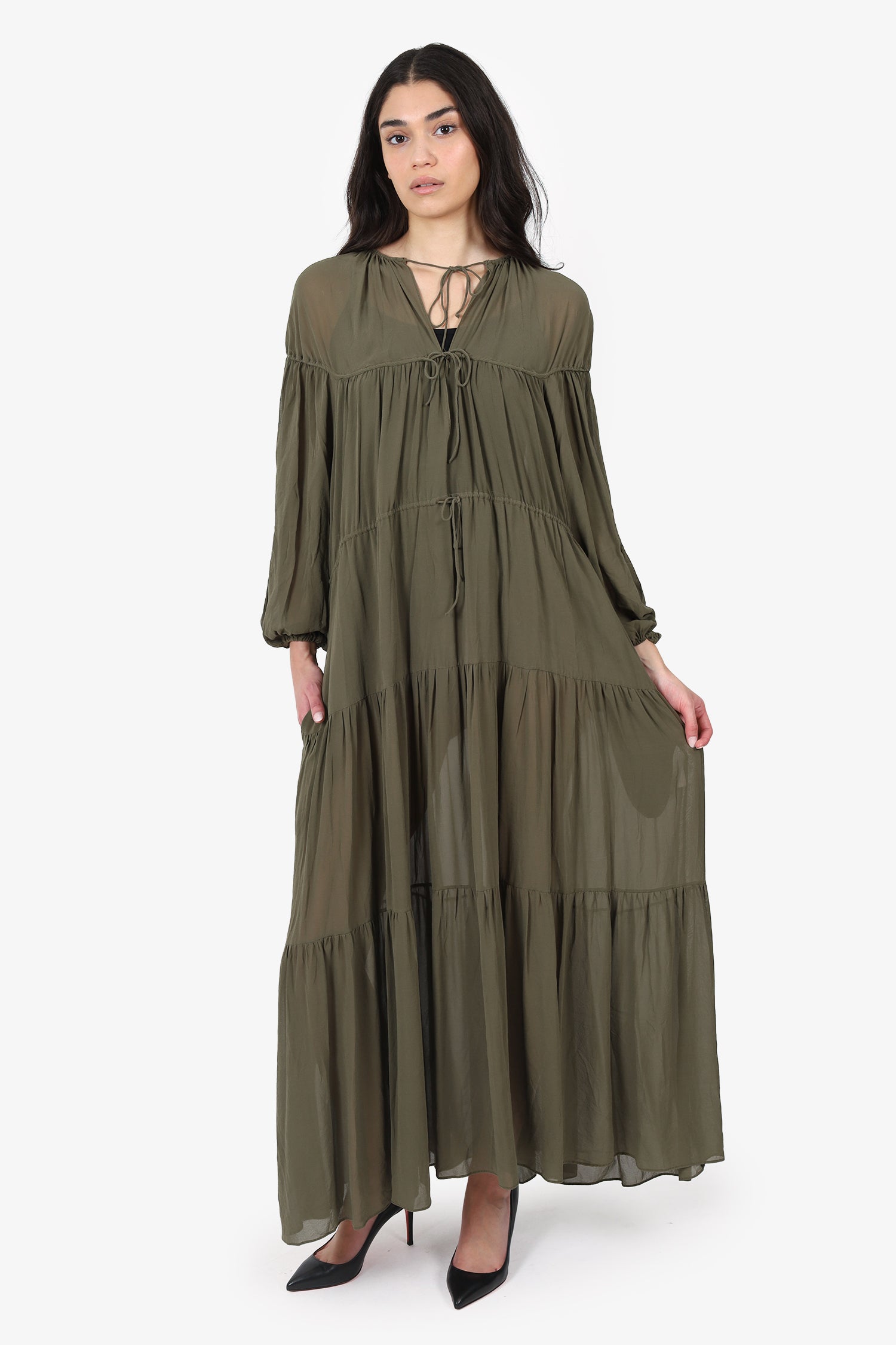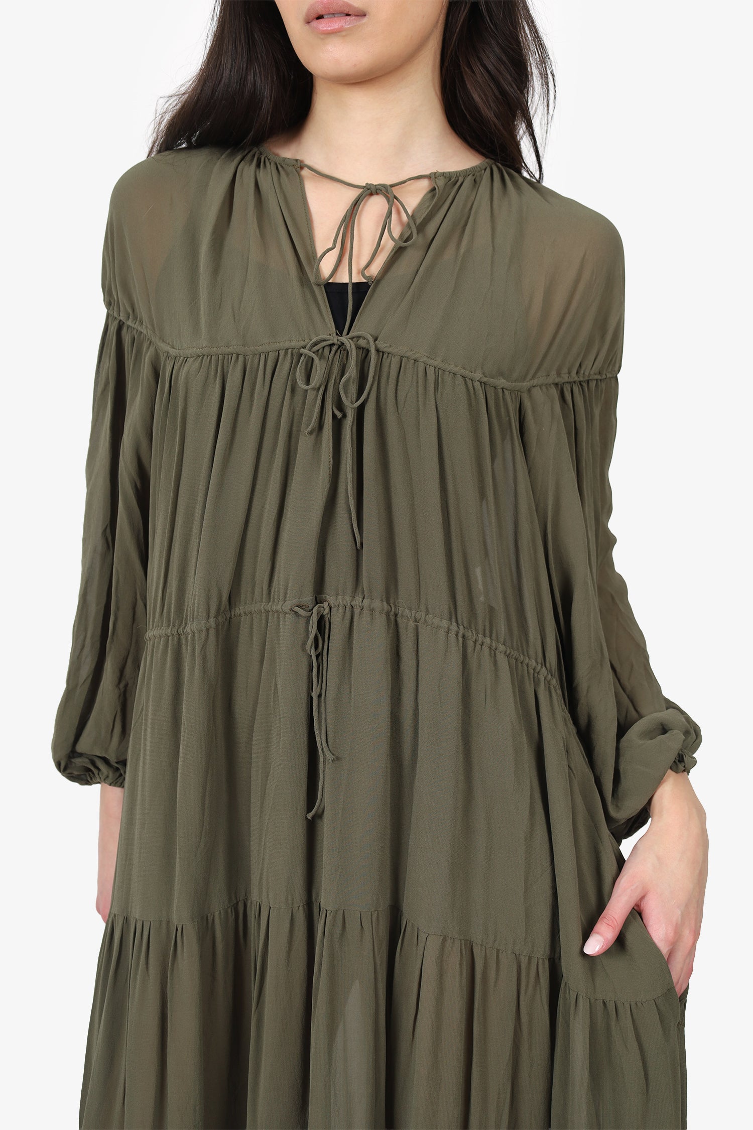 Refresh availabilityMatteau Khaki Green Silk Sheer Tiered Maxi Dress. Slip-on. Round neckline. Front tie-up closure. Waist cinch tie-up closure. 2 exterior side slip pockets. Elastic sleeve cuff. Tonal stitching.