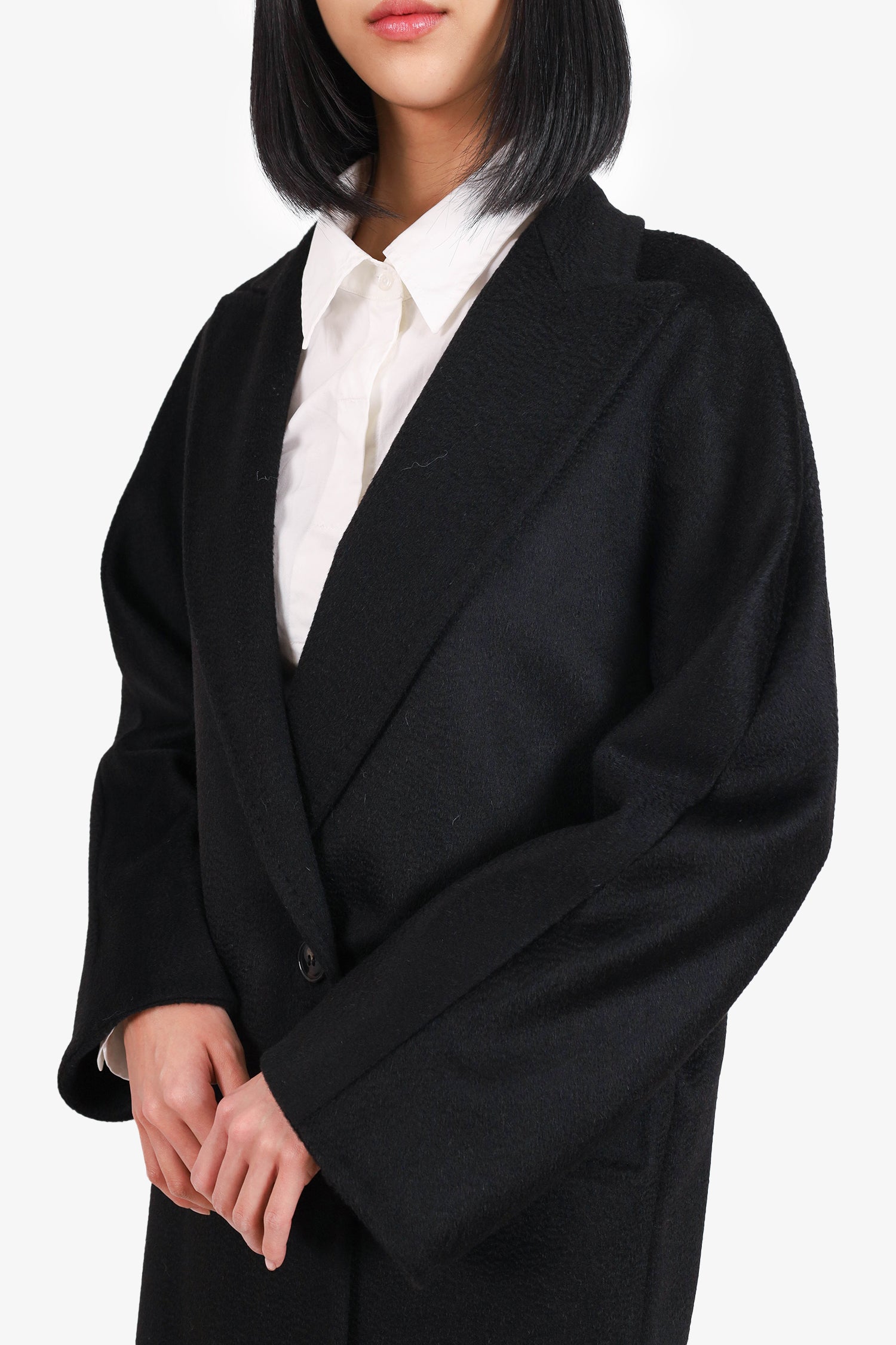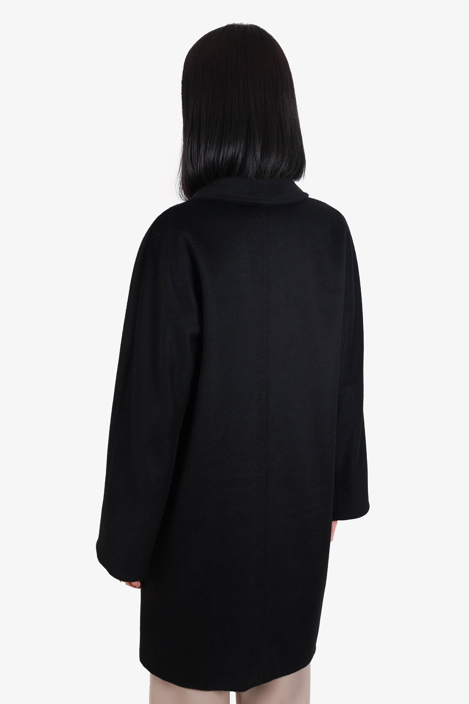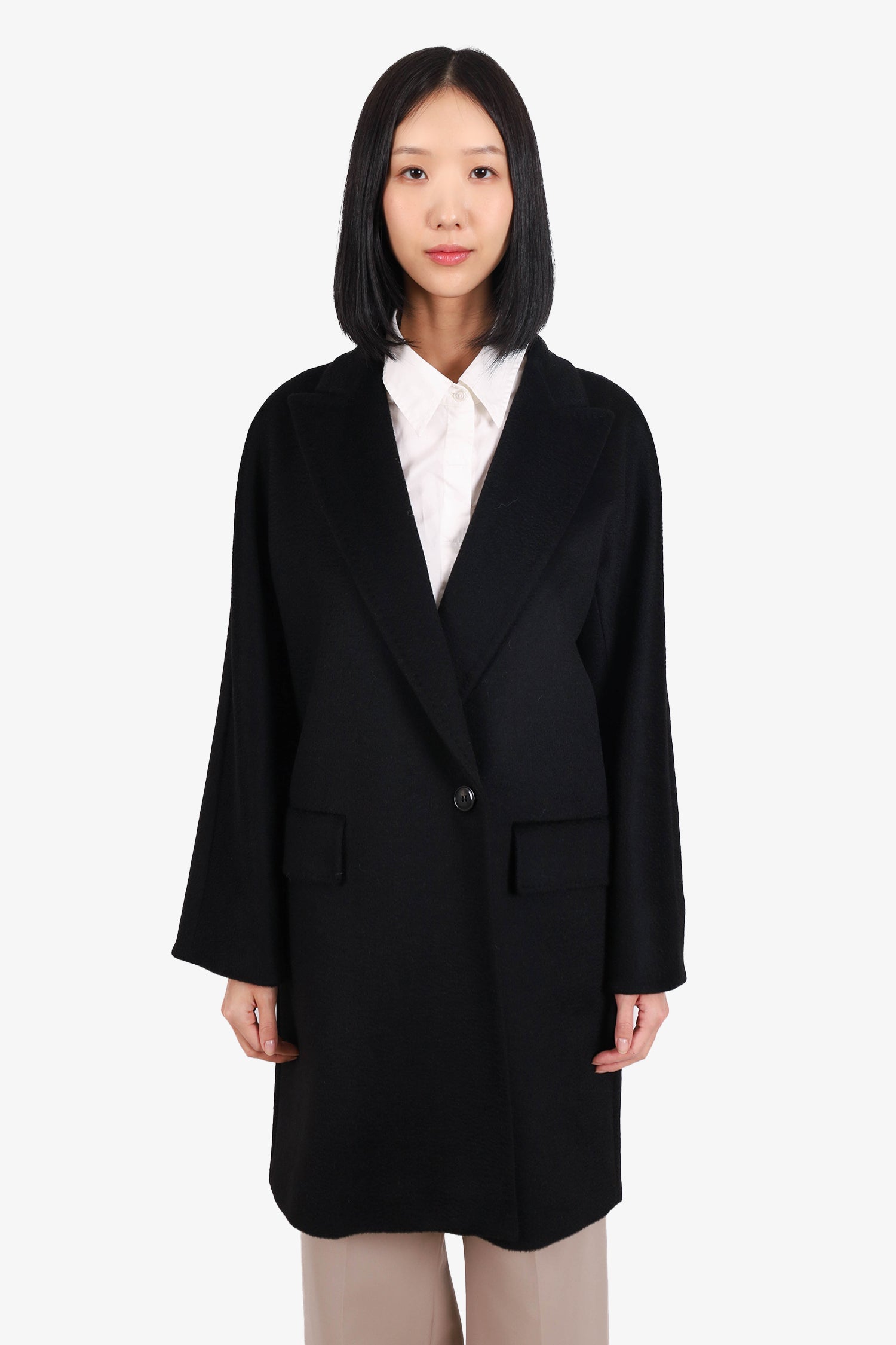 Refresh availabilityMax Mara Black Camel Hair Coat. Peaked lapel. Front button-up closure. 2 front fold-over flap slip pockets. Lined. Tonal stiching.
