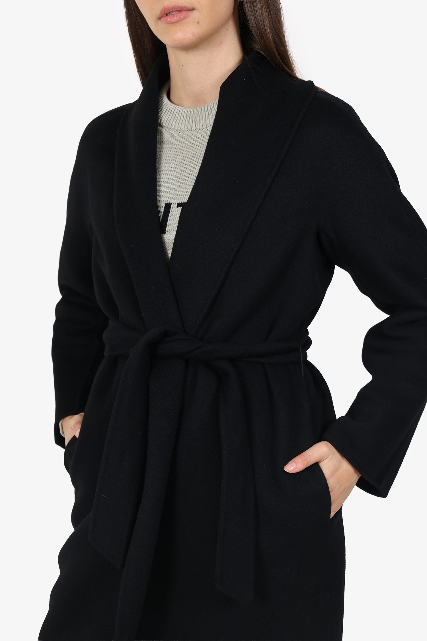 Refresh availabilityMax Mara Black Cashmere Long Belted Coat. Pull-on. Collared neckline. Open front with tie-up closure. 2 exterior side slip pockets. Tonal stitching.