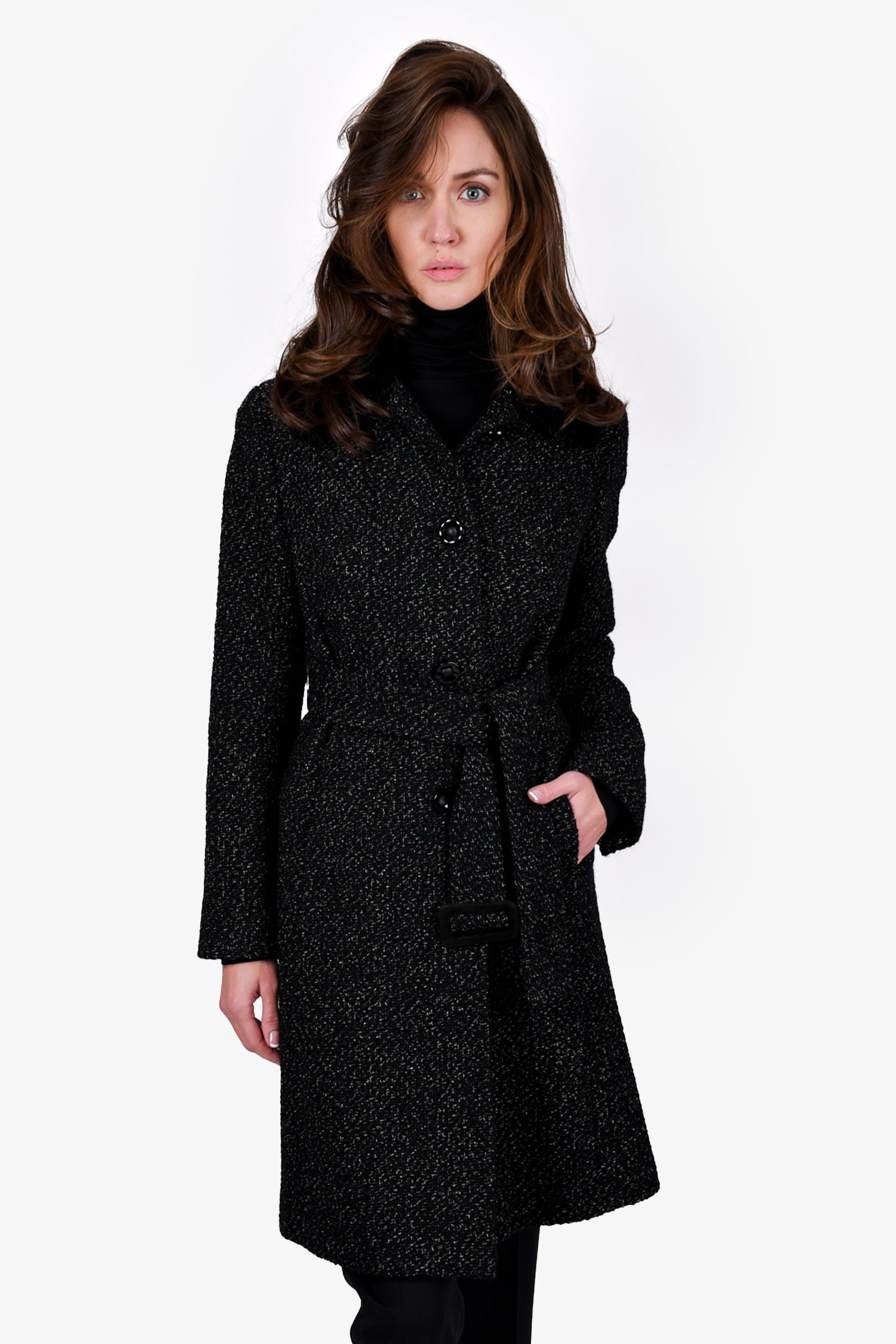 Max Mara Black/White Speckled Fur Collar Belted Coat. Front button-up closure. Lined. Front pockets. Tonal stitching.