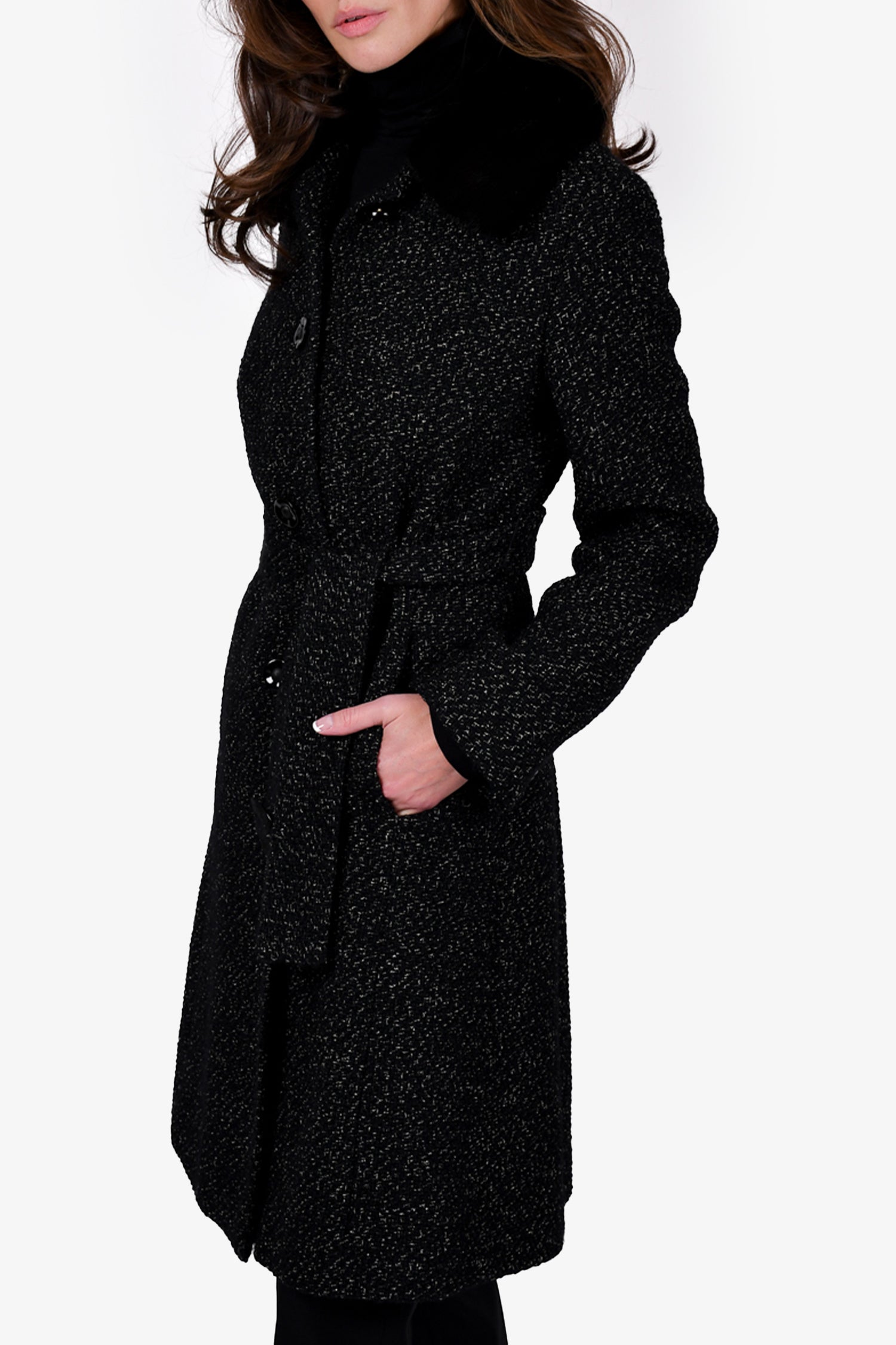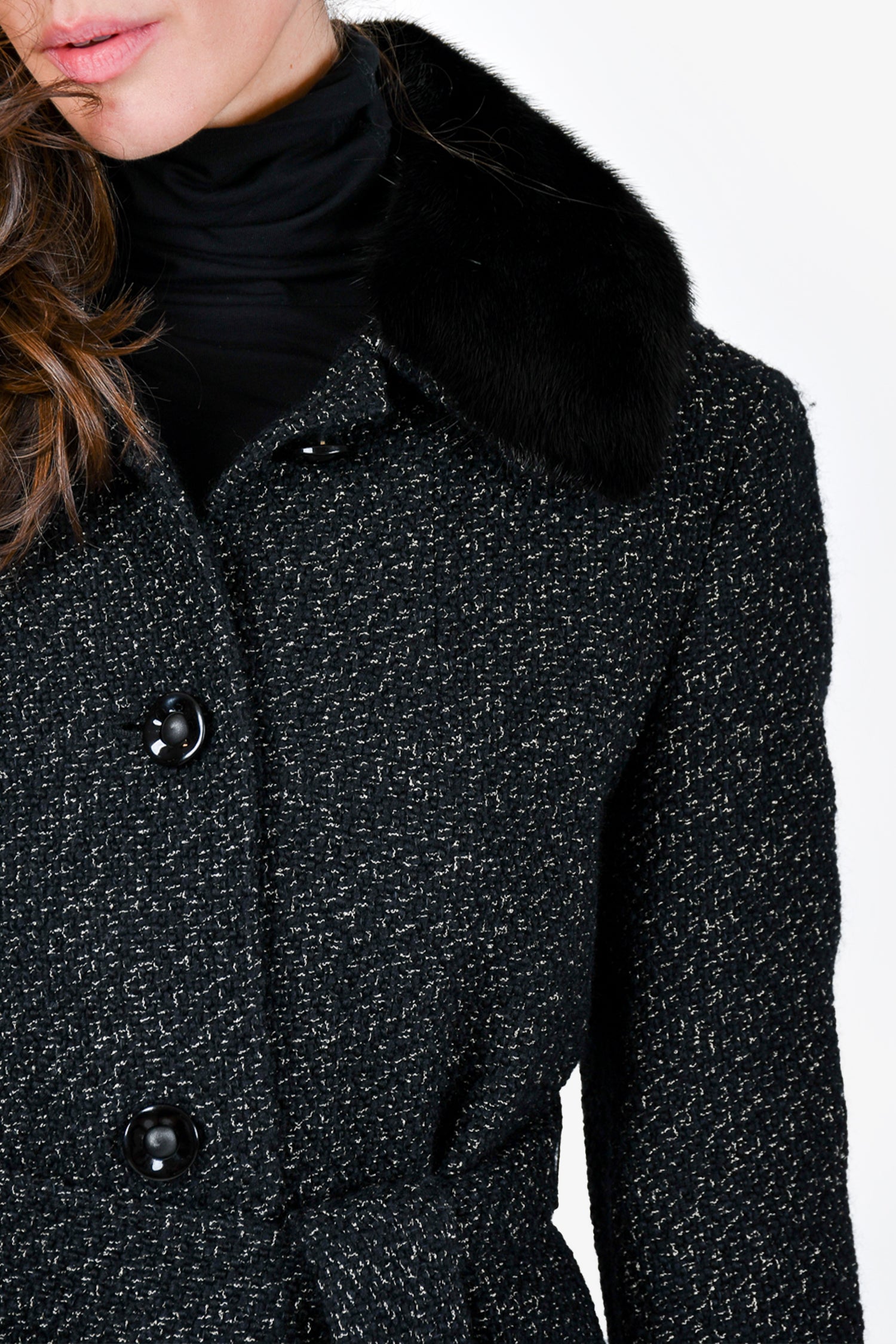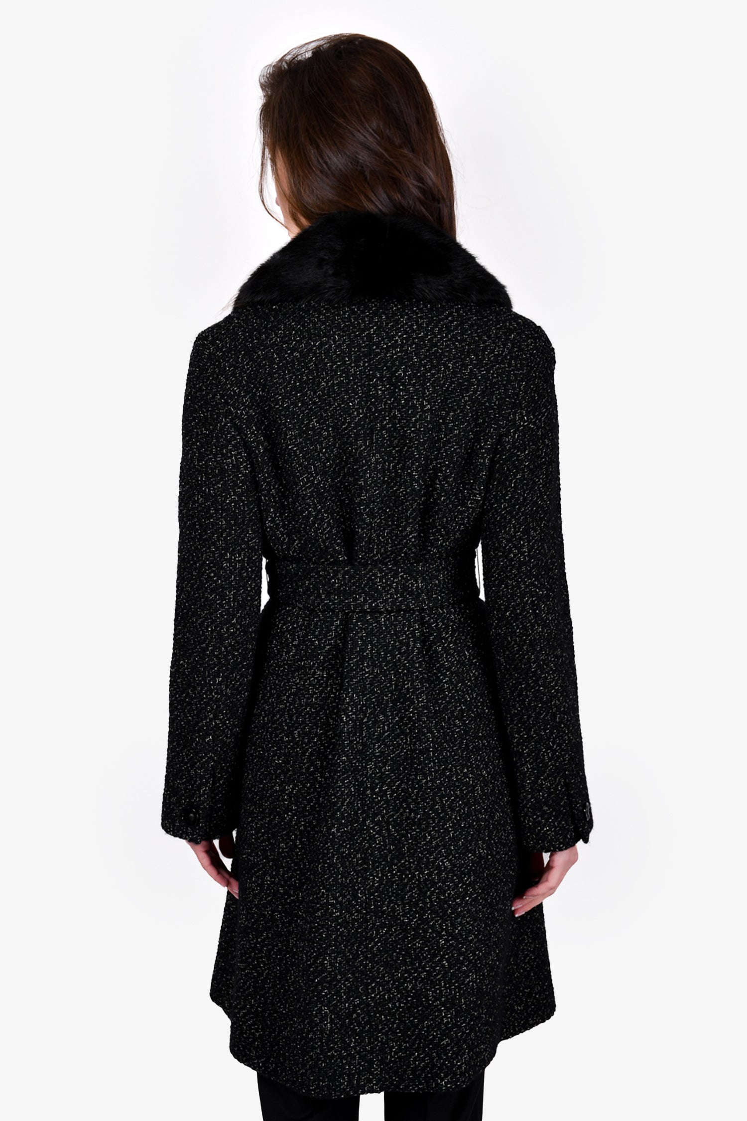Max Mara Black/White Speckled Fur Collar Belted Coat Est. Size S