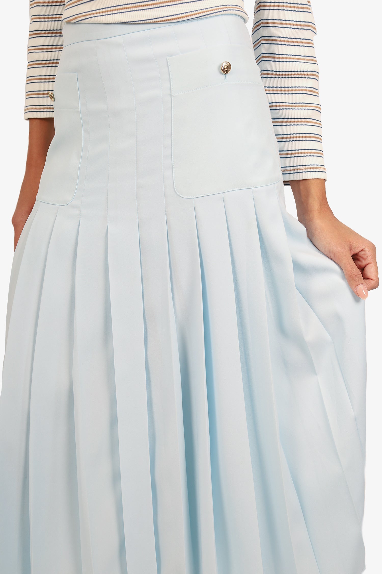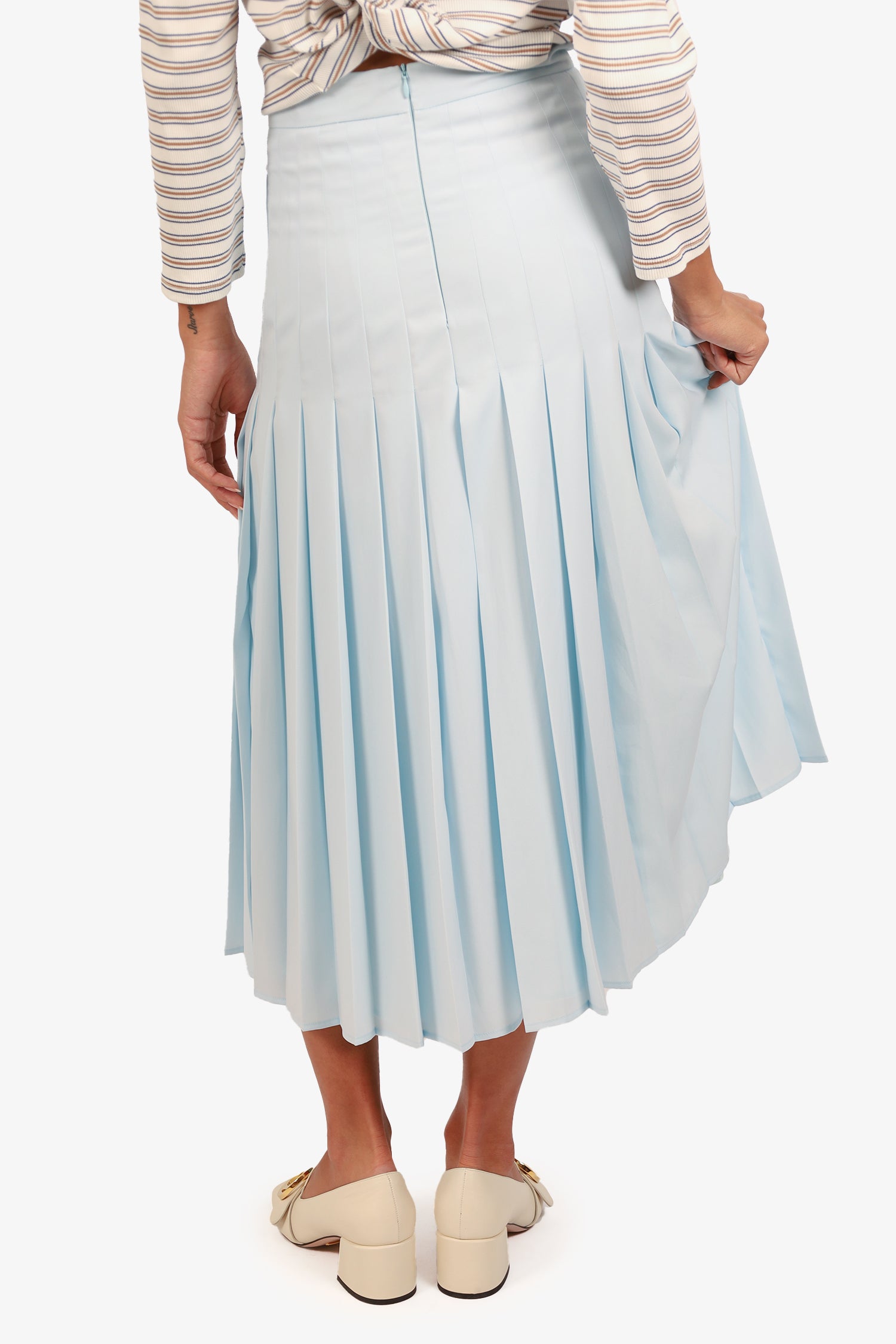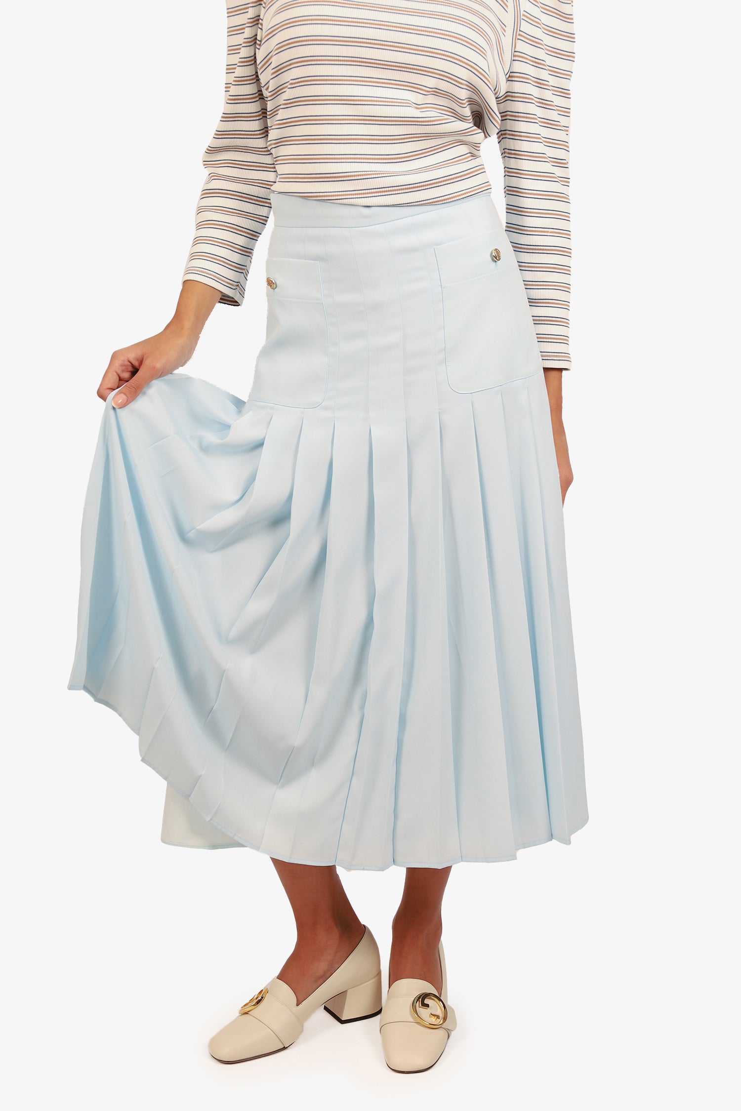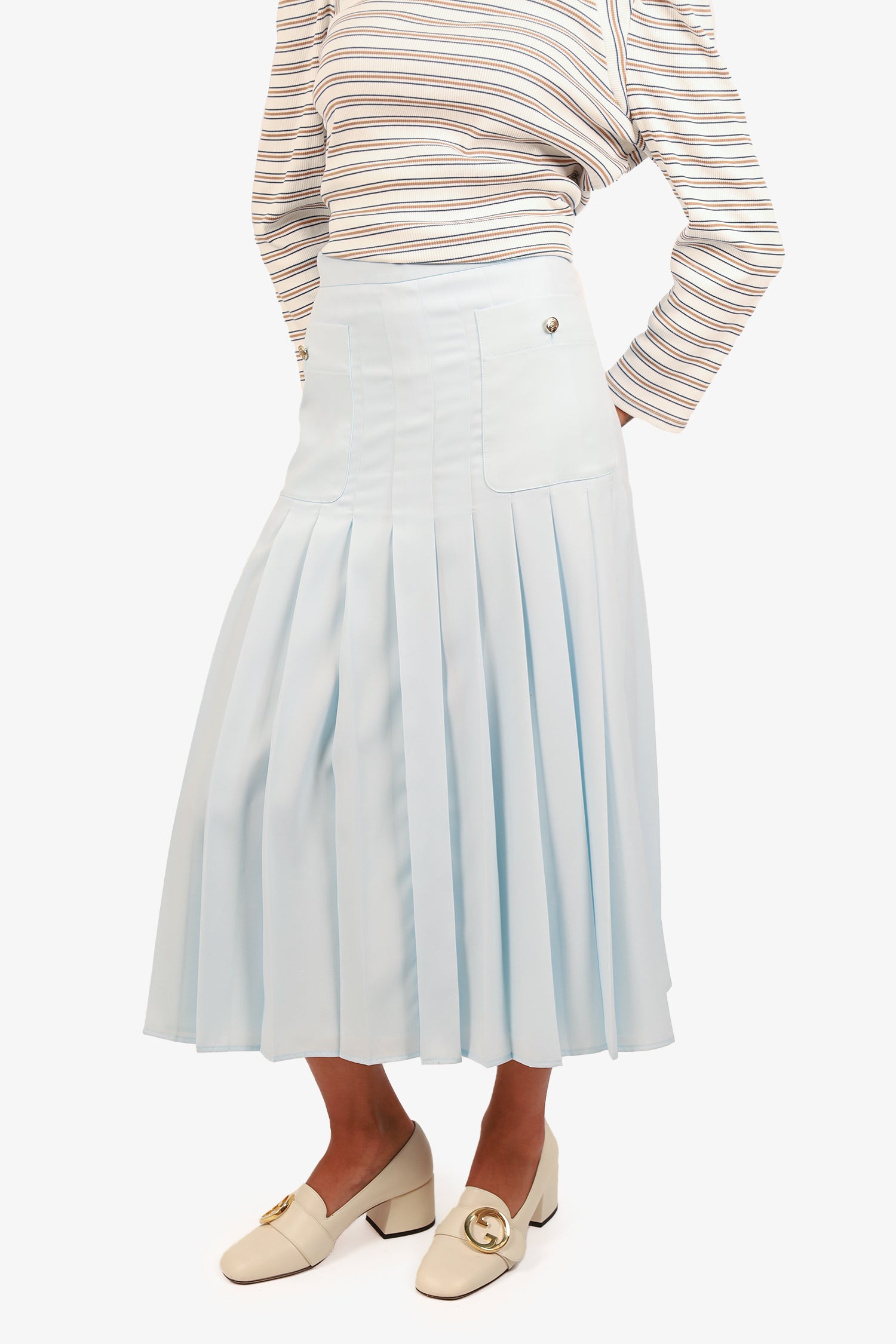 Refresh availabilityMax Mara Blue Pleated Front Pocket Midi Skirt. Slip-on. Rear zip with hook closure. 2 front exterior pockets with button closure. Attached interior lined slip. Silver-tone hardware. Tonal stitching.