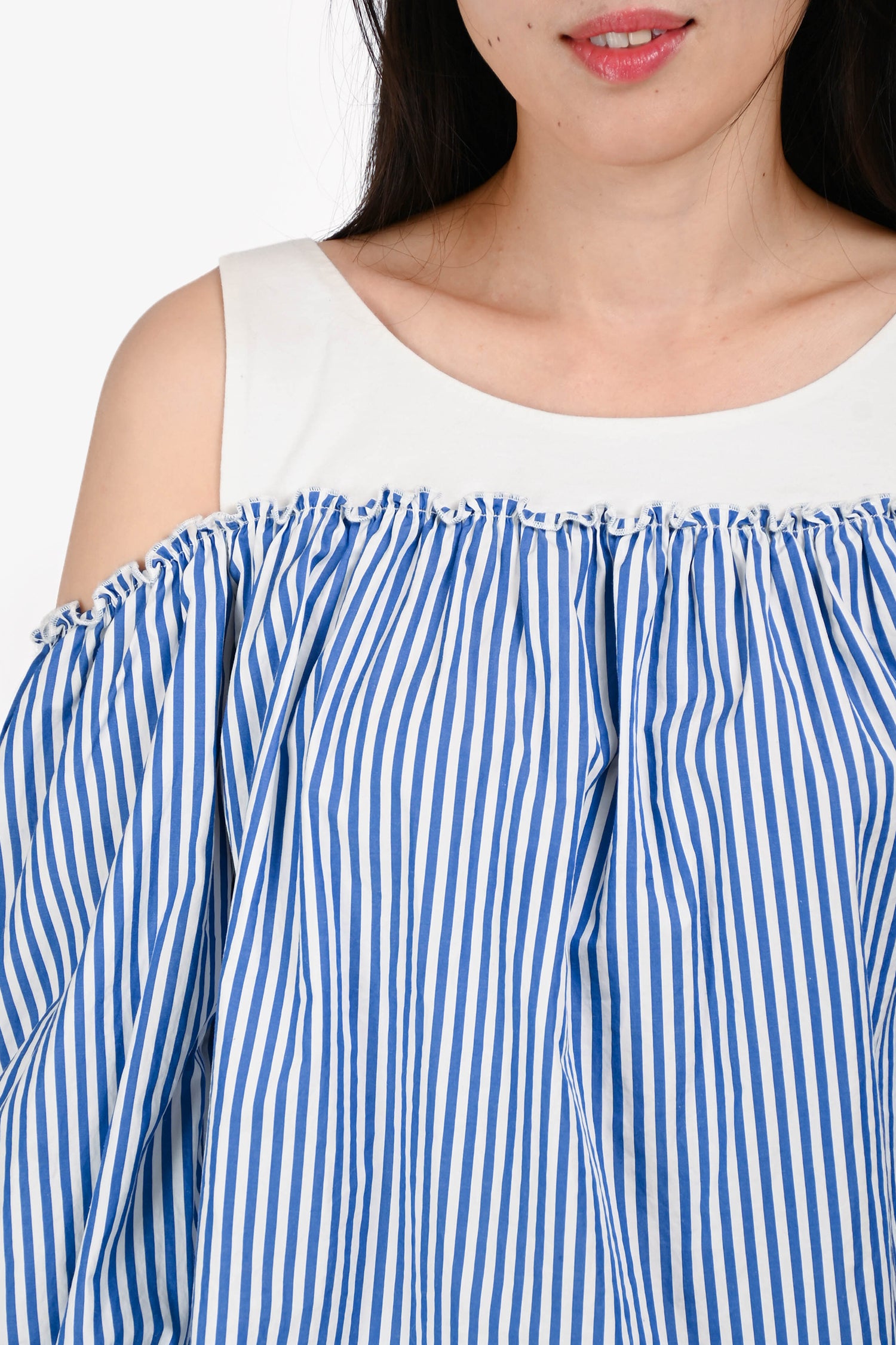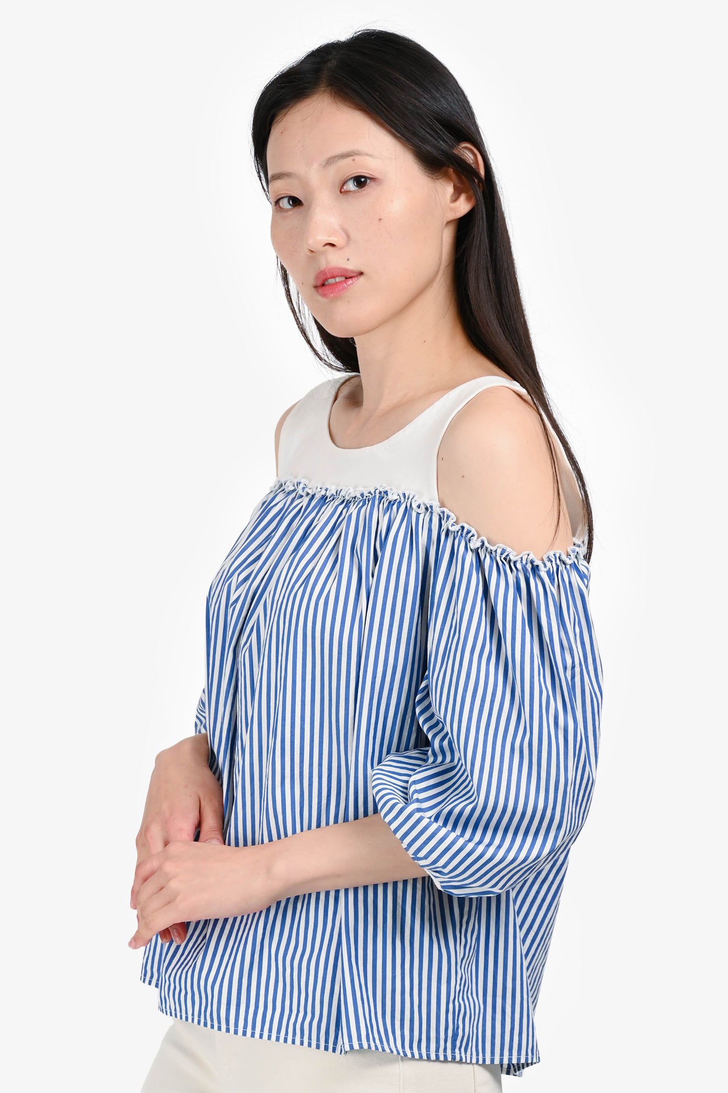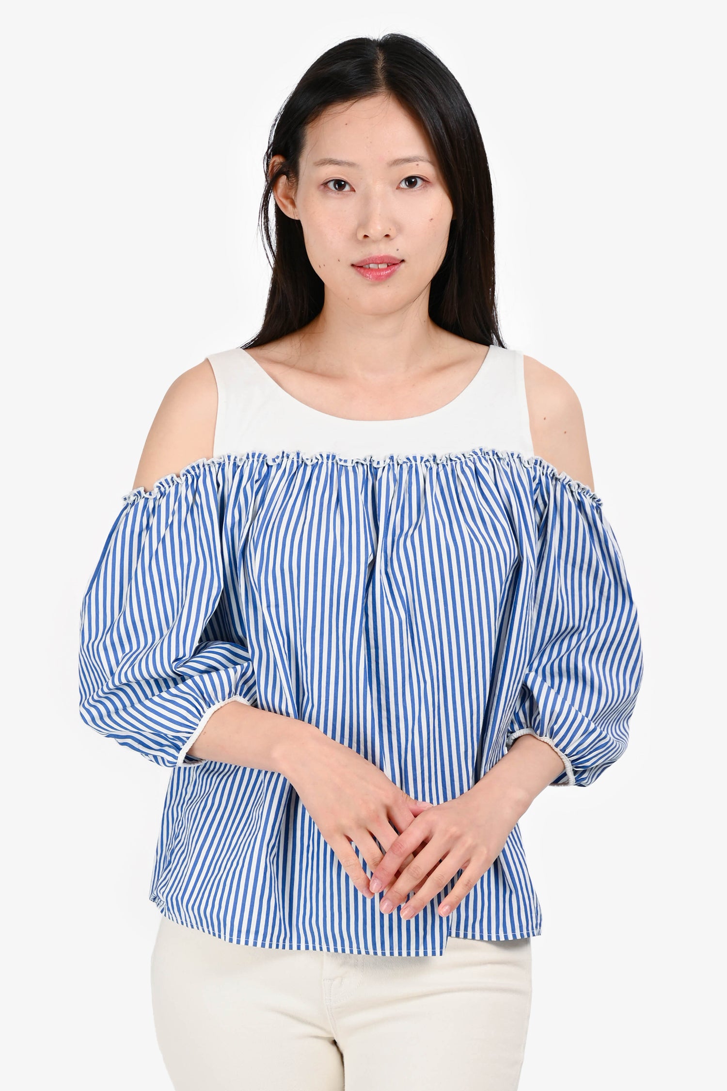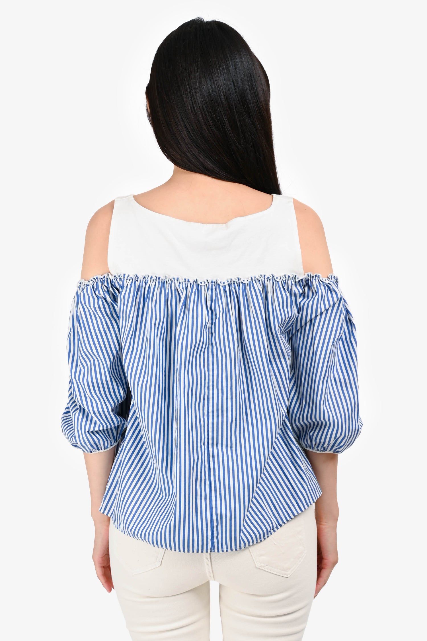 Refresh availabilityMax Mara Blue/White Stripe 3/4 Length Sleeve Off Shoulder Top. Round neck. Pull-on.