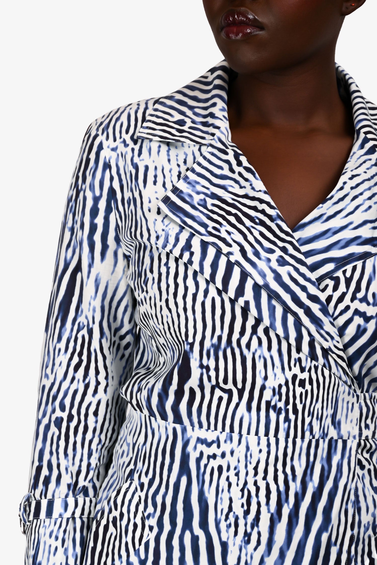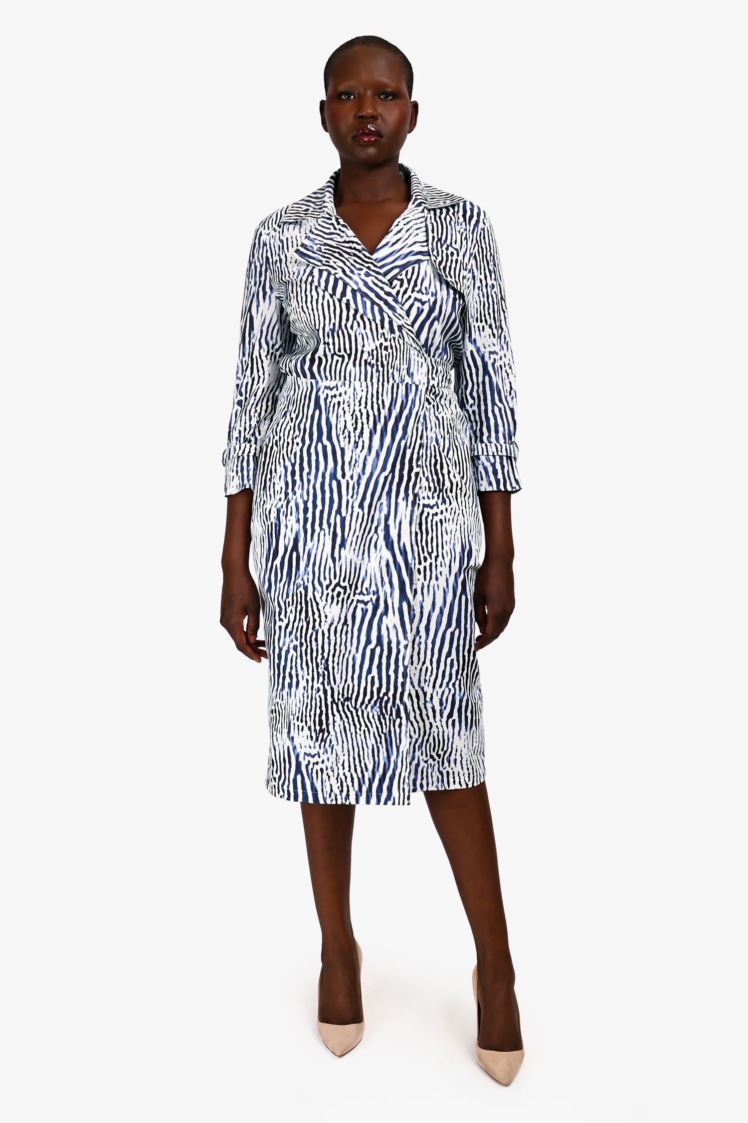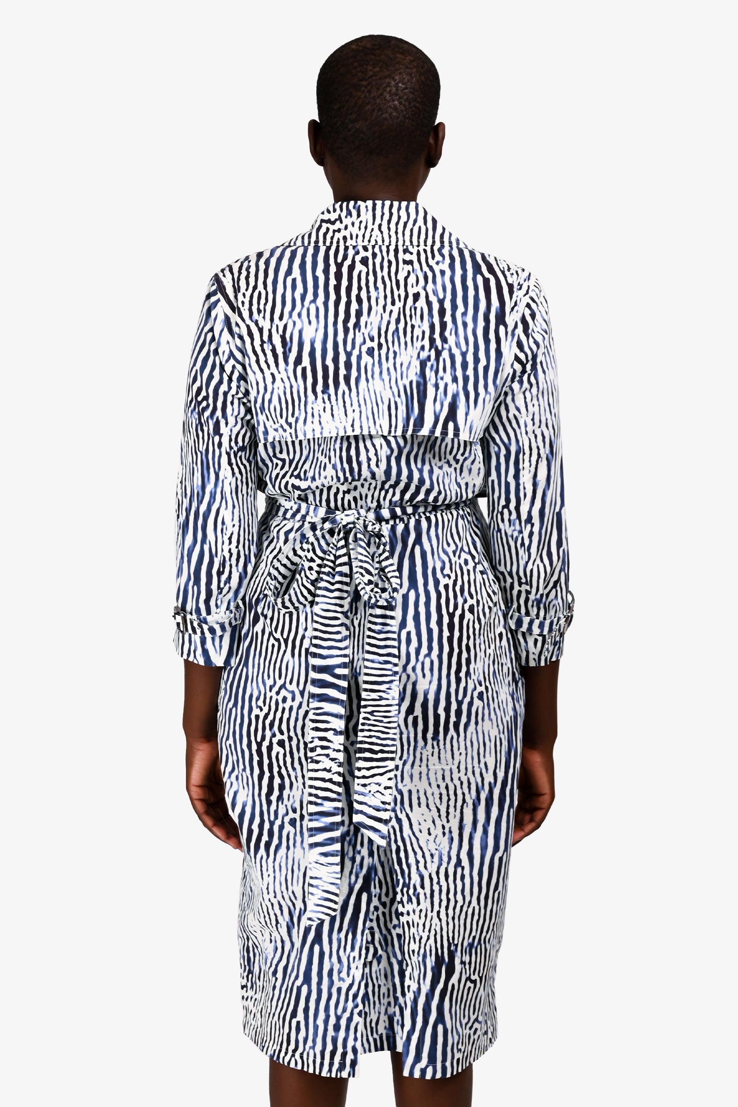 Refresh availabilityMax Mara Blue/White Zebra Printed Trench Style Wrap Dress. Pull-on. Notched lapel collar. Wrap front with removable tie closure. Cuffs with adjustable buckle detail. 2 exterior slip pockets. Lined interior. Silver-tone hardware. Tonal stitching.