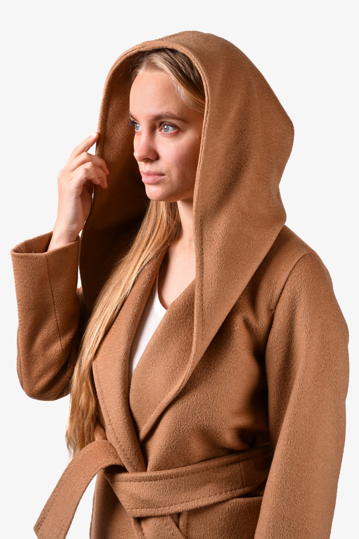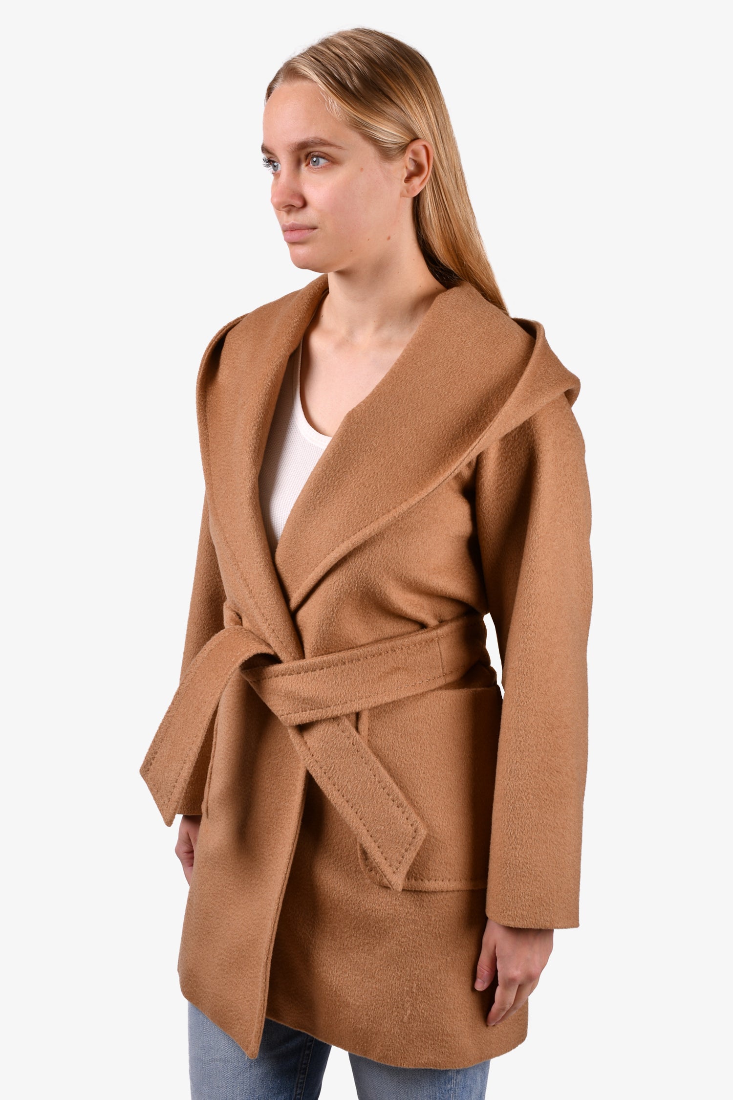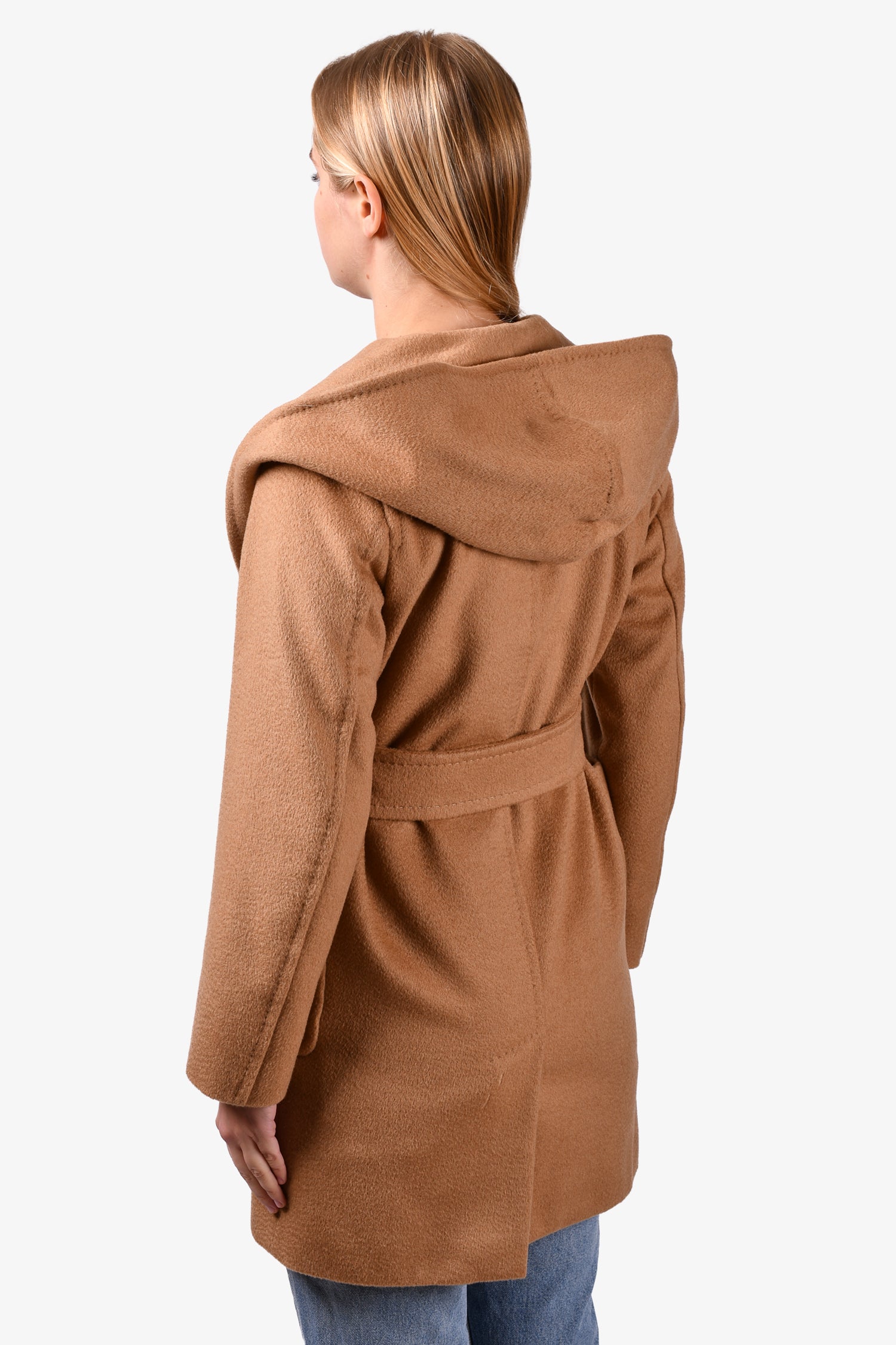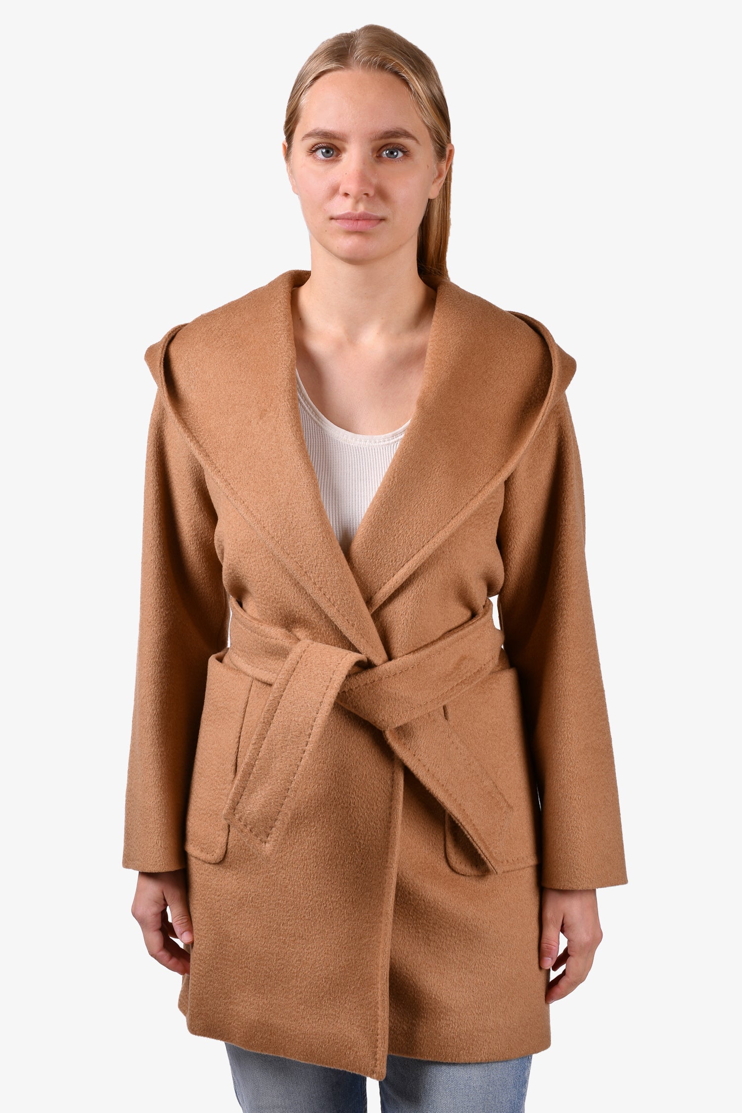 Refresh availabilityMax Mara Brown Camel Hair Belted Coat. Open front. Front pockets. Lined. Tonal stitching.