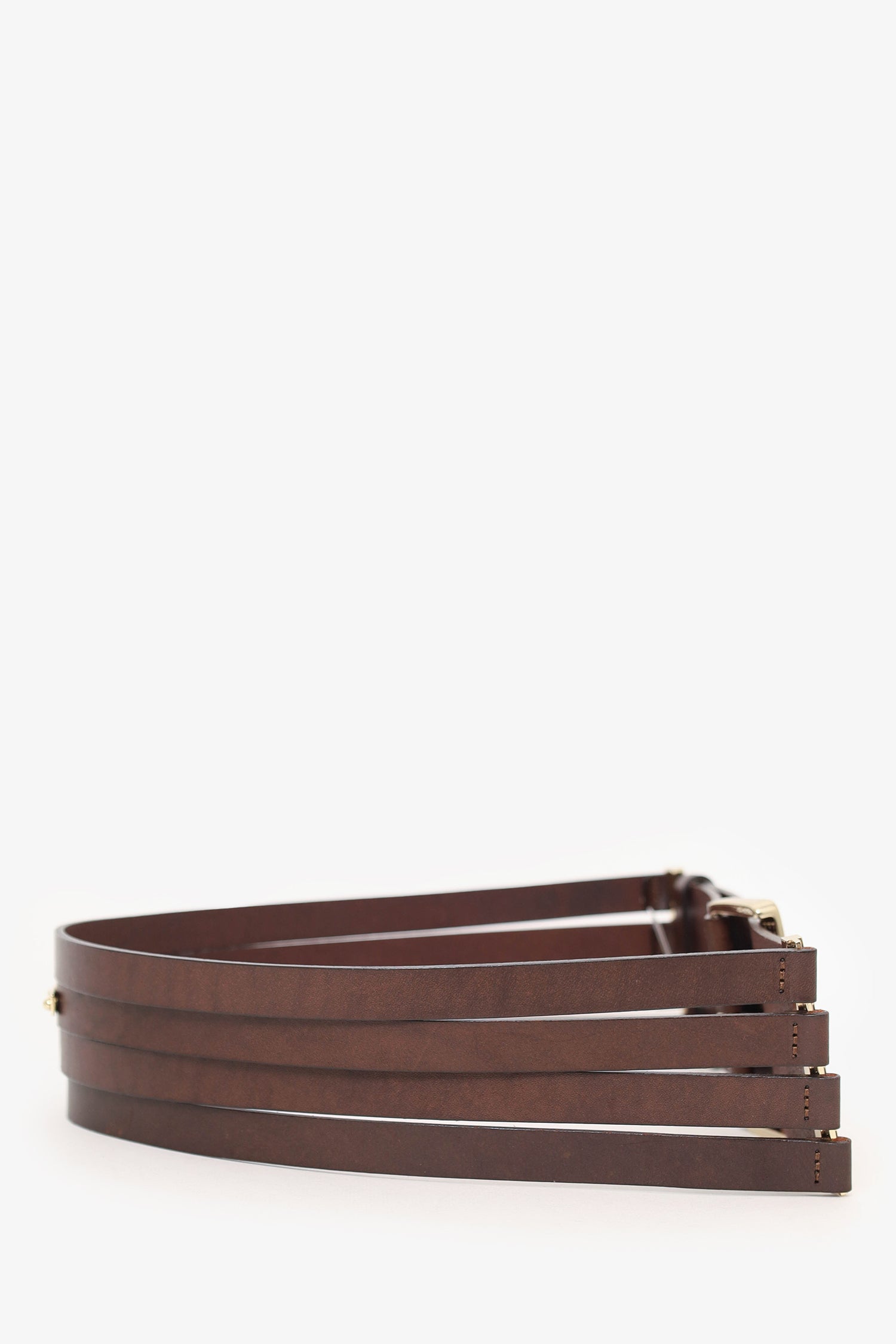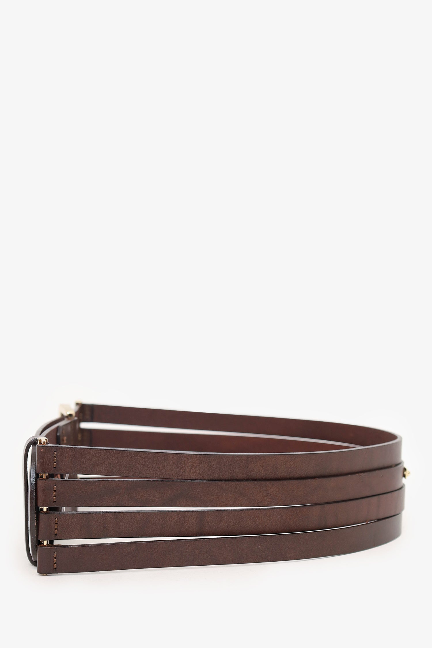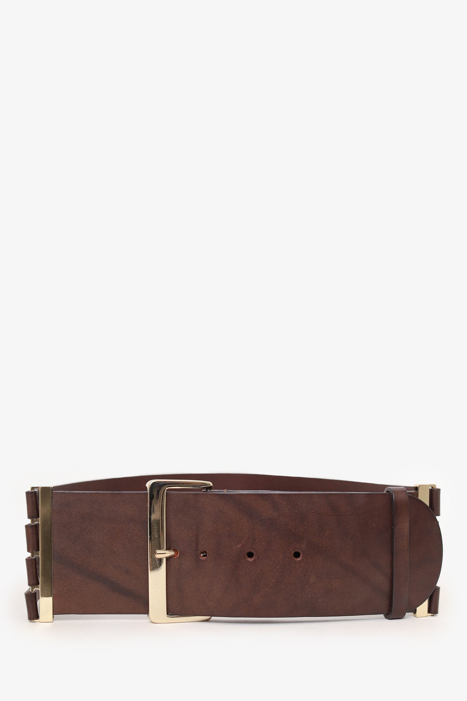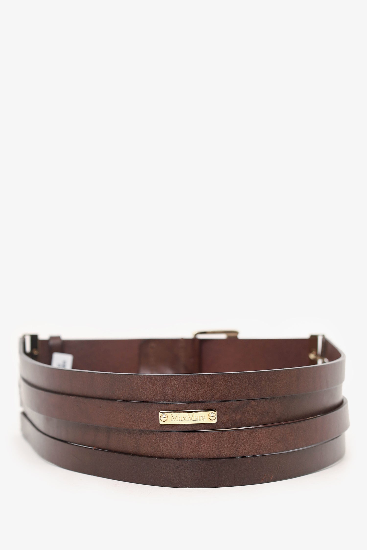 Refresh availabilityMax Mara Brown Leather Wide Belt. Adjustable pull through buckle closure. Gold-tone hardware. Tonal stitching.