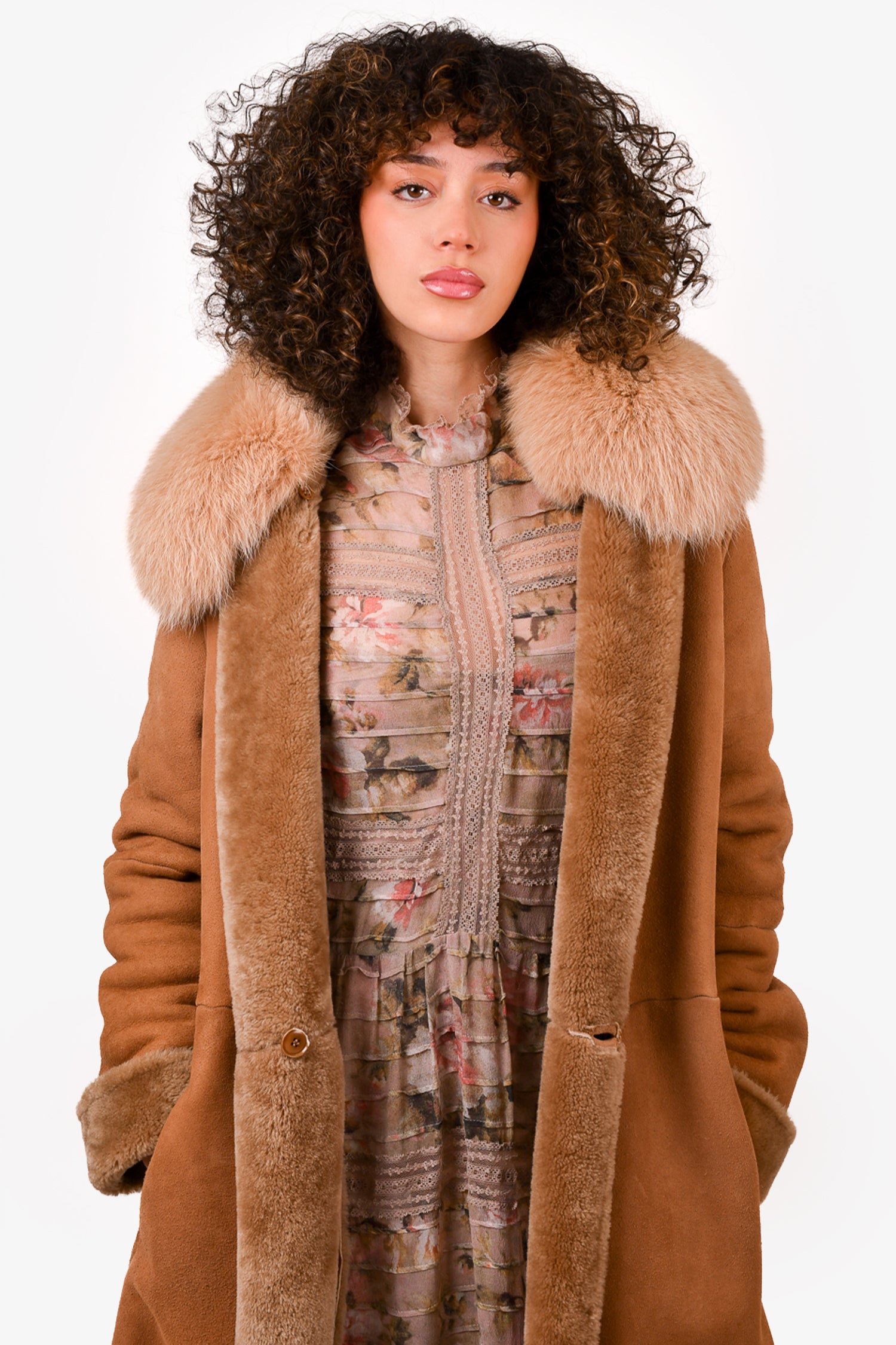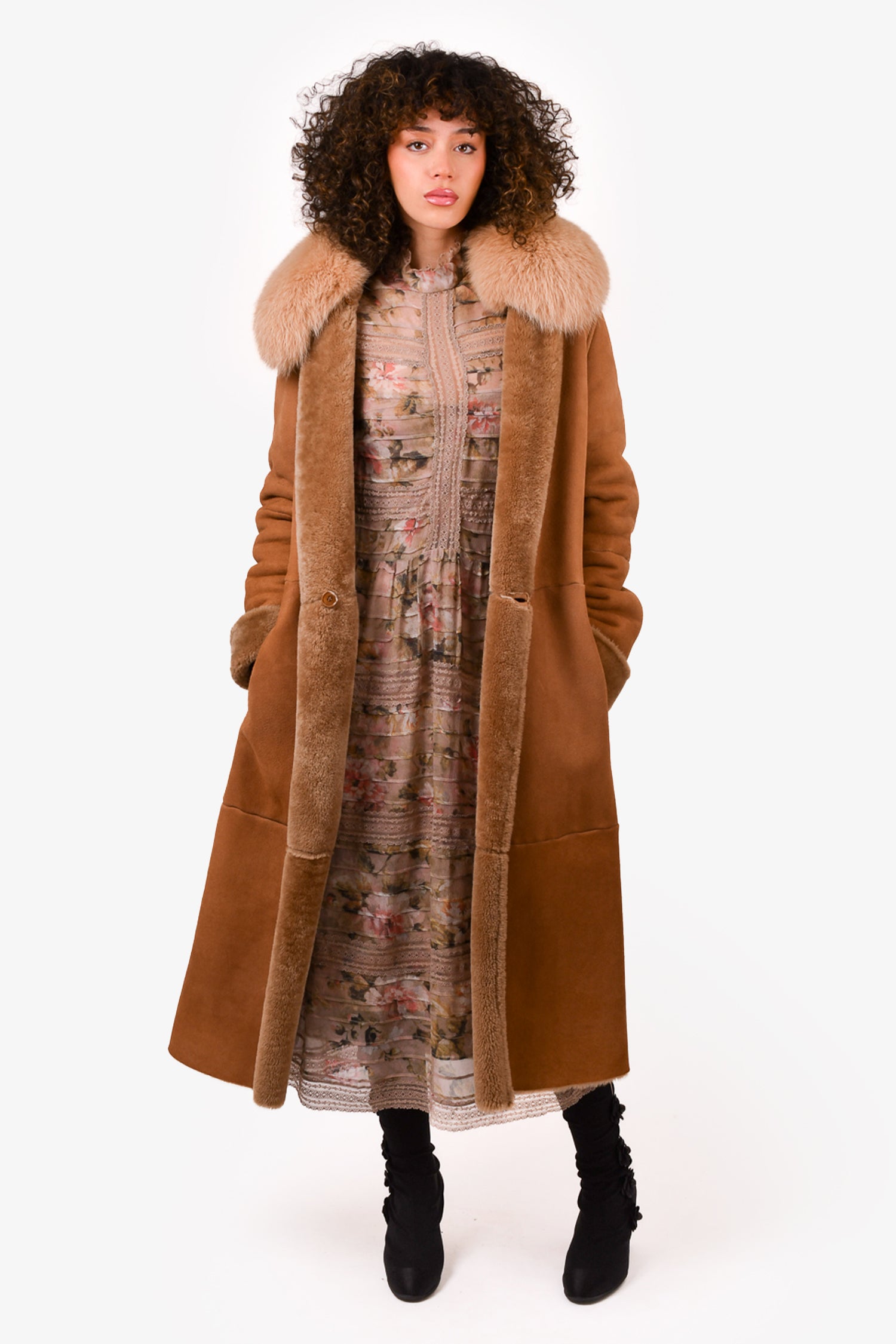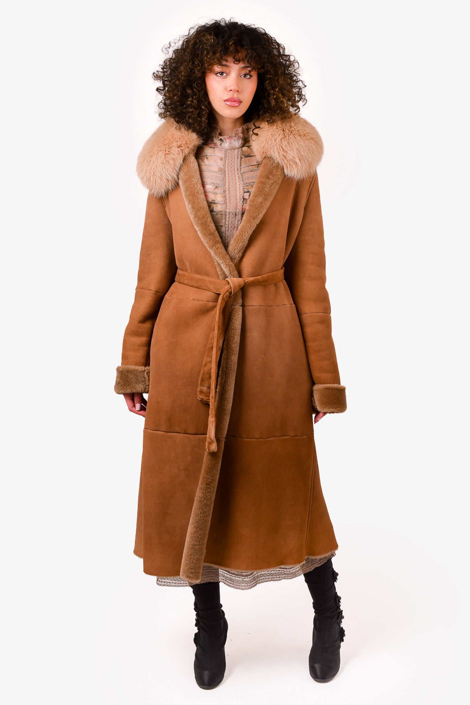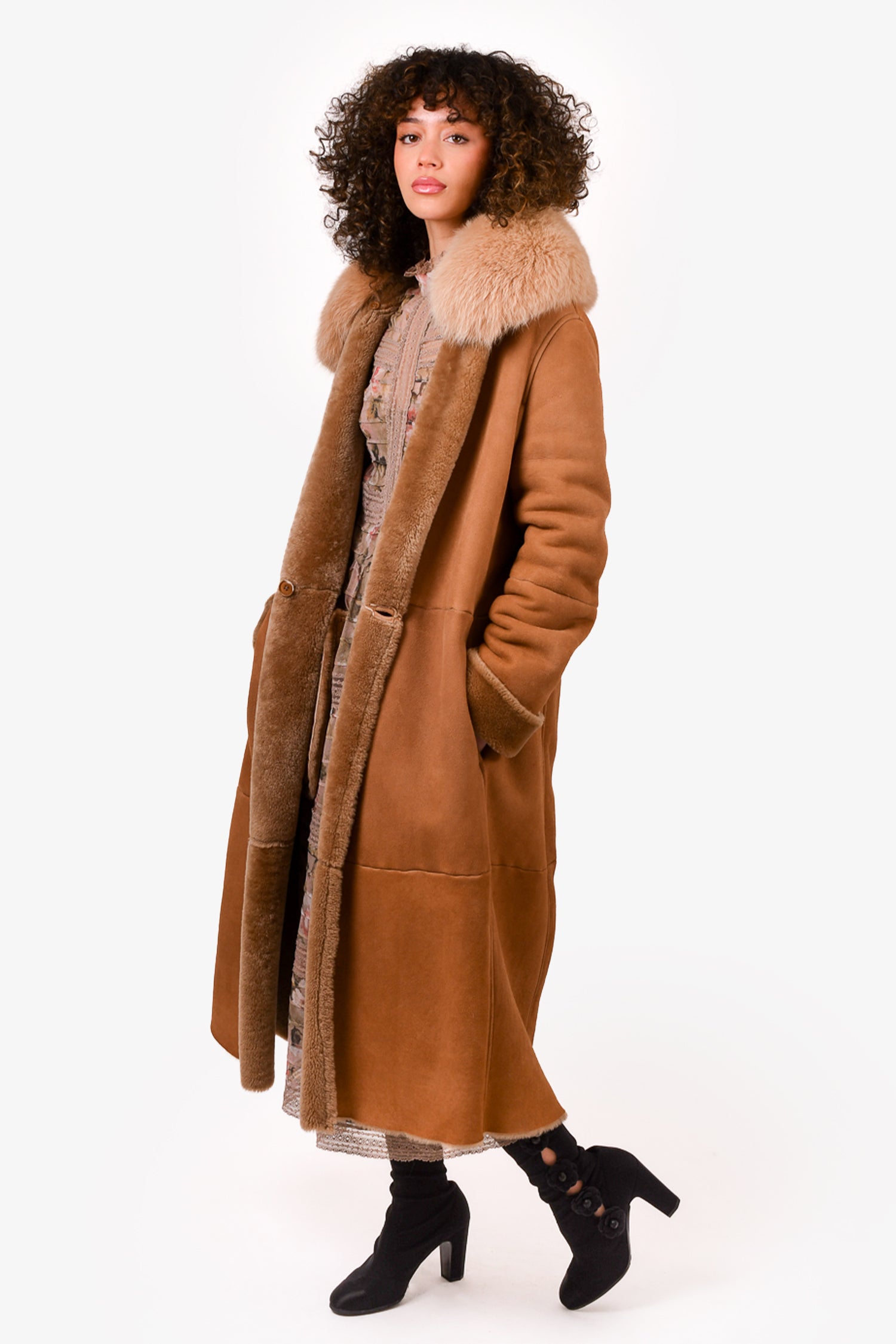 Refresh availabilityMax Mara Brown Suede Shearling Lined Coat with Fur Collar. Single interior front button closure. Front pockets. Waist belt. Tonal stitching.