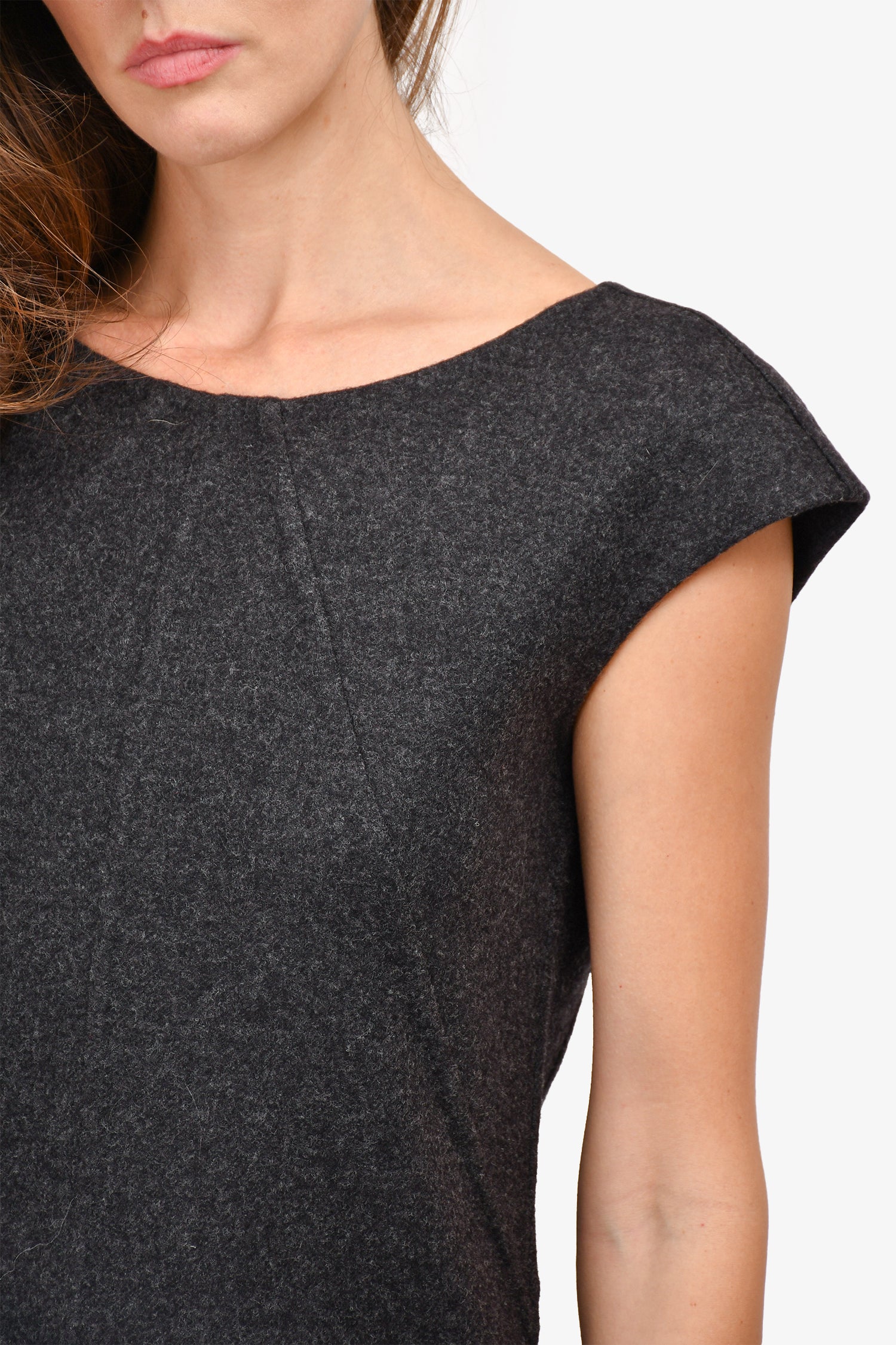 Refresh availabilityMax Mara Dark Grey Wool/Angora Cap Sleeve Shift Dress. Round neckline. Back zipper closure. Cap cut sleeves. Tonal stitching.