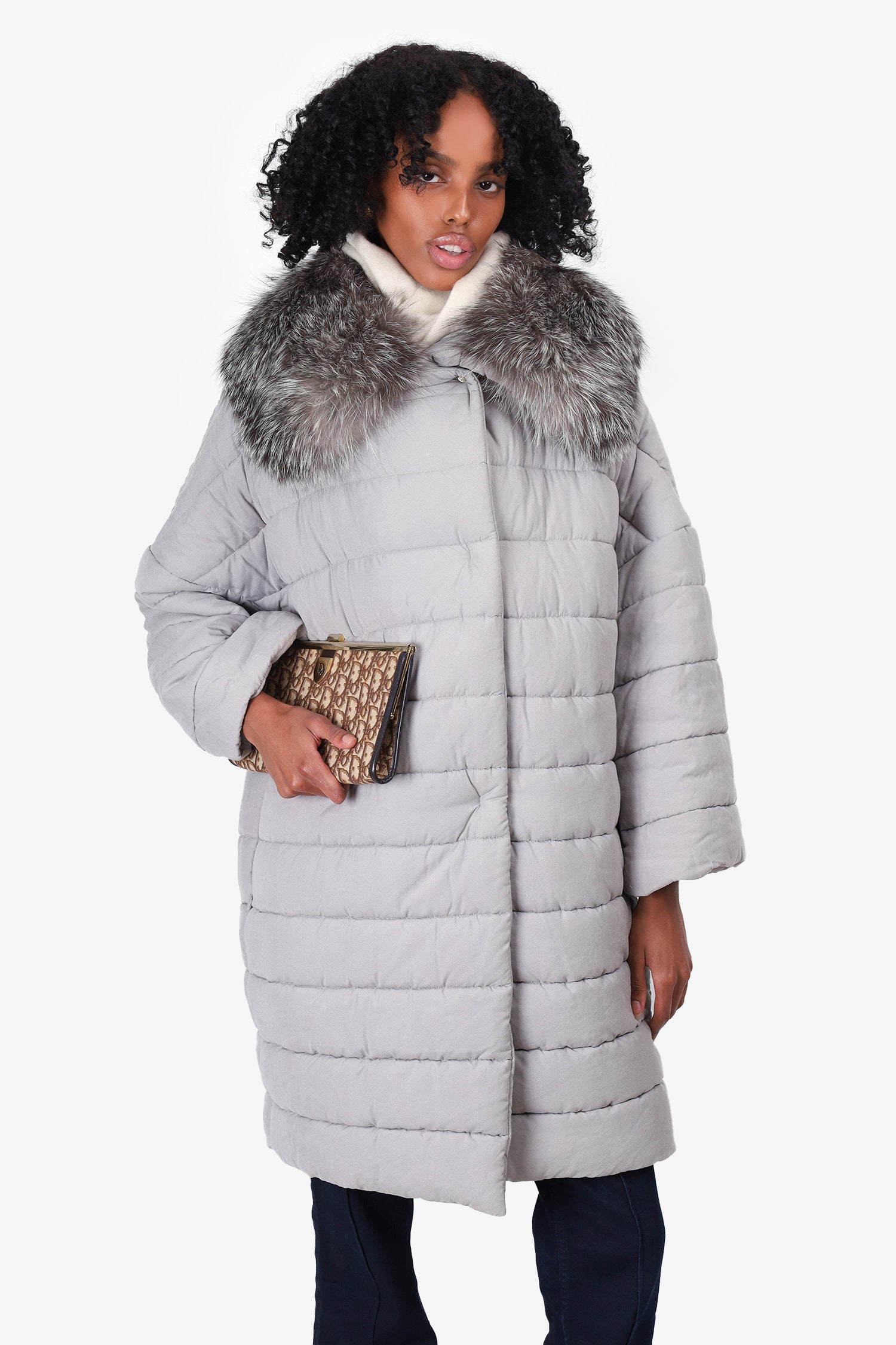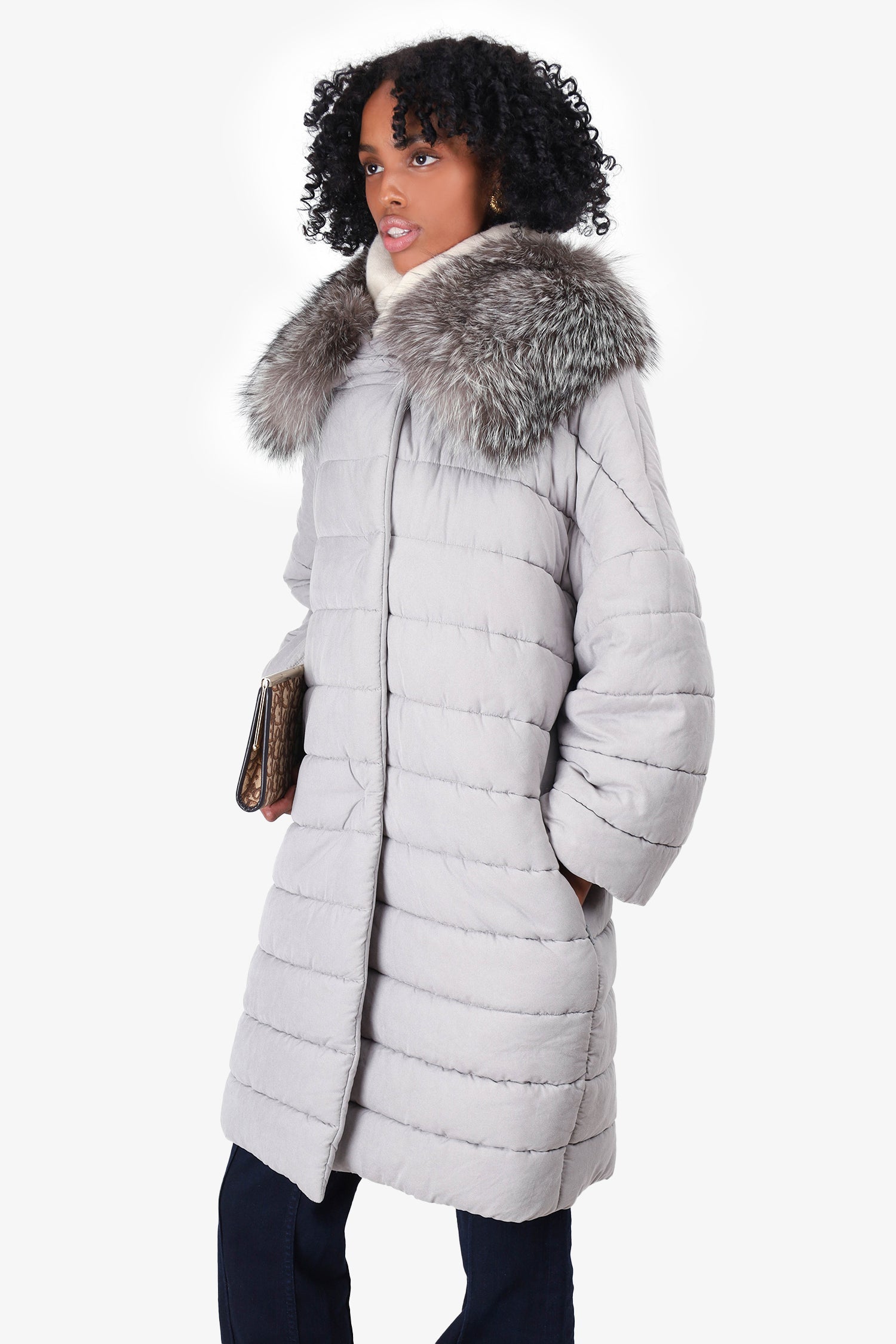 Max Mara Grey Long Puffer Jacket with Fur Collar Size 4