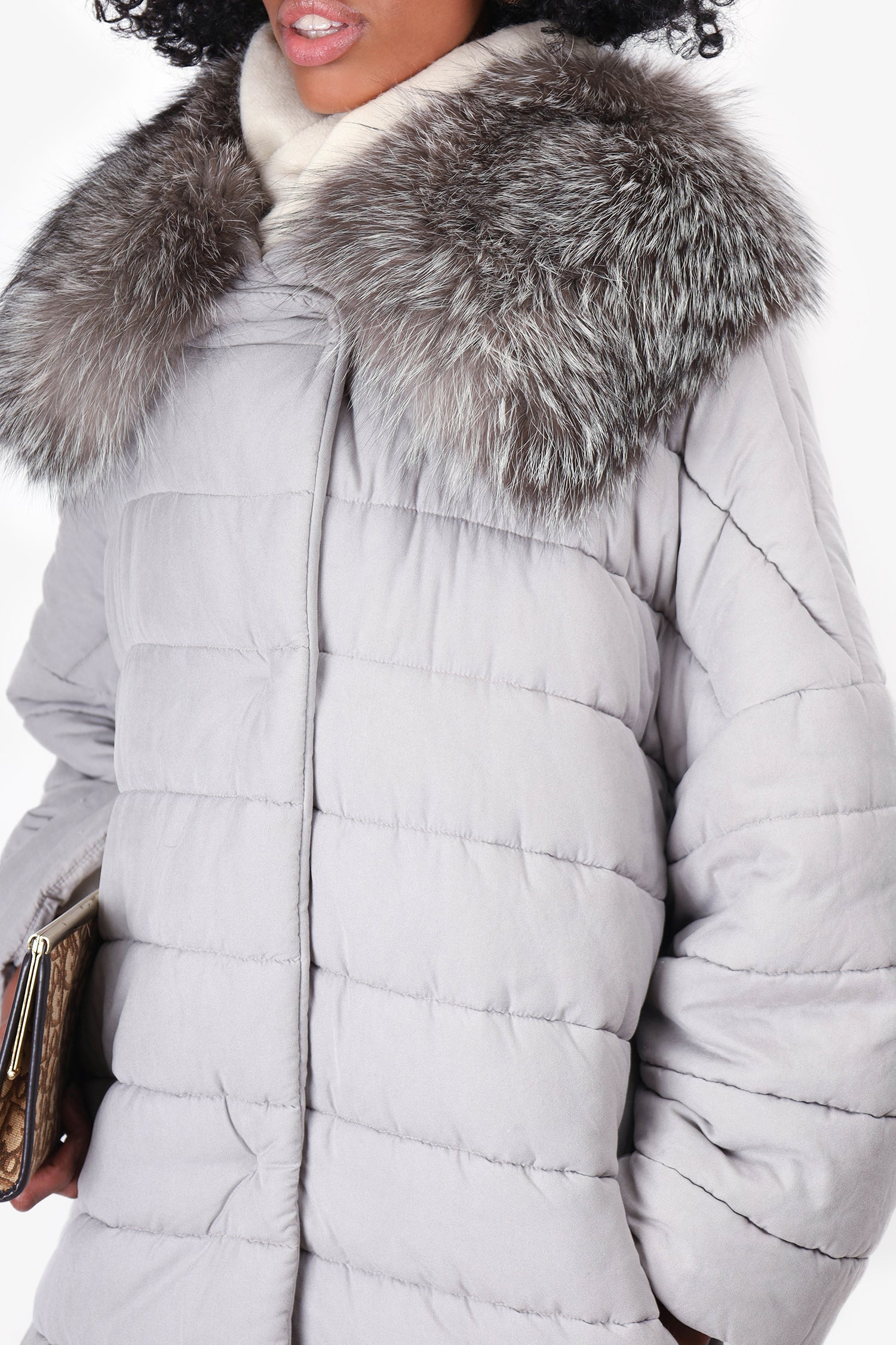Refresh availabilityMax Mara Grey Long Puffer Jacket with Fur Collar. Detachable fur collar. Snap button front closure. Two side zip closure pockets. Lined. Tonal stitching.
