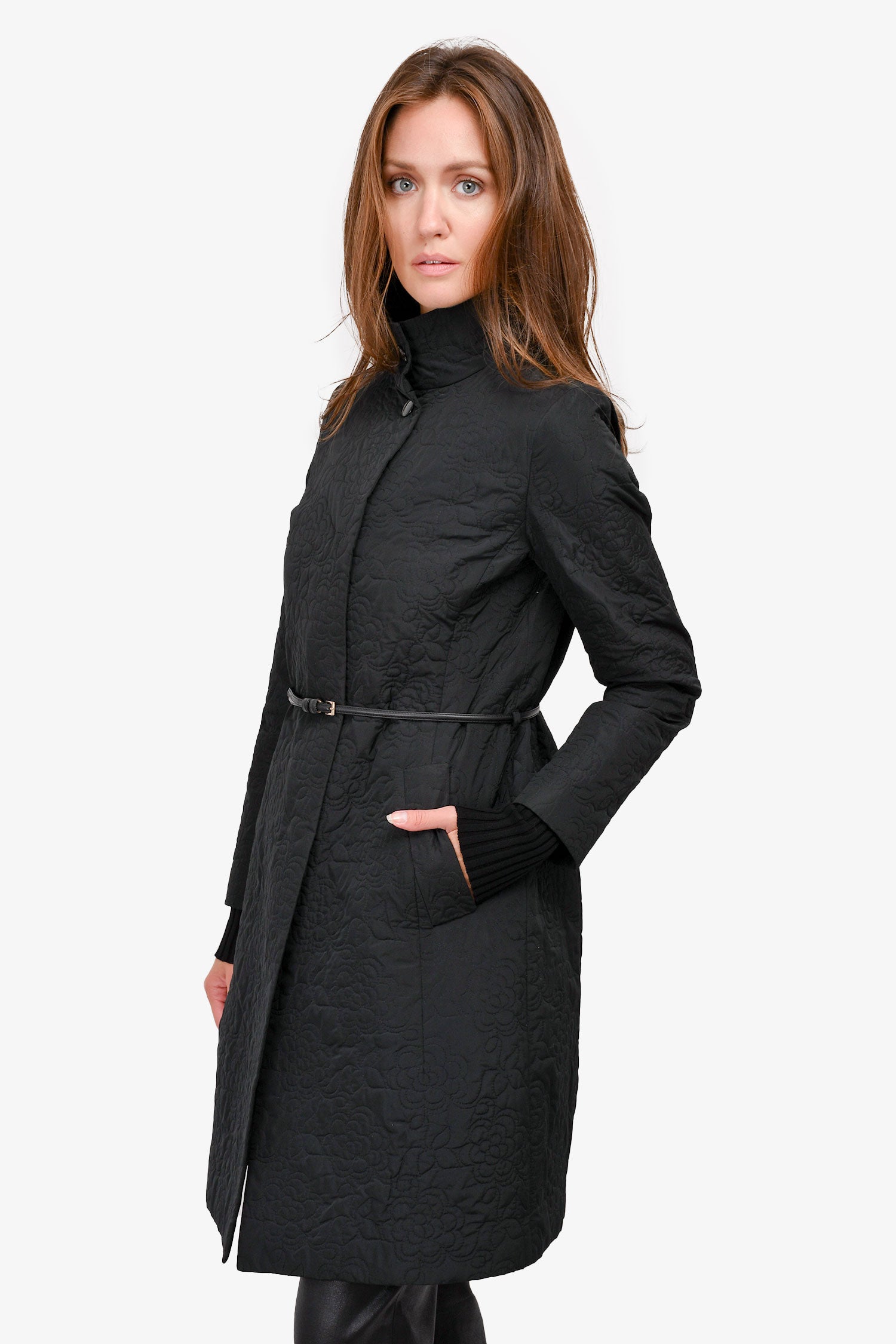 Refresh availabilityMax Mara Studio Black Floral Quilted Coat with Thin Leather Belt. Front snap button-up closure. Front pockets. Unlined.