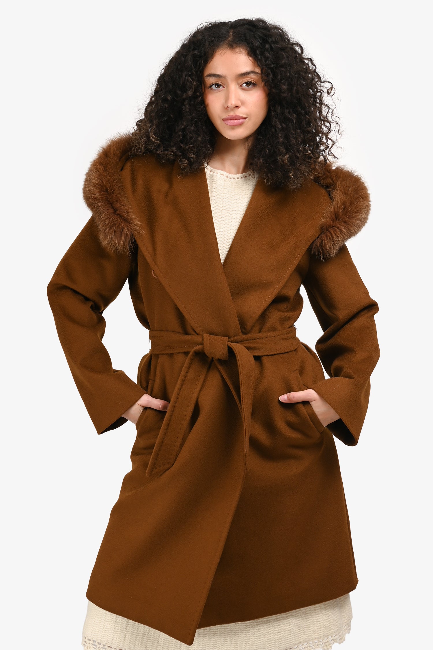 Max Mara Studio Brown Wool Fur Hooded Belted Midi Coat Size 8