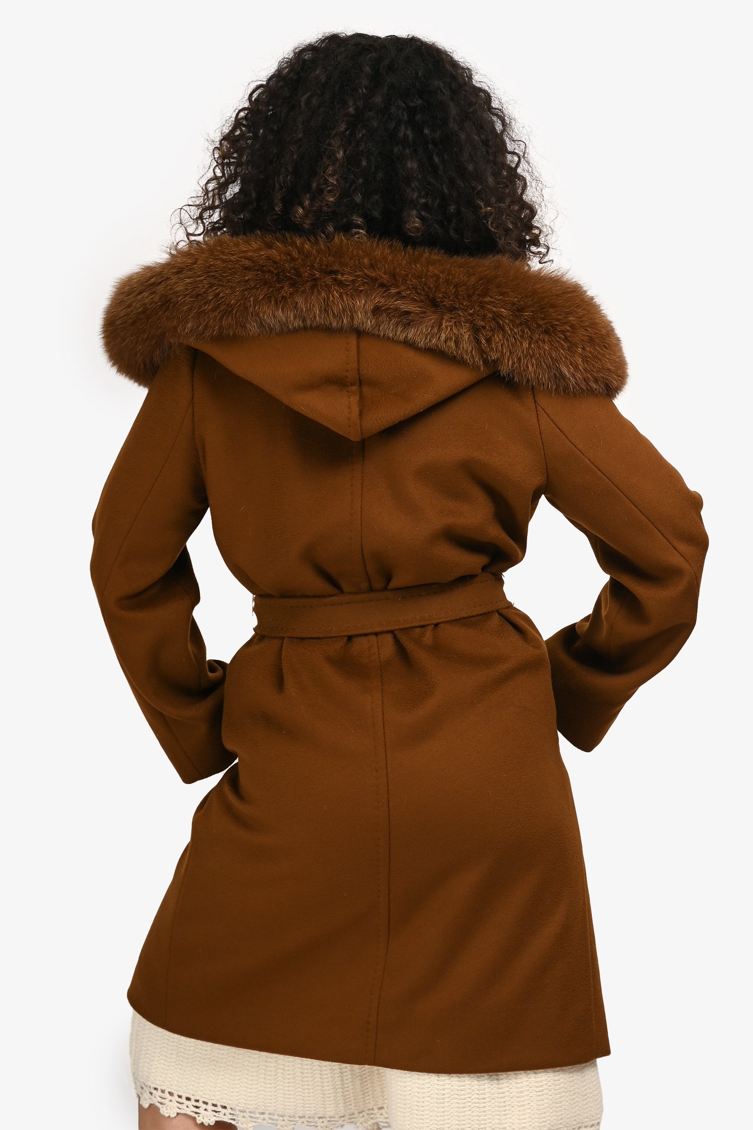 Refresh availabilityMax Mara Studio Brown Wool Fur Hooded Belted Midi Coat. Pull-on. Hooded neckline with detachable fur trim. Detachable waist belt. 2 exterior slip pockets. Lined interior. Tonal stitching.