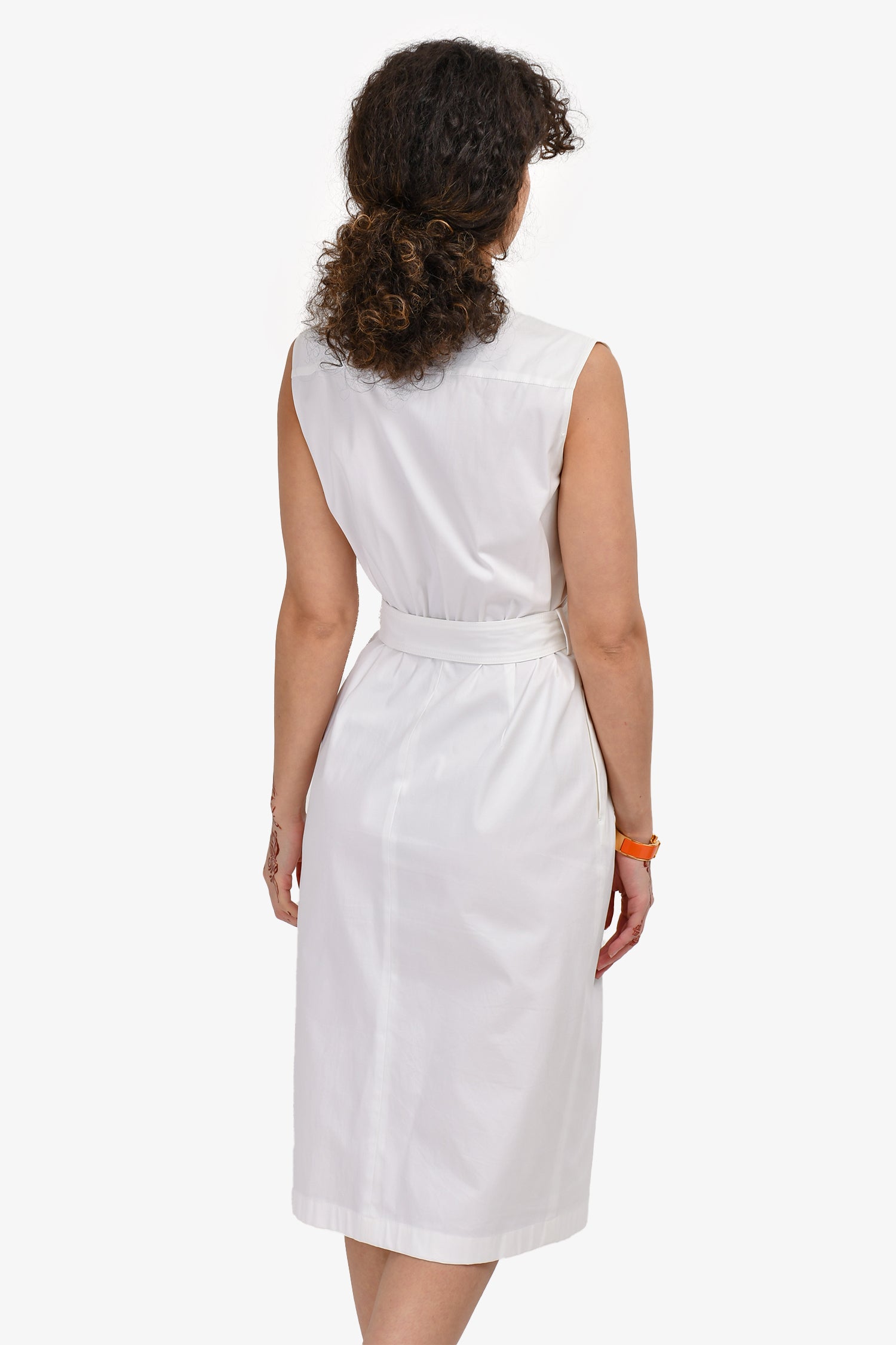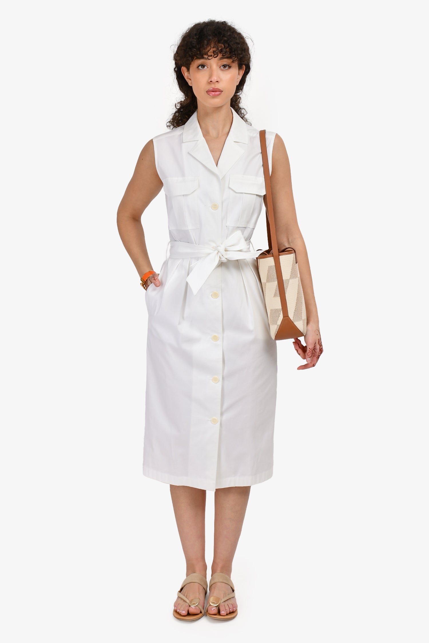 Refresh availabilityMax Mara White Cotton Button Down Belted Sleeveless Dress. Front button-up closure. Two top front pockets with flap over closure. Tonal attachable belt to style. Two side slip pockets. Unlined Tonal stitching.