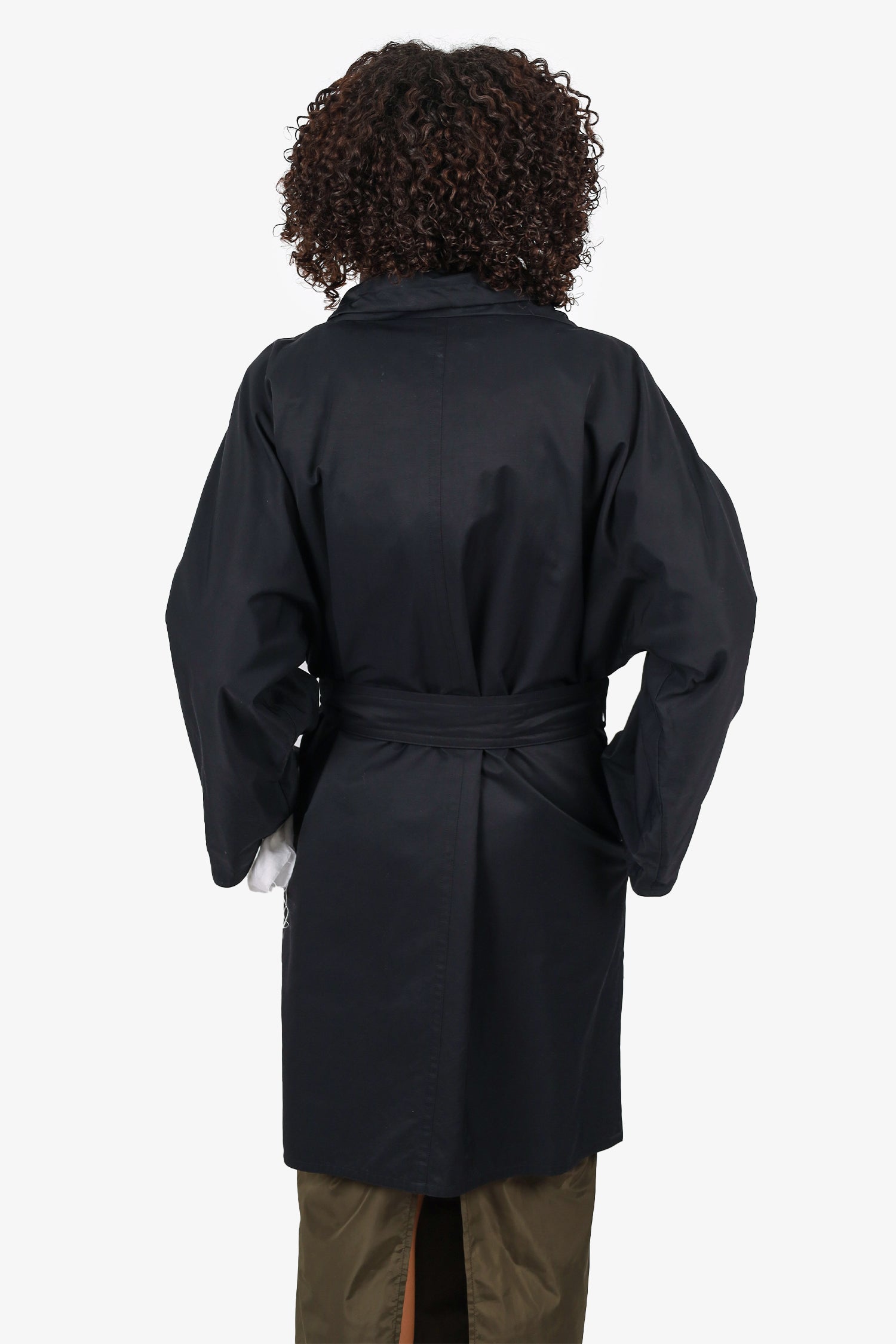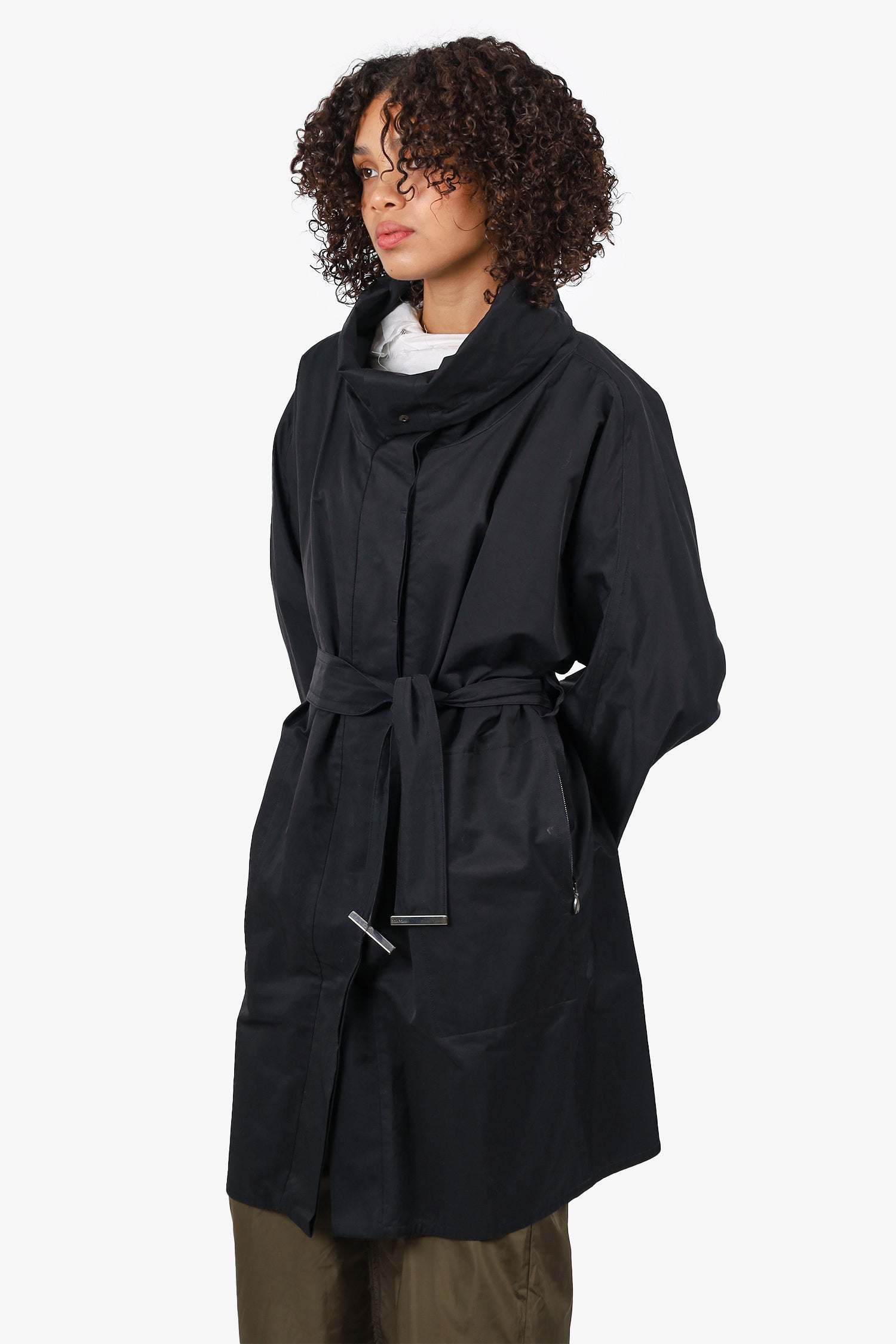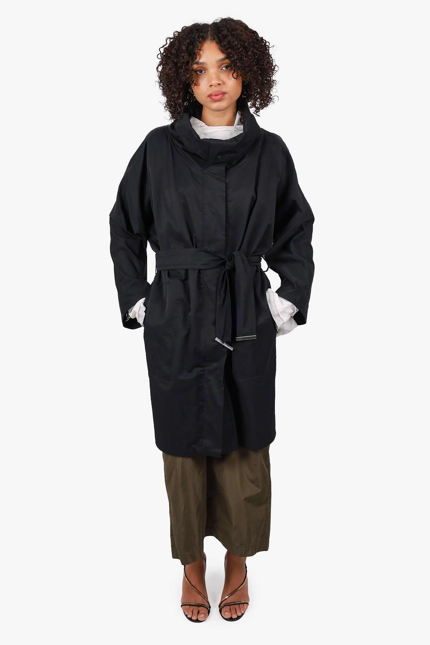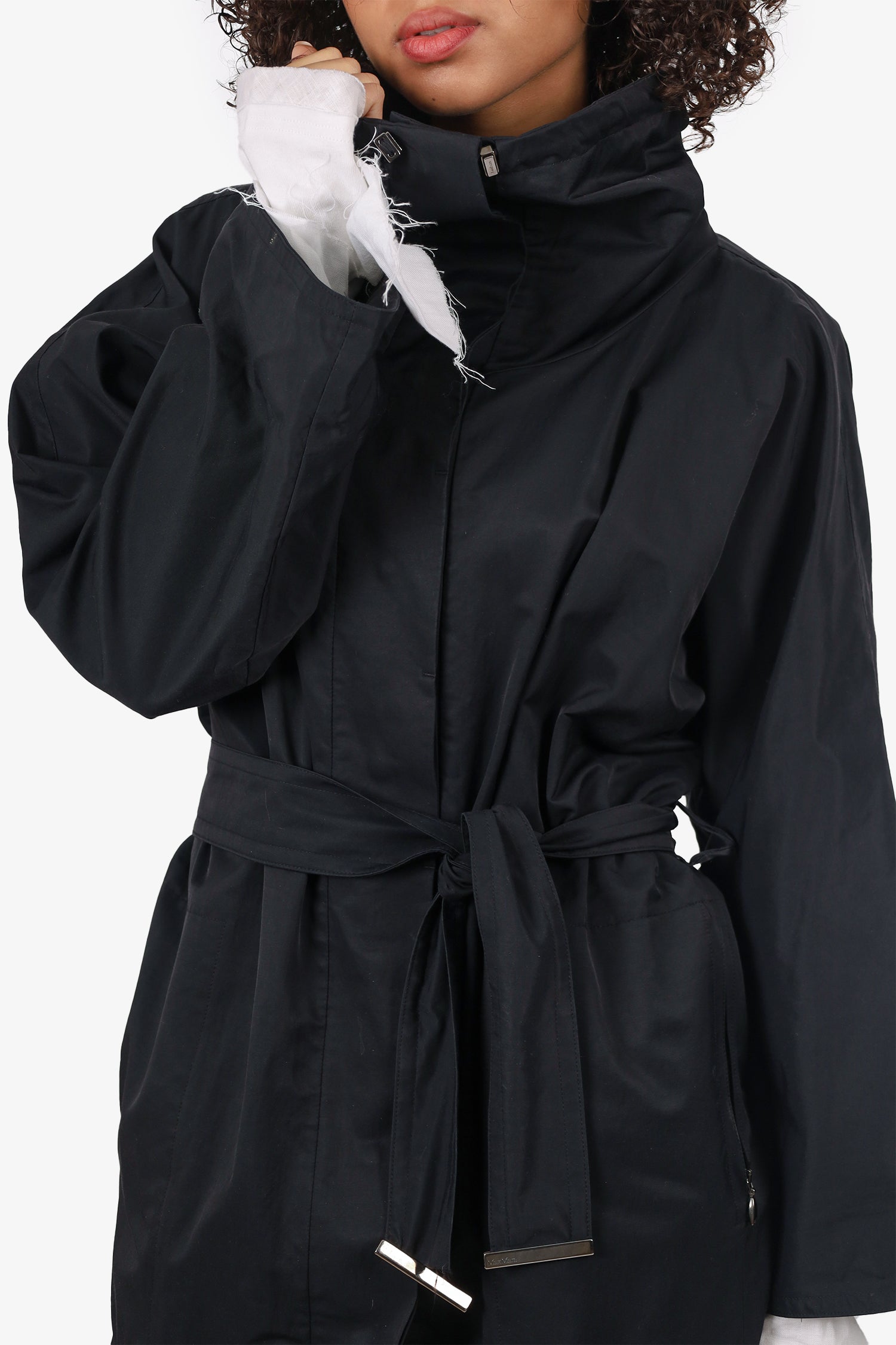 Refresh availabilityMaxMara Rainwear Black Trench Coat. Adjustable collared-neckline with bungee-draw cord closure. Front snap-button-up closure. 2 front exterior zip pockets; single interior pocket with snap-button closure. Removable belt at waistband with tie-up closure. Lined interior.Silver-tone hardware. Tonal stitching.
