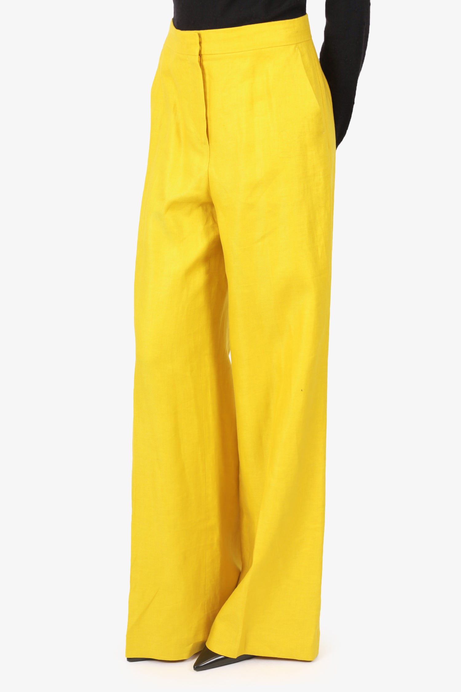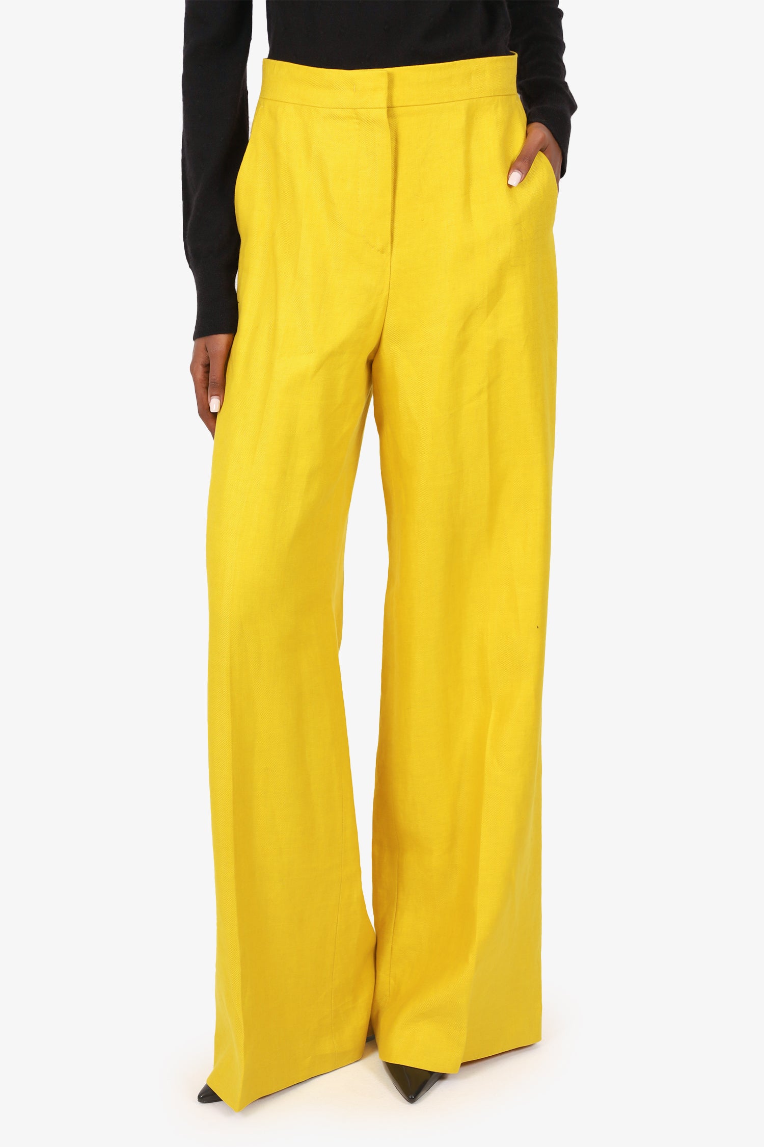 Refresh availabilityMaxMara Yellow Linen Wide Leg High Waisted Trousers. Slip on. Front zip with button-up and hook closure. 2 exterior side slip pockets. Silver-tone hardware. Tonal stitching.